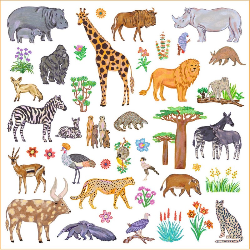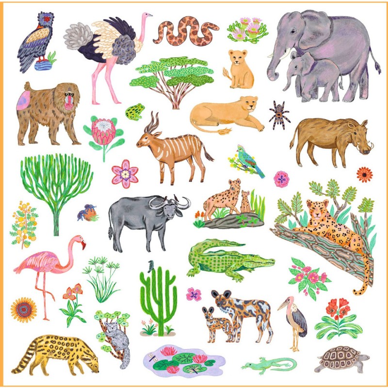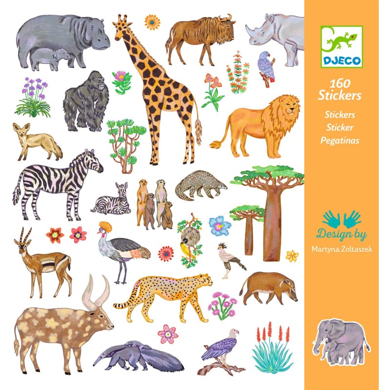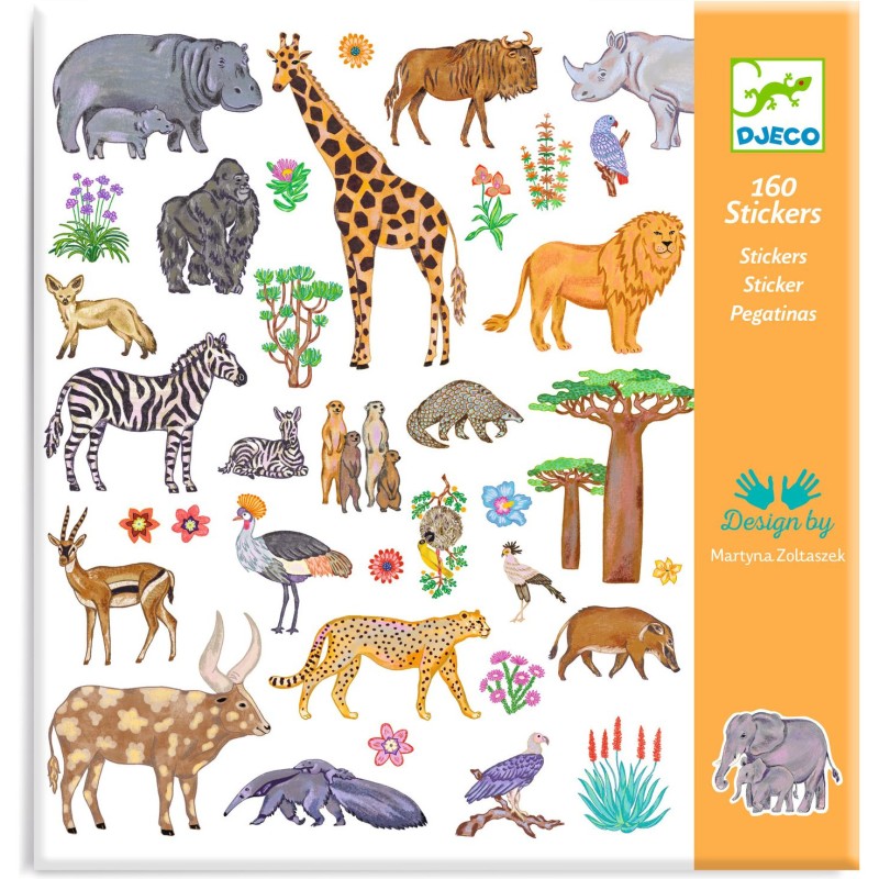 Une pochette de 160 stickers sur le thème des animaux d'Afrique. Des plus incontournables lion, zèbre ou éléphant aux moins connus touraco, bongo ou watusi, l'enfant découvre la richesse de la faune et de la flore africaine. Il colle librement les stickers pour créer des scènes exotiques, ou s’en sert pour décorer ce qu’il souhaite !