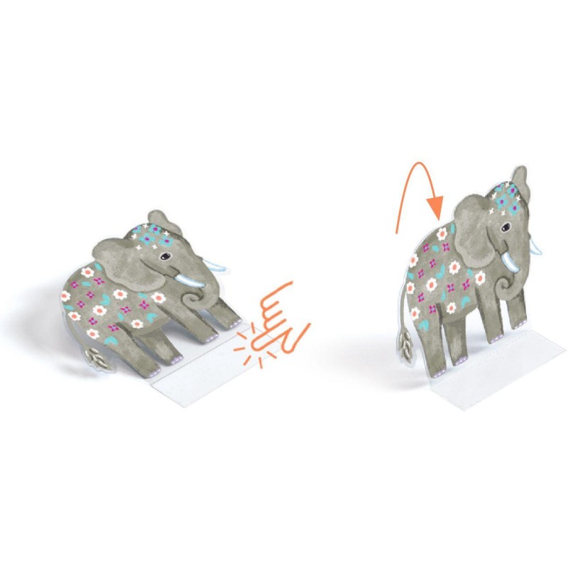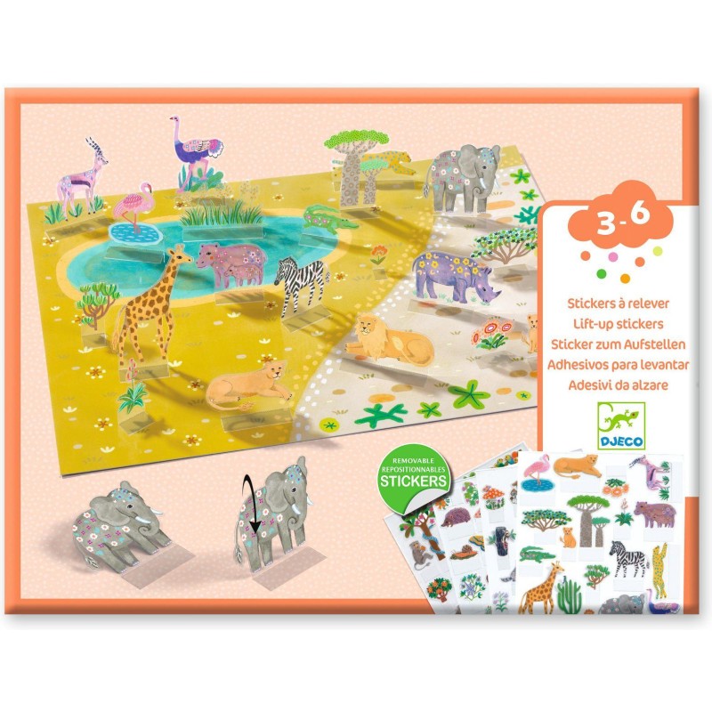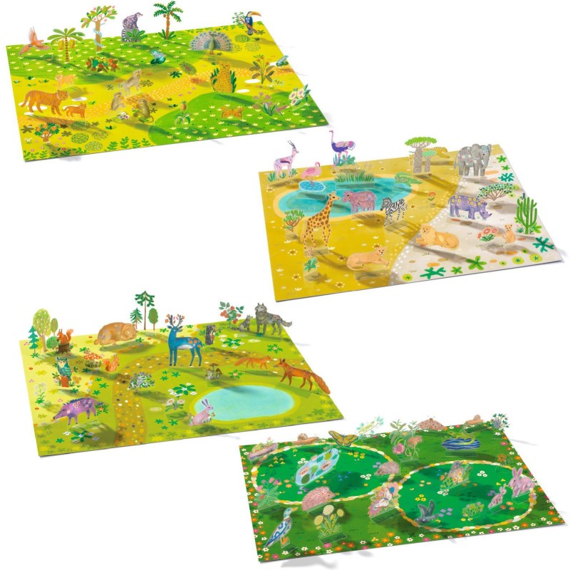 L’enfant colle les autocollants repositionnables sur les grandes images, puis les relève un à un… pour créer des scènes en volume, et s’inventer des histoires à l’infini !