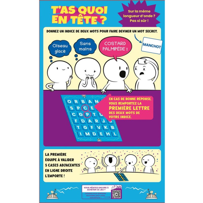 Découvrez un jeu d'ambiance autour des mots, parfait pour les soirées en famille ou entre amis. Faites deviner un mot à vos cooéquipiers à partir de 2 mots indices qui commencent chacun par une lettre différente disponible sur le plateau. Vocabulaire, complicité et imagination seront les maîtres mots pour réussir à trouver ce que l'autre a en tête. Vous pouvez jouer par équipes, en mode coopératif ou compétitif. Dans les deux cas, vous commencez par mélanger les tuiles lettres pour les placer sur une grille de 6x6. Puis retournez une carte "mot" au hasard. En mode coopératif, un joueur sera le chercheur, les autres devront lui faire deviner le mot. Pour cela, discutez pour choisir un ou deux indices commençant par des lettres encore visibles sur le plateau de jeu. Croisez-les doigts pour que le chercheur trouve le bon mot à partir de vos indications. Retournez les lettres concernées s'il y parvient. Sinon, enlevez-les ! Puis continuez la partie, forcément, ça se complique car il y a de moins en moins de lettres disponibles. Pour gagner, essayez de retourner 5 tuiles lettres pour former une ligne. En mode compétitif, on constitue 2 équipes. Il faut être l'équipe la plus rapide pour attraper la carte en premier et proposer 2 indices à son chercheur (toujours sur le même principe, les 2 indices devront commencer chacun par 2 lettres disponibles sur le plateau). Soit le chercheur trouve le bon mot et son équipe remporte les lettres, soit il se trompe et les lettres vont à l'équipe adverse. Pour gagner, il ne faudra pas confondre vitesse et précipitation ! Contenu : 36 tuiles Lettre, 100 cartes, 1 plateau, 1 règle