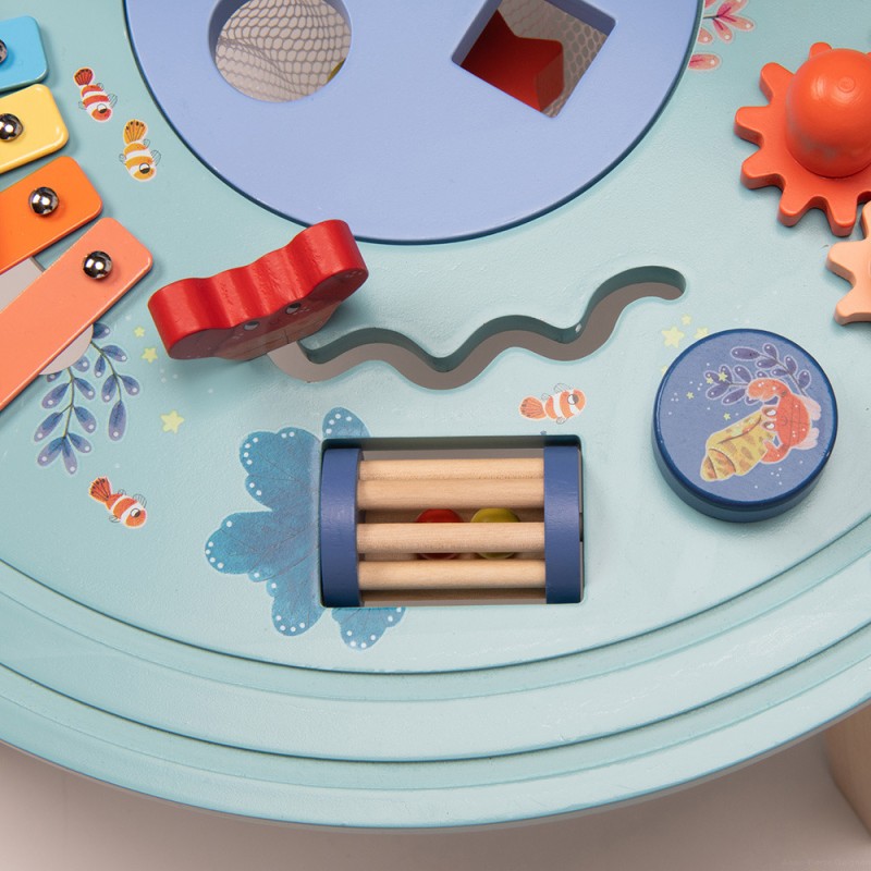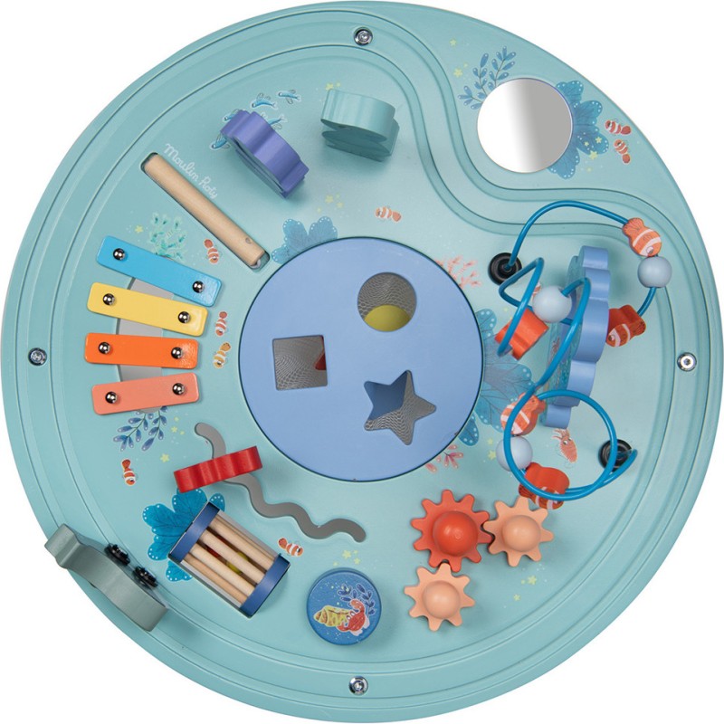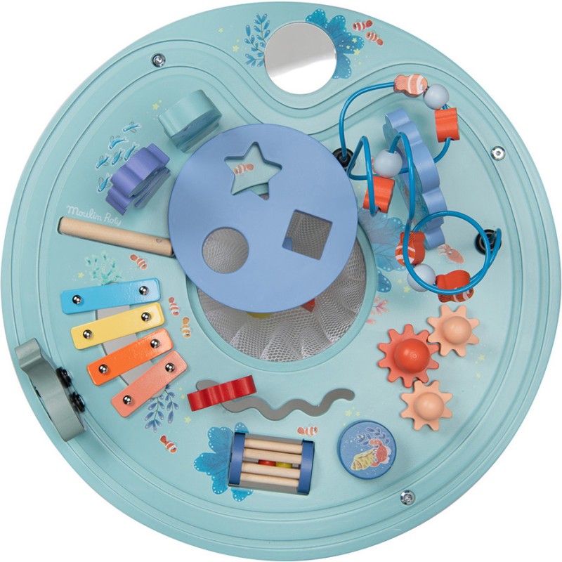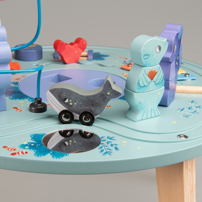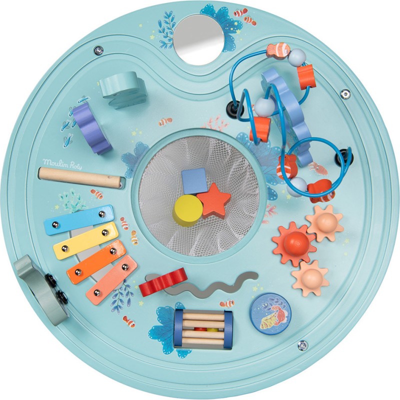 Looping avec les poissons clowns, circuit avec la baleine, zig-zag avec le crabe, de nombreuses surprises attendent bébé sur cette jolie table d'activité colorée... il y a même des petits poulpes à faire tourner, une otarie et un hippocampe