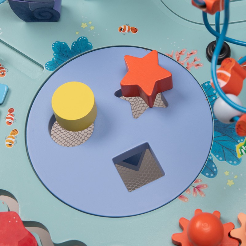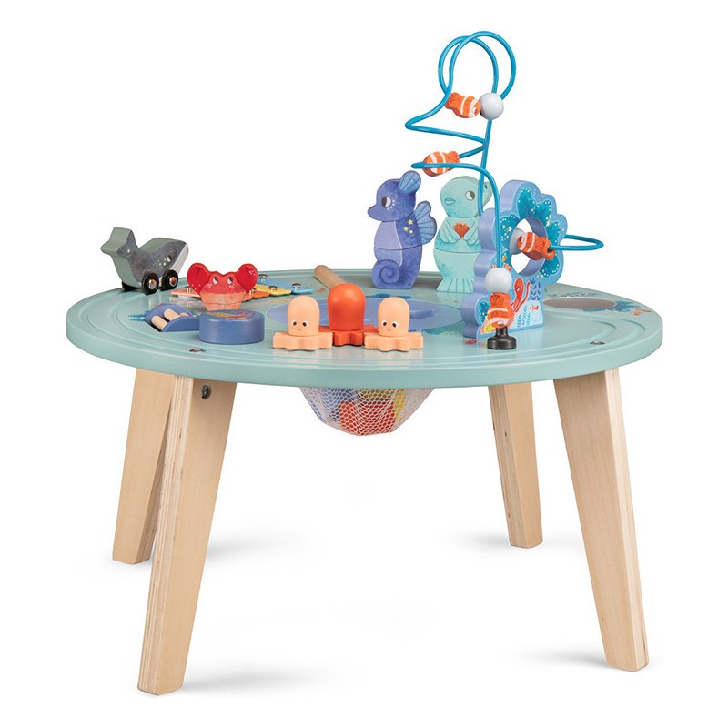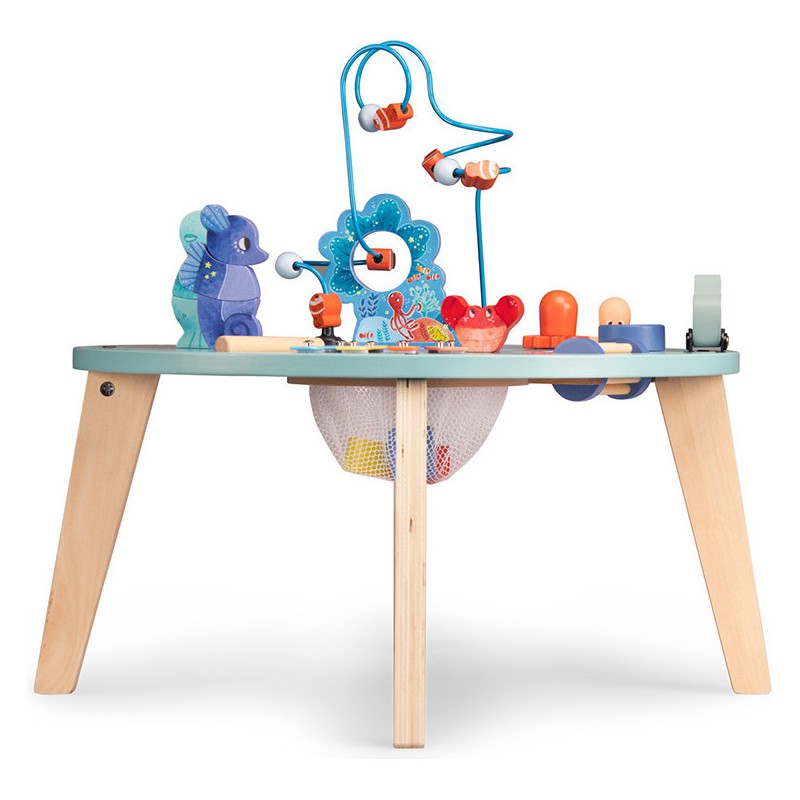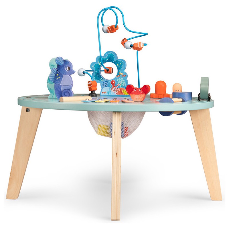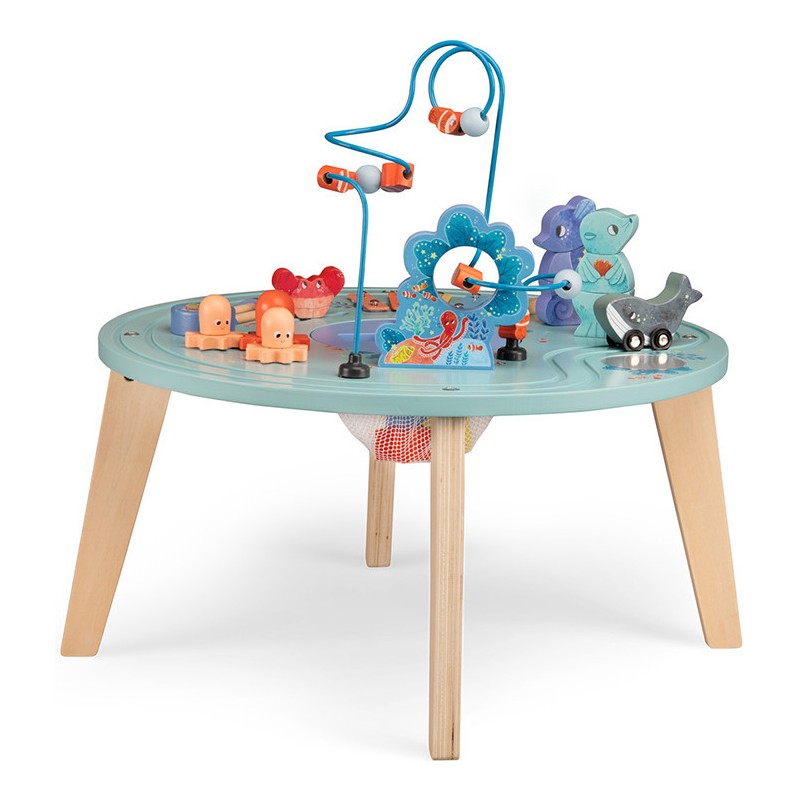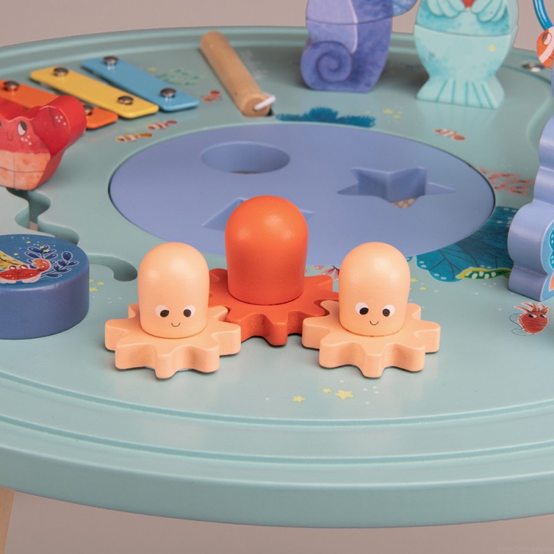 Looping avec les poissons clowns, circuit avec la baleine, zig-zag avec le crabe, de nombreuses surprises attendent bébé sur cette jolie table d'activité colorée... il y a même des petits poulpes à faire tourner, une otarie et un hippocampe