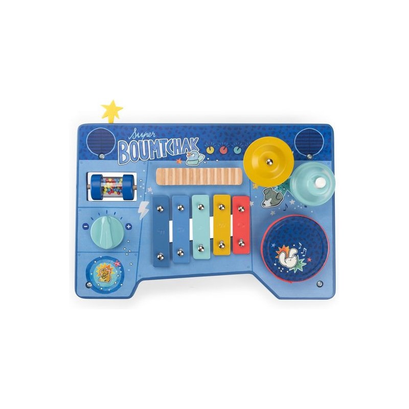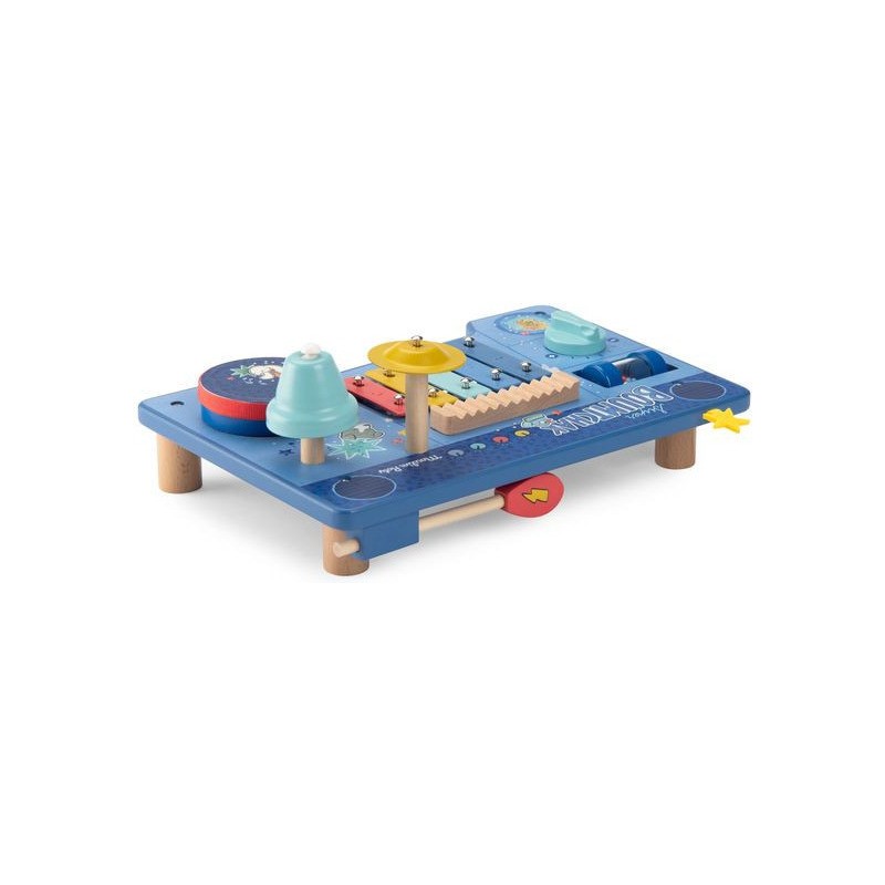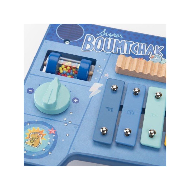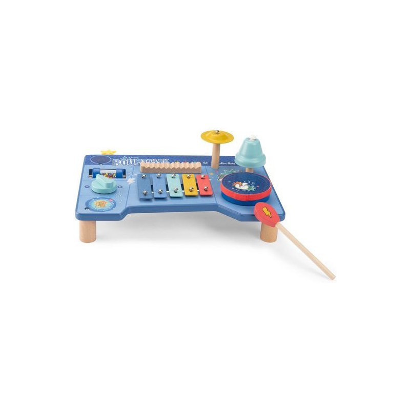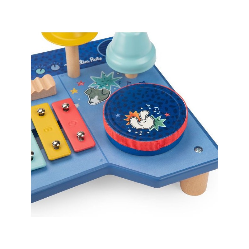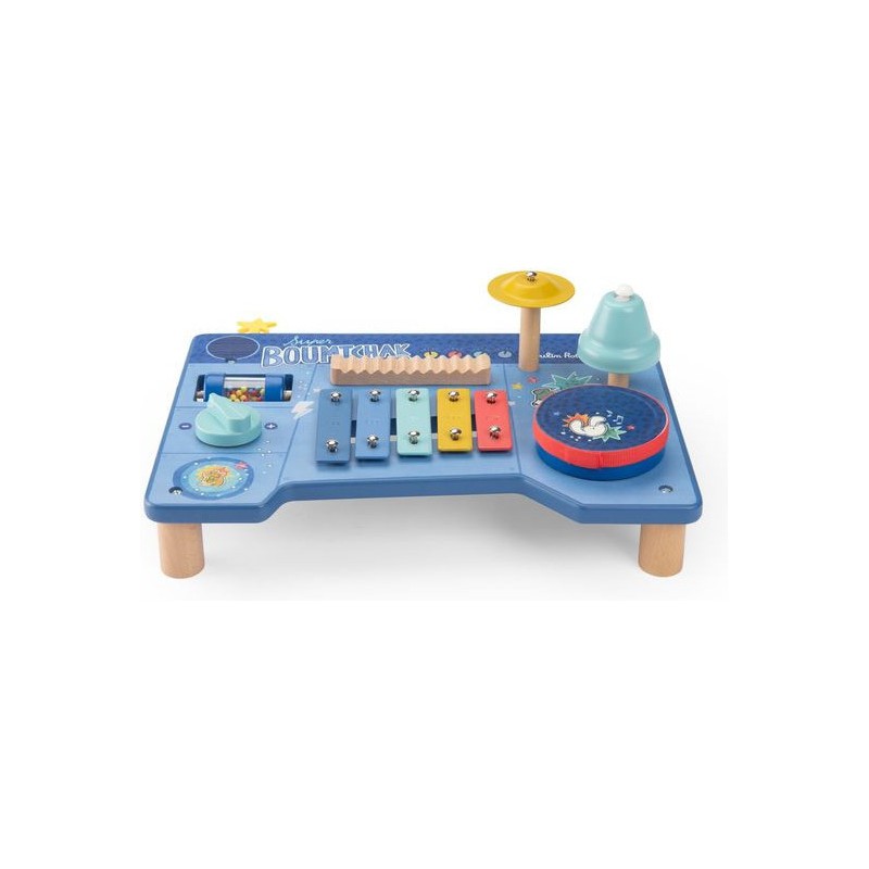 Le super boumtchak de Puce & Pilou est arrivé ! Taper sur le tambour, monter le volume, secouer les billes, faire tinter la cymbale…Une multitude d'activités à découvrir pour bébé. En bois et illustré, cette table musicale est facilement transportable.