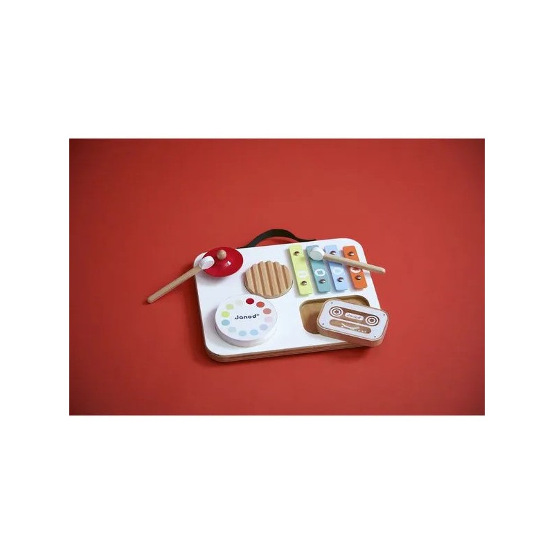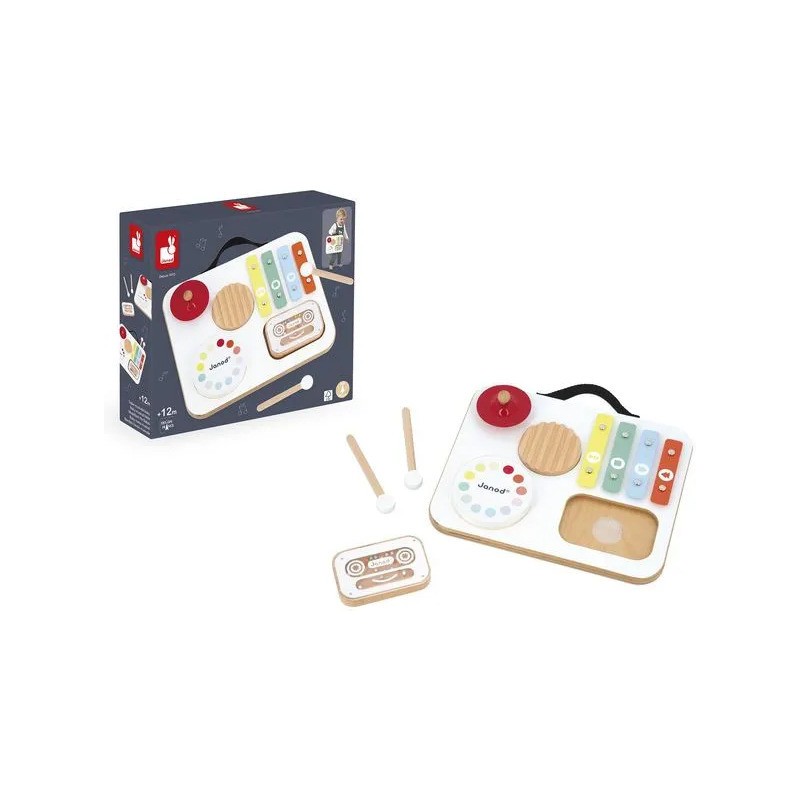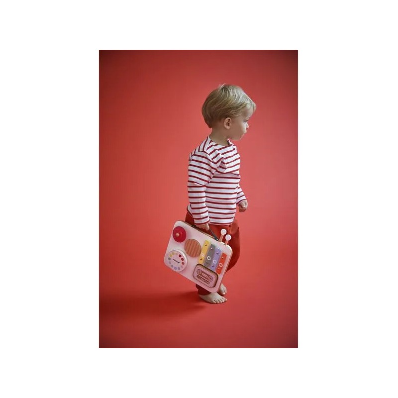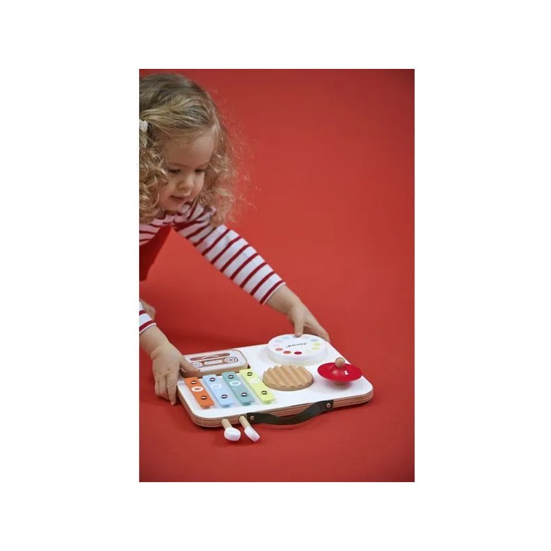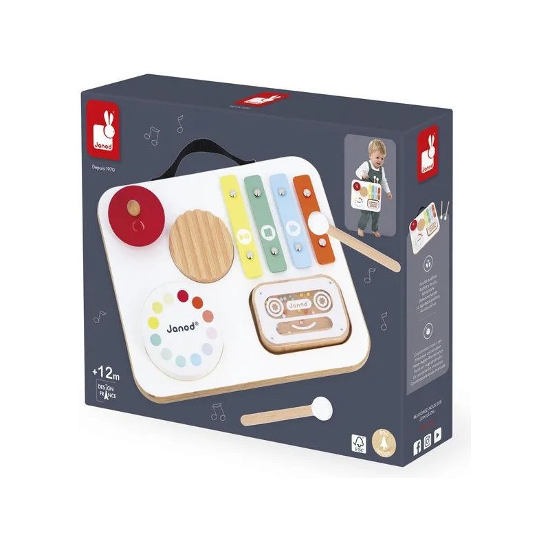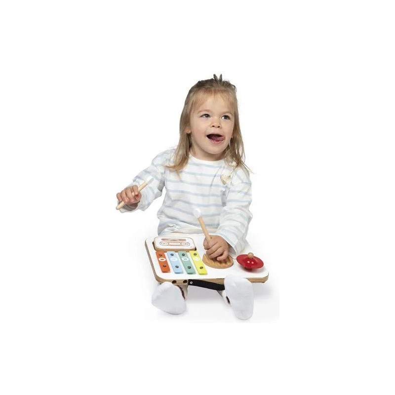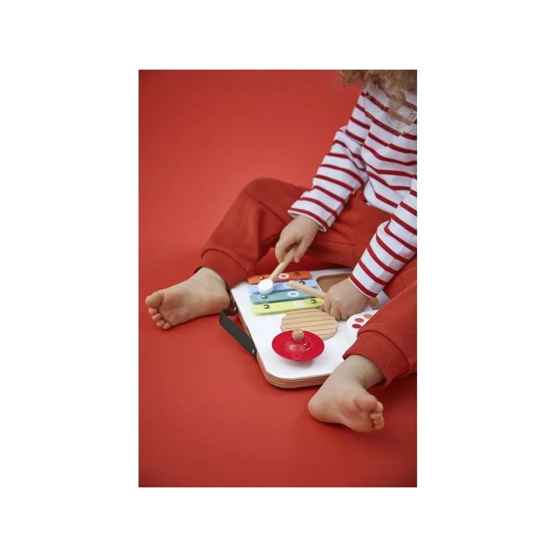 Attention les oreilles, bébé fait son show ! Voici une table musicale en bois aux couleurs attrayantes spécialement conçue pour les plus petits ! Parfaitement adaptée aux petites mains, elle regroupe divers instruments de musique avec lesquels les tout-petits à partir de 12 mois vont pouvoir s'amuser ! Elle est composée d'1 gratte-gratte, d'1 tambour, d'1 cymbale rouge, d'1 xylophone à 4 notes, d'1 cassette-hochet remplie de billes et de 2 baguettes. Grâce à un rangement malin sur le dessus de la table, ces dernières s'emportent facilement partout ! Cette table invite les tout-petits à explorer, taper, frotter, écouter… et surtout à s’émerveiller ! Elle stimule l'éveil musical, la motricité fine, la coordination et l’imagination. Un vrai terrain de jeu musical pour les premières improvisations ! Trop pratique, avec sa poignée et son petit format, elle peut suivre bébé partout ! Cette table musicale spéciale bébé fait partie de la gamme Confetti, une gamme complète de jouets d'imitation musicale avec des motifs Pop N' Rock ! Plein de couleurs et de joie, Les jouets musicaux Confetti permettent aux plus jeunes musiciens de s'initier aux joies de l'improvisation musicale. Ce jouet d'imitation musical est composé de bois Fsc™. Un, deux, trois... musique !