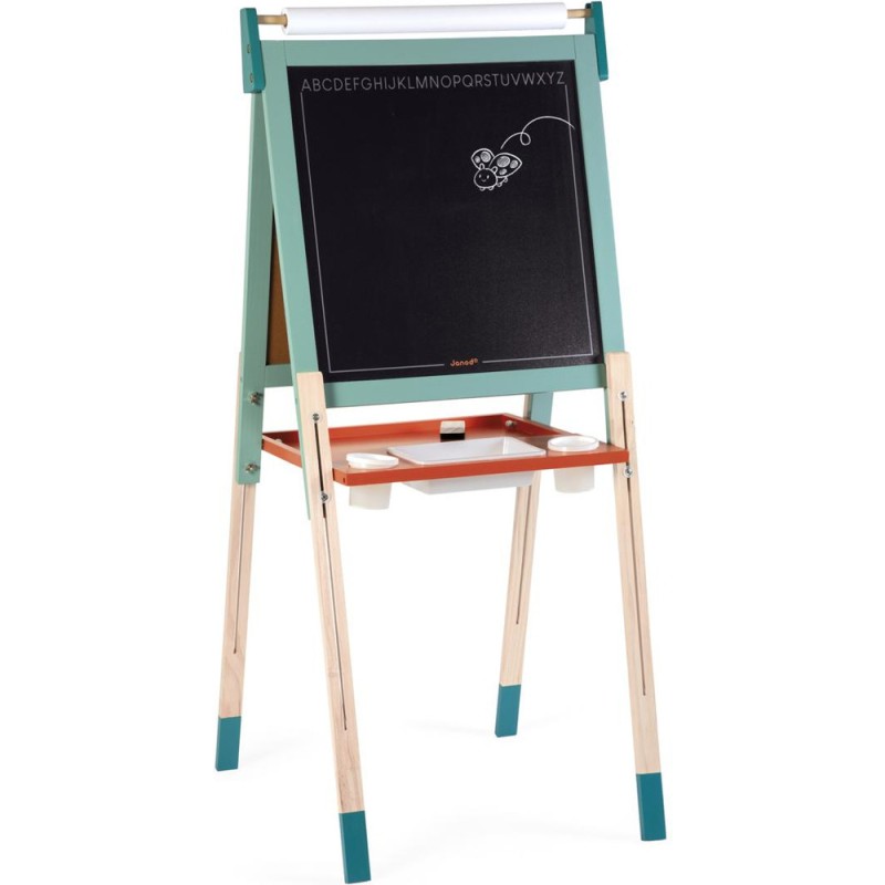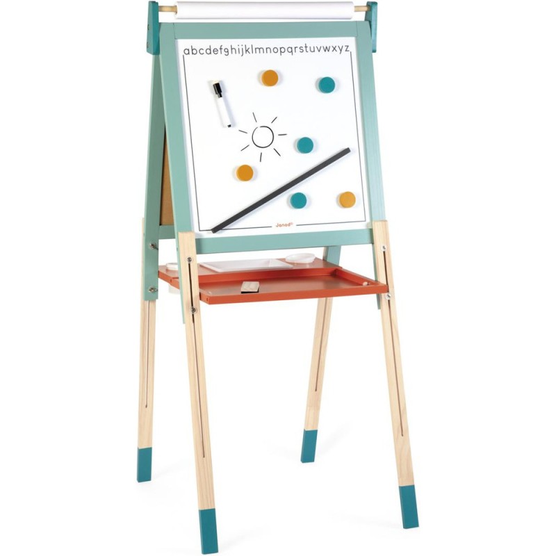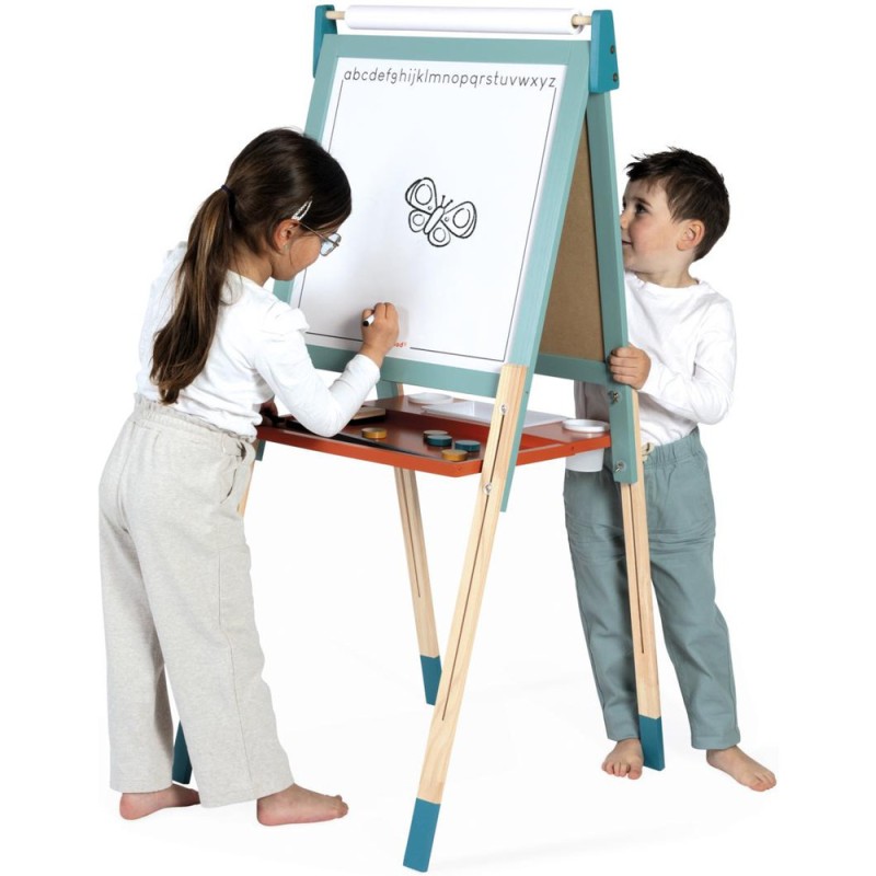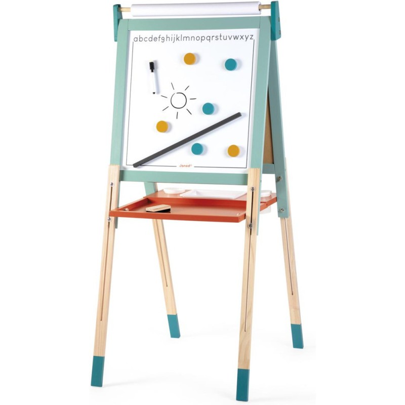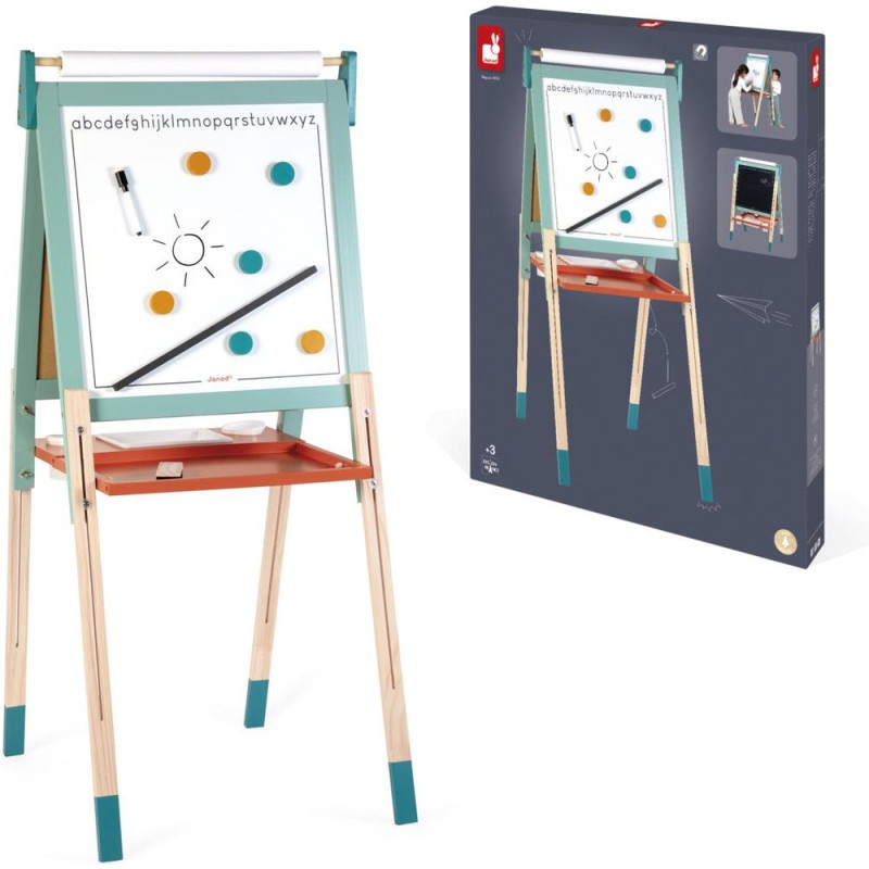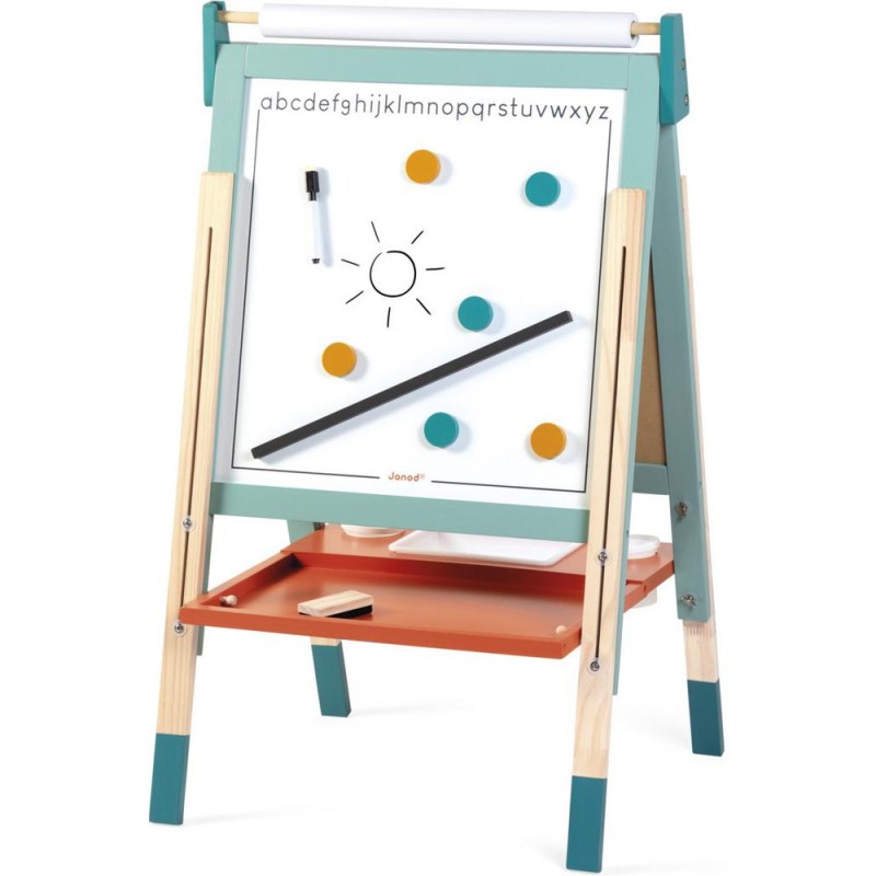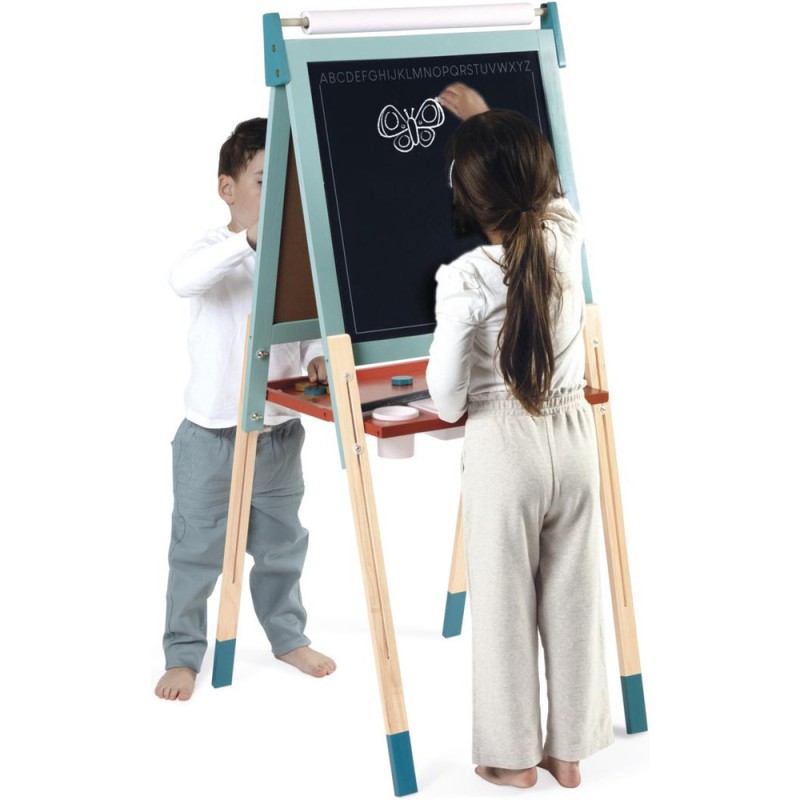 Un incontournable des chambres d’enfant, pour l'écriture ou pour le dessin : le tableau en bois, bien sûr ! À partir de 3 ans, l'envie d'écrire et de réaliser des dessins qui s’enrichissent de jour en jour est de plus en plus présente chez nos enfants : avec un tableau, ils vont pouvoir exprimer toute leur créativité ! Pour faciliter les réalisations et faire comme à l'école, rien de mieux qu'un tableau double-face où les tout-petits pourront tout autant se familiariser avec les feutres du tableau blanc qu'avec les craies du tableau noir ! La face blanche de ce tableau jouet est magnétique, ce qui permet de jouer également avec les 6 magnets ronds et la règle aimantée incluse. Les pieds de ce tableau pour enfant sont réglables de 91 à 126 cm pour leur permettre d'utiliser leur tableau pendant longtemps ! Pratique, le tableau est pliable pour un rangement facile. Un tableau pliable et réglable en hauteur, ça plaît aux plus petits comme aux plus grands ! Avec ce beau jouet, vous retrouverez : 6 magnets ronds de couleur, 10 craies colorées (blanc, jaune, vert, bleu, rouge et orange), 1 feutre effaçable à sec noir, 1 rouleau de papier, 1 brosse à tableau et 3 bacs de rangement en plastique. Grâce à tous ces accessoires et aux deux faces de ce tableau, plusieurs enfants pourront écrire et dessiner en même temps ! C’est idéal pour développer leur imagination et leur expression créative. Avec ses couleurs éclatantes, ses fonctionnalités ludiques et ses nombreux accessoires, ce tableau pliable saura trouver sa place dans une chambre d’enfant … Ou pourquoi pas dans le séjour ? Les recharges papier pour le tableau sont disponibles ici : J00012.