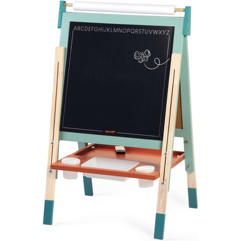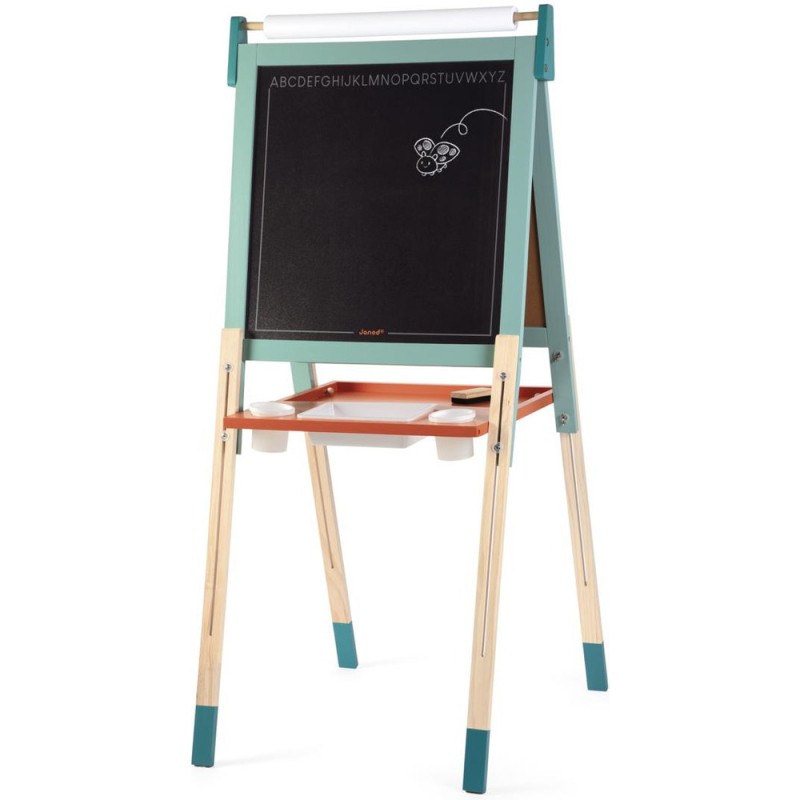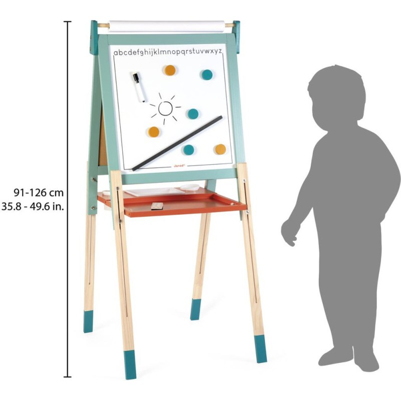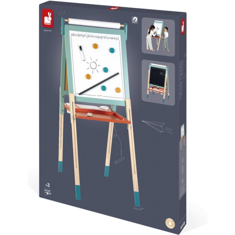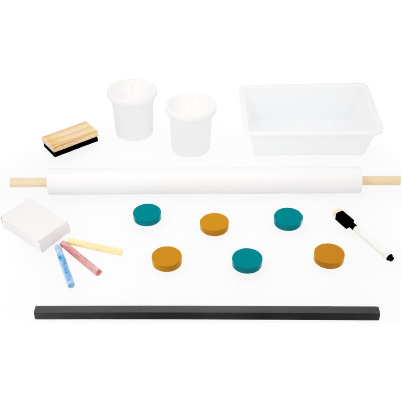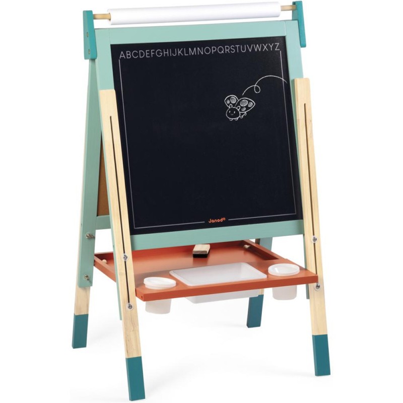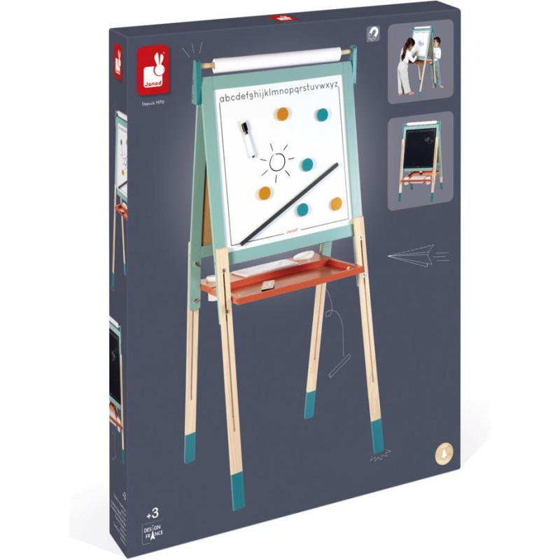Un incontournable des chambres d’enfant, pour l'écriture ou pour le dessin : le tableau en bois, bien sûr ! À partir de 3 ans, l'envie d'écrire et de réaliser des dessins qui s’enrichissent de jour en jour est de plus en plus présente chez nos enfants : avec un tableau, ils vont pouvoir exprimer toute leur créativité ! Pour faciliter les réalisations et faire comme à l'école, rien de mieux qu'un tableau double-face où les tout-petits pourront tout autant se familiariser avec les feutres du tableau blanc qu'avec les craies du tableau noir ! La face blanche de ce tableau jouet est magnétique, ce qui permet de jouer également avec les 6 magnets ronds et la règle aimantée incluse. Les pieds de ce tableau pour enfant sont réglables de 91 à 126 cm pour leur permettre d'utiliser leur tableau pendant longtemps ! Pratique, le tableau est pliable pour un rangement facile. Un tableau pliable et réglable en hauteur, ça plaît aux plus petits comme aux plus grands ! Avec ce beau jouet, vous retrouverez : 6 magnets ronds de couleur, 10 craies colorées (blanc, jaune, vert, bleu, rouge et orange), 1 feutre effaçable à sec noir, 1 rouleau de papier, 1 brosse à tableau et 3 bacs de rangement en plastique. Grâce à tous ces accessoires et aux deux faces de ce tableau, plusieurs enfants pourront écrire et dessiner en même temps ! C’est idéal pour développer leur imagination et leur expression créative. Avec ses couleurs éclatantes, ses fonctionnalités ludiques et ses nombreux accessoires, ce tableau pliable saura trouver sa place dans une chambre d’enfant … Ou pourquoi pas dans le séjour ? Les recharges papier pour le tableau sont disponibles ici : J00012.