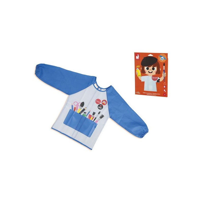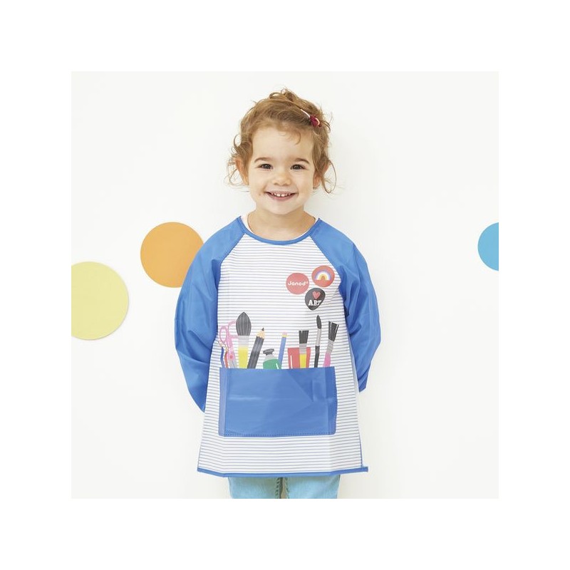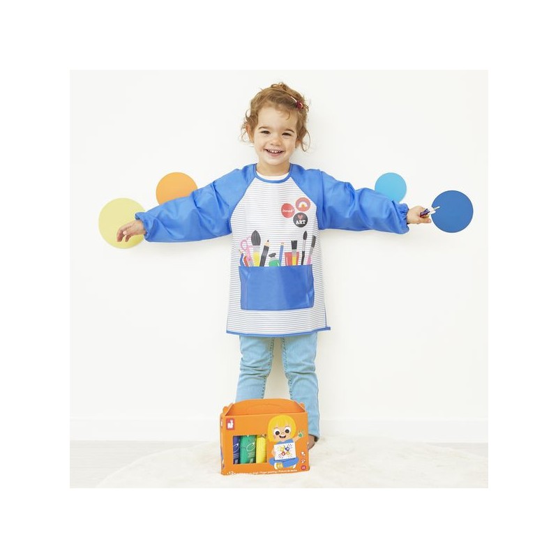On s’équipe pour l’atelier peinture ! Avec ce tablier de peinture, les enfants découvrent les joies de l’expression artistique sans tacher leurs vêtements, dès l’âge de 12 mois. Adapté jusqu’à 5 ans, et selon la taille de votre enfant, ce tablier mesure 90 x 47 cm. Indispensable pour se protéger et explorer sa créativité, ce tablier aux manches longues permet de peindre sans craindre les tâches. Facile à enfiler et à fermer grâce aux scratchs situés dans le dos, il s’adapte aux enfants mesurant 82 à 110 cm de haut. Fabriqué dans une matière souple (Eva et polyester), ce tablier de peintre est imperméable. Il offre une protection optimale et permet un nettoyage facile après chaque séance de peinture. En réalisant ses premiers tableaux, votre enfant commence à développer sa créativité, sa sensorialité et travaille sa motricité fine : un super moyen d’aborder l’expression créative tout en gardant ses vêtements propres, en prévision de ses prochaines réalisations. Place à la peinture en toute sérénité ! Ce tablier de peinture fait partie de notre gamme « Colo », une collection complète d’articles de coloriage, pour des moments créatifs hauts en couleur dès le plus jeune âge.