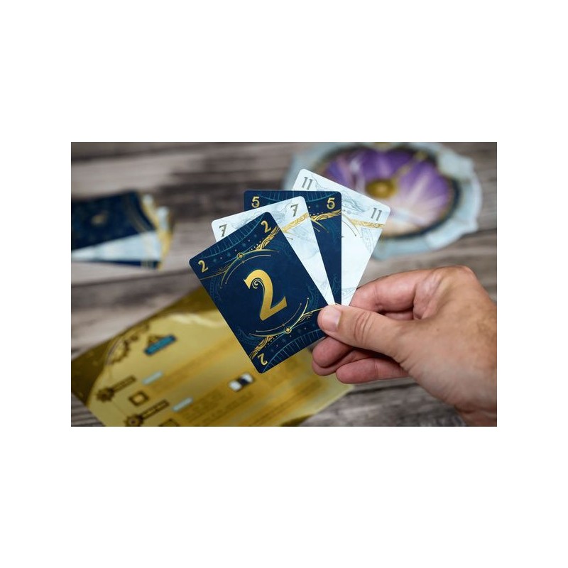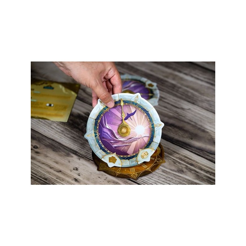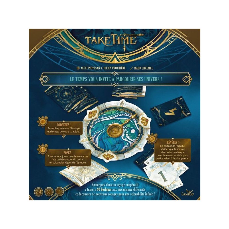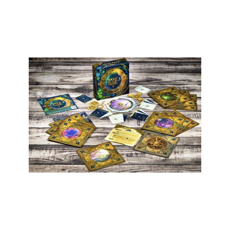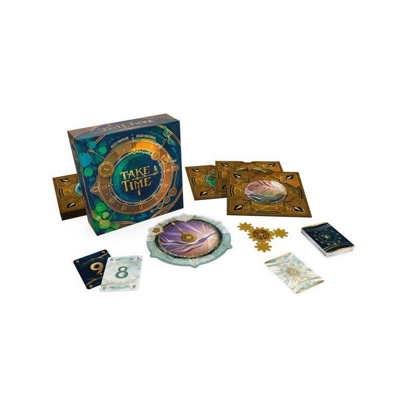 Prenez part à une aventure coopérative unique où chaque seconde compte. Dans Take Time, vous affrontez 40 horloges énigmatiques en équipe. Ouvrez l’une des enveloppes, retournez la première horloge, puis mélangez les 12 cartes Lune et les 12 cartes Soleil (numérotées de même manière) avant de les distribuer entre les joueurs. Attention, personne ne regarde ses cartes pour l’instant. Durant la première phase, les joueurs discutent entre eux pour élaborer une stratégie, afin de répondre aux exigences de chacun des six points de l’horloge qui accueilleront des cartes. Durant la phase Placement, les joueurs consultent leurs cartes et chacun leur tour, en posent une, face cachée, sur l’une des positions au choix. Mais attention, personne n’a le droit de communiquer durant cette phase. Enfin, durant la phase résolution, on révèle toutes les cartes et l’on vérifie que les exigences de chacun des six emplacements sont bien respectées, mais également que le total de la valeur des cartes soit croissant au fil des emplacements ! Si vous y parvenez, passez au défi suivant, sinon, recommencez, ou mettez ce défi de côté dans l'enveloppe des regrets, vous y reviendrez plus tard. Chacun des 10 chapitres, contenant 4 horloges, sont magnifiquement illustrés, et vous emmènent dans un voyage initiatique aux graphismes immersifs et aux défis variés. Contenu : 24 cartes, une aiguille d'horloge, 6 pions (rappel, bonus), 10 pochettes Chapitre contenant 4 horloges et 1 feuillet de règles chacune, 1 pochette de regrets, 1 pochette de renaissance.