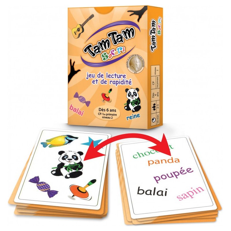 Un petit jeu de lecture et de rapidité. Il s'agit de retrouver la paire image-mot qui existe entre une carte-images et une carte-mots. Tam Tam Safari utilise les mots usuels pour l'étude des sons (o de robot,-de radis, a de ananas, u de lune). Il complète de façon ludique l'apprentissage de la lecture. Conforme aux Programmes de Primaire.