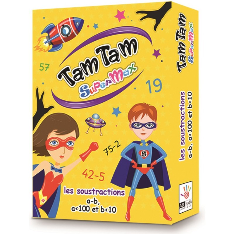 Tam Tam Supermax - Les soustractions a - b (Niveaux CE1 - CE2 - CM1 - CM2) Points forts : Une jolie boite colorée avec les super-héros SuperMax 2 séries de cartes Tam Tam : l’une avec les soustractions, l’autre avec les résultats 6 règles de jeux Tam Tam, une référence qui s’est imposée + de 1000 000 Tam Tam vendus à ce jour Médaille du Ministère de l’Education Nationale Médaillé du Concours Lépine International Prix du Handicap