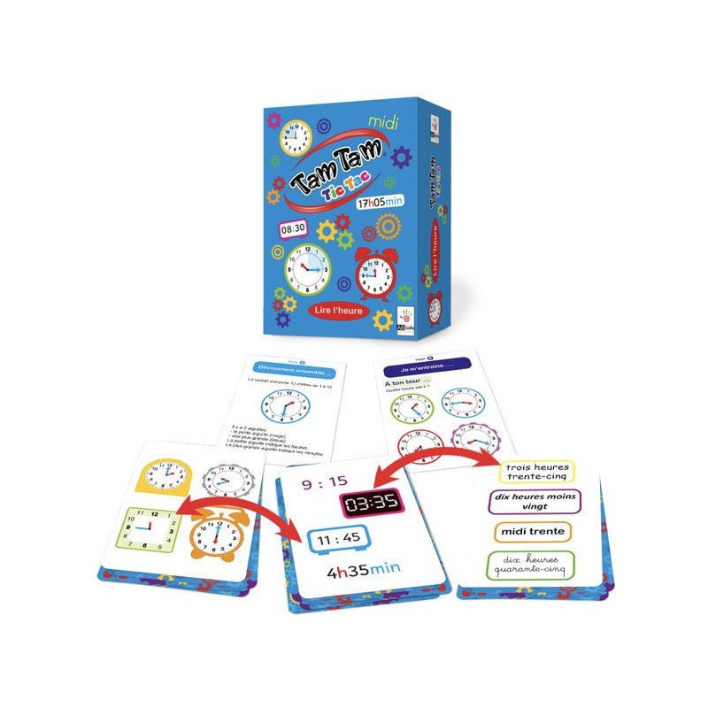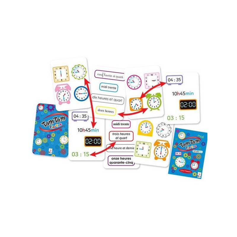 Tam Tam "Tic Tac" est une sélection de petits jeux pour jongler, s'entrainer à lire l'heure. Il faudra trouver la paire entre 2 cartes avec des représentations différentes : cadran, affichages digital ... Une méthode d'apprentissage de la lecture de l'heure est également proposée : - pas à pas (l'heure juste, lecture des minutes etc ...) - en 8 étapes simples