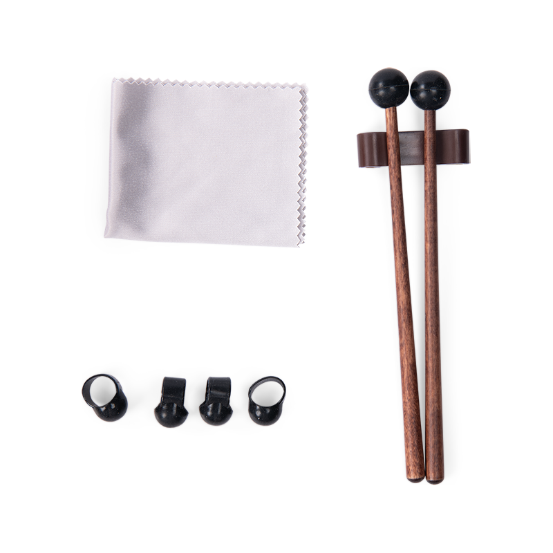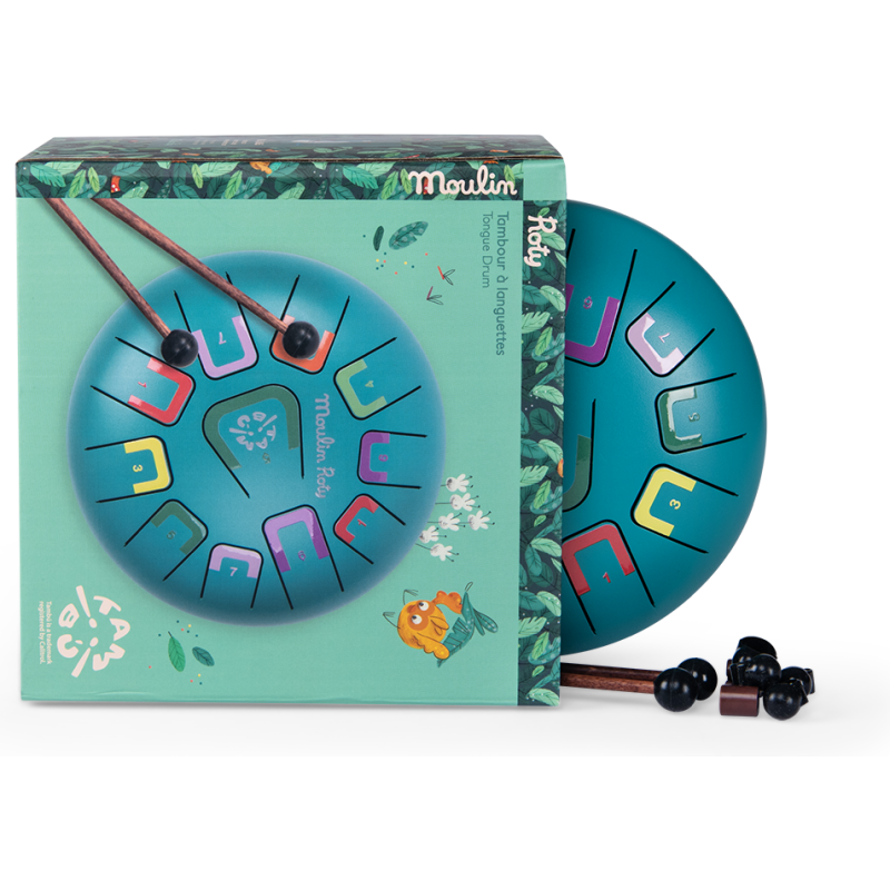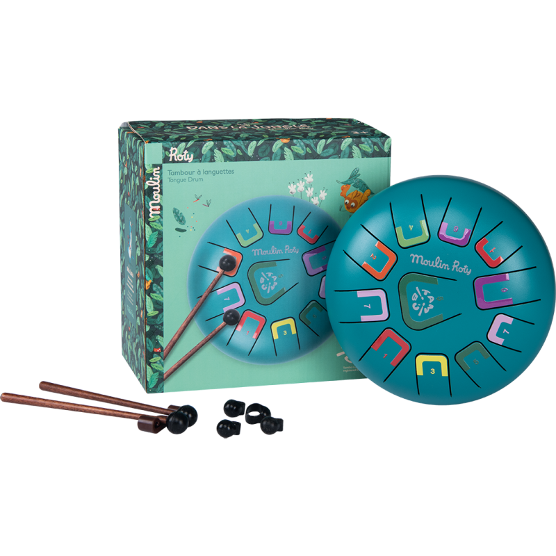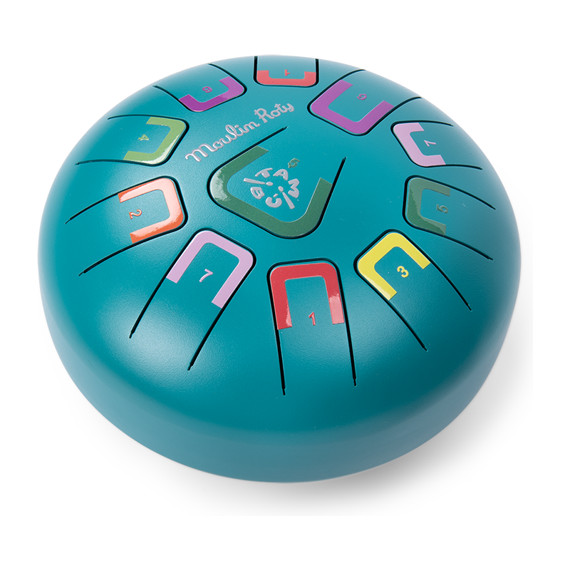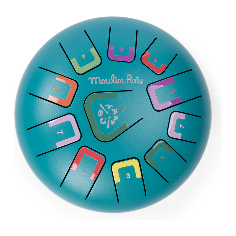 Instrument pour familiariser les enfants aux percussions. 11 notes indiquées par une couleur et un chiffre pour jouer avec les mains, le bout des doigts ou à l'aide de baguettes. Inclus sac de transport, livret de mélodies, 2 baguettes et 4 pics à doigts.