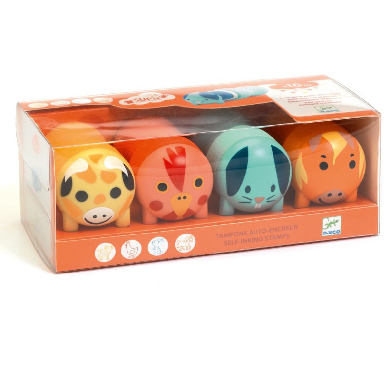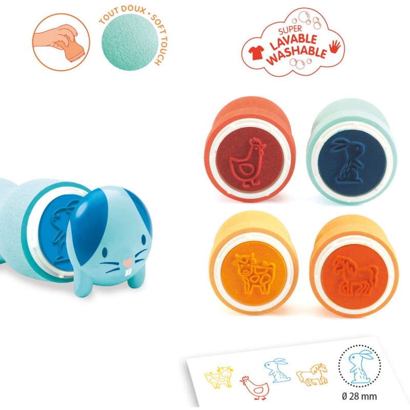 4 tampons ergonomiques et auto-encreurs créé par Djeco. Une poignée en mousse spécialement adaptée aux petites mains et des tampons auto-encreurs qui marquent bien.