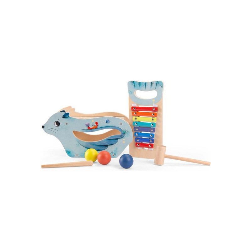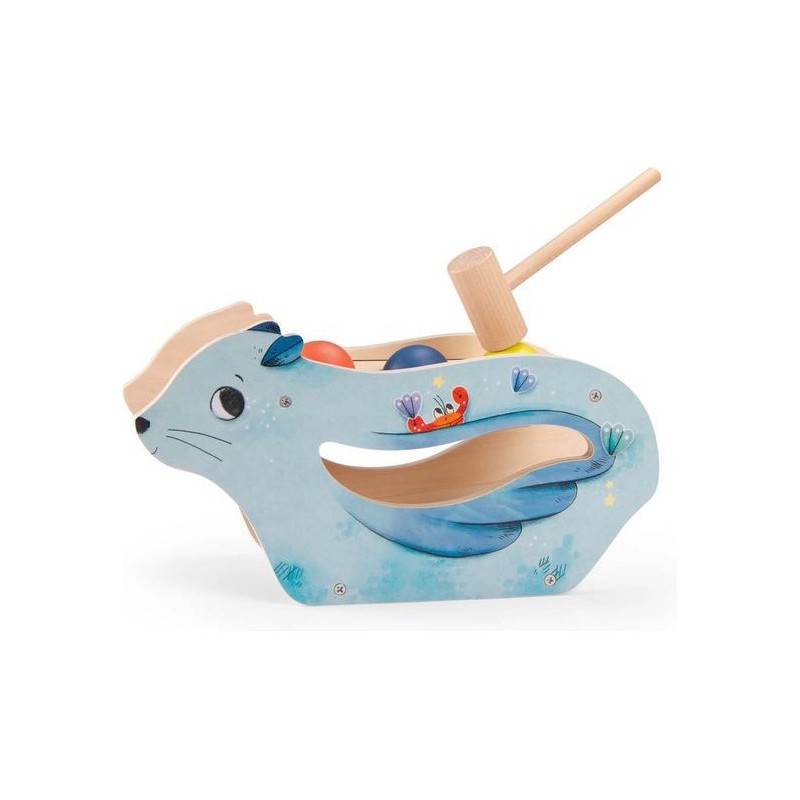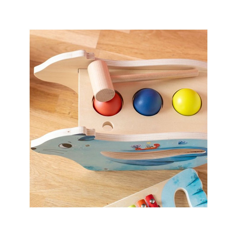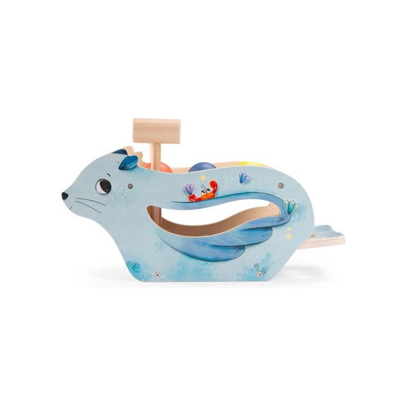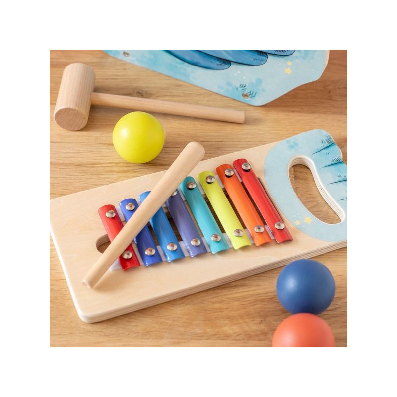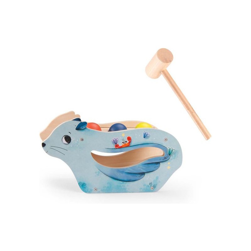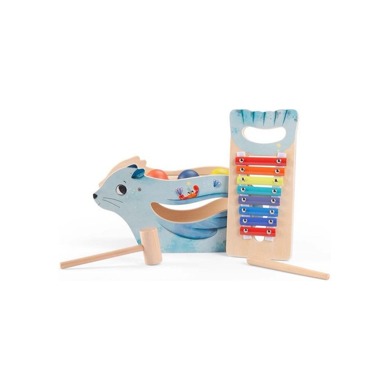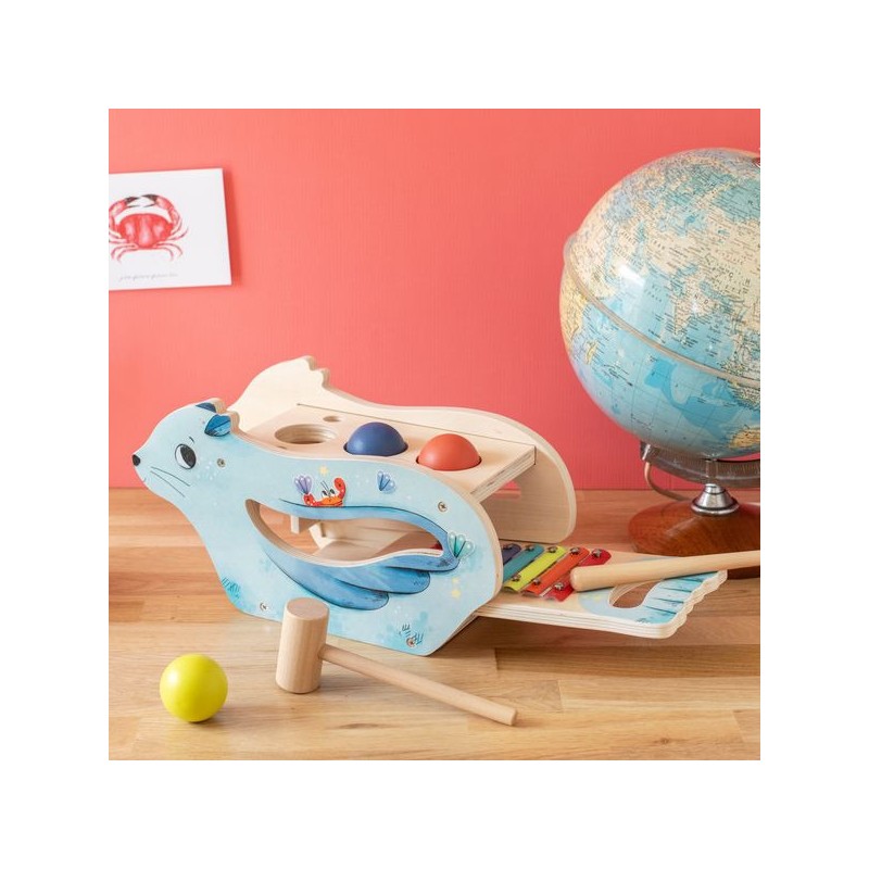 En avant la musique avec l'Otarie ! À l'aide du petit marteau, taper sur les boules de couleur. La chute de la boule sur le métallophone enclenchera une douce mélodie. 2 en 1 le métallophone est amovible pour pouvoir y jouer partout.