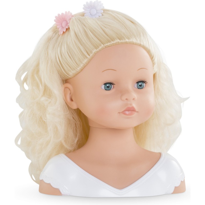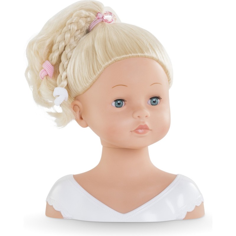 La Tête à Coiffer a la peau blanche, elle est en vinyle doux au toucher à la délicate senteur de vanille. Les yeux sont fixes avec des cils.