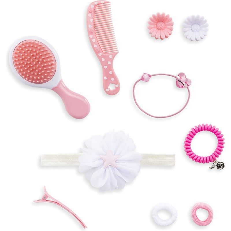 La Tête à Coiffer possède 10 accessoires réalistes (1 bandeau élastique blanc avec 1 fleur, 1 brosse à cheveux, 1 peigne, 2 petites pinces à griffes, 2 grandes pinces à griffes, 1 pince à cheveux plate, 1 élastique avec un cœur transparent et 1 élastique à spirale) pour créer de nombreuses coiffures !