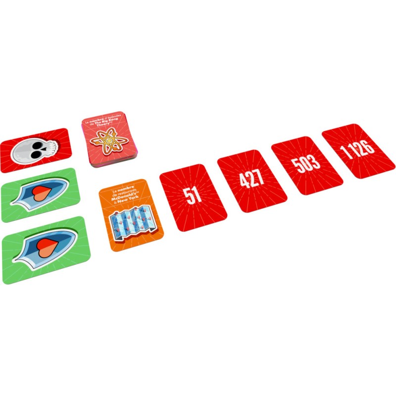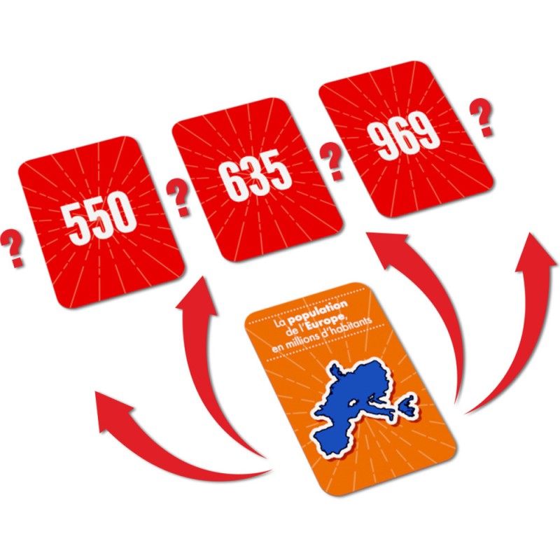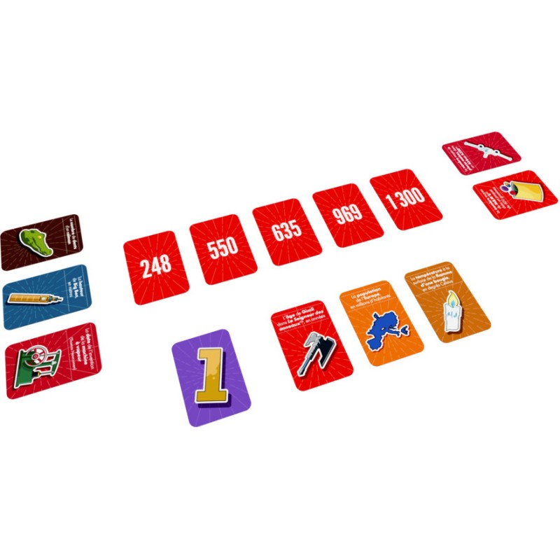 Le jeu de devinettes revient dans sa version la plus moderne avec The Line. Son petit format et ses petites cartes peuvent être emmenés partout. En tentant d'estimer les valeurs chiffrées de faits divers et variés, vous sollicitez votre culture générale et votre bon sens : tout le monde peut jouer ! Tout en vous amusant, vous apprendrez des infos utiles et des faits insolites : plus de 170 cartes avec des thématiques variées allant de l'histoire à la nature, la télévision, la science, le corps humain, les grandes inventions etc... Commencez par prendre connaissance d'une carte, puis vous essayez de deviner sa valeur. Par exemple : "Combien y a t-il de gouttes d'eau dans une tasse de café ?". Ensuite, vous placez la carte sur la ligne, dans l'ordre croissant par rapport aux autres... Vous avez deviné correctement ? Laissez la carte en place et prenez la suivante ! En mode coopératif, le but sera de construire la plus longue ligne possible, en classant les valeurs des cartes par ordre chronologique. Vous devrez réfléchir ensemble et décider de l'endroit où vous souhaitez placer la carte : place au débat ! A chaque erreur (une carte mal placée par rapport aux autres), vous perdez une vie. La partie s'arrête au bout de 3 vies perdues ou quand vous n'avez plus de cartes. En mode compétitif, vous devrez vous débarrasser de vos cartes en premier. Le principe reste le même mais vous n'aurez pas de "vies". Si vous vous trompez en posant votre carte, vous devrez simplement en piocher une autre. En famille, entre amis, le jeu qui met tout le monde d'accord (enfin si vous voulez gagner). Contenu : 174 cartes, 2 livrets de règles.