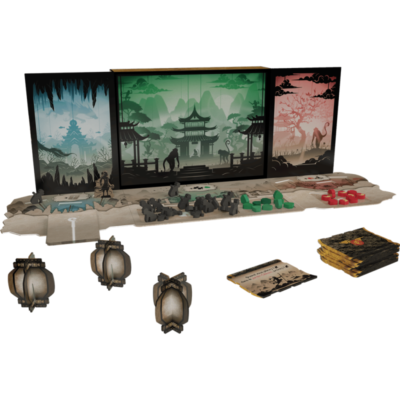 Bienvenue dans la légende du Roi Singe, l’un des Quatre livres extraordinaires de la littérature chinoise ! Retrouvez des lieux emblématiques du roman : le Palais de l’Empereur, le Jardin Céleste et le Repaire du Dragon, grâce à la superbe boîte qui sert également de décor de théâtre d’ombres chinoises pour accueillir la partie !