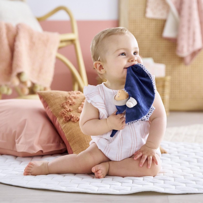 Le doudou Tidoudou Marine Rêves d'Étoiles a la peau blanche et les yeux bleus peints. Il est habillé d'un tissu rond bi-couleurs et bi-matière (un côté tout doux en velours bleu marine et de l'autre un tissu à motifs étoiles. Il porte un bonnet bleu marine tout doux sur sa tête.