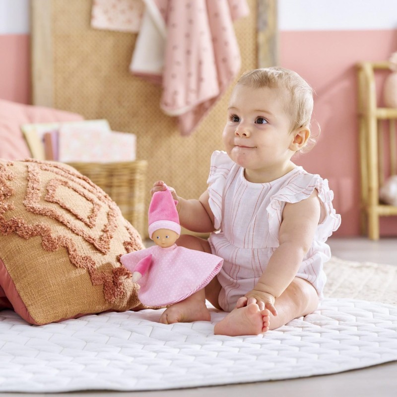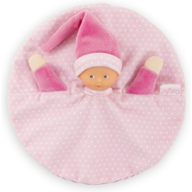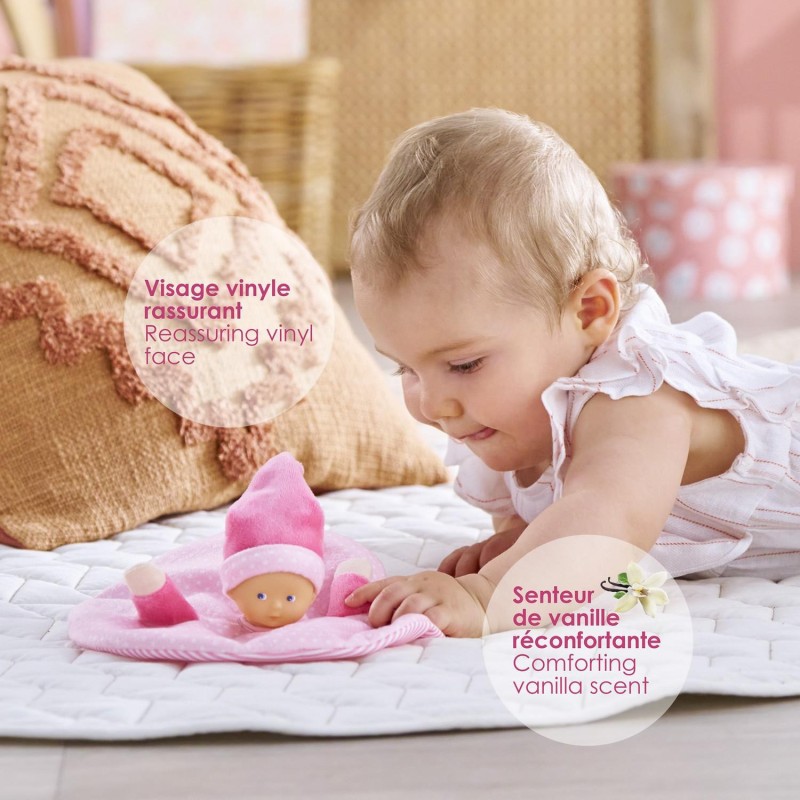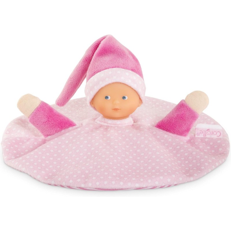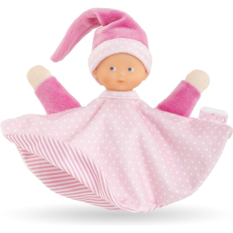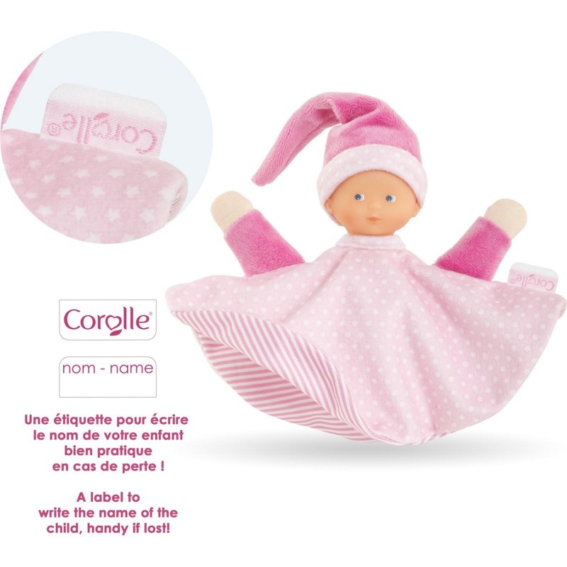 Mon Tidoudou, c’est mon doudou qui se glisse partout. Ce que je préfère, chez lui, c’est sa douceur. J’aime en effet caresser son corps bi-matière qui favorise le toucher. Ce que mes parents préfèrent quant à eux, c’est sa petite taille. Un mini-doudou de 17 cm, facile à transporter et qu’ils peuvent glisser partout : dans un sac, sous la poussette, dans une poche de manteau... Sa petite frimousse en vinyle est tellement réaliste qu’elle me permet d’être rassuré(e) dès que je le regarde. Parfois, quand j’en ai besoin, je l’attrape facilement par son chapeau pointu ou ses bras et je le serre fort tout contre moi. Je sens alors sa délicate senteur de vanille m’envelopper et me réconforter pour longtemps. Mon Tidoudou et moi, on est inséparables. Car même si je l’oublie quelque part, on me le rendra : il possède une étiquette pour écrire mon prénom ou le numéro de téléphone de mes parents. Le doudou Tidoudou Rêves d'Étoiles a la peau blanche et les yeux bleus peints. Il est habillé d'un tissu rond bi-couleurs et bi-matière (un côté tout doux en velours avec motifs étoiles et de l'autre un tissu à motifs rayures rose/blanc. Il porte un bonnet rose tout doux sur sa tête. Lavable en machine, cycle délicat. mon doudou Corolle : Toi et moi, pour toujours. Dès la naissance.