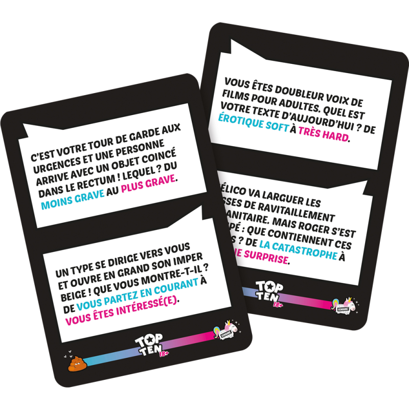 Répondez tous à l’un des thèmes drôles et épicés en fonction de votre numéro (entre 1 et 10). Ensuite, l’un de vous tente de remettre toutes ces réponses dans le bon ordre pour faire gagner l’équipe ! Comment jouer ?Lisez un thème. Exemple : “Regarde chéri(e), j’ai apporté des préservatifs au gout…” Complétez, du pire au meilleur.Chacun invente et annonce une réponse correspondant à son n° secret de 1 (le pire) à 10 (le meilleur) : “Cendrier” ; “Épinard” ; “Pizza ananas” ; “Caramel beurre salé”…Si le Cap’ten arrive à remettre les réponses dans le bon l’ordre, du plus petit au plus grand n°, l’équipe a gagné ! 500 thèmes épicés et délirants qui vous feront inventer, raconter et mimer n’importe quoi ! Enfin un jeu où la surenchère de c*nneries est payante ! Ce jeu est la version pour adultes uniquement du célèbre jeu Top Ten ! Le principe est le même mais les thèmes sont plus pimentés ! Exemples : Où avoir un rapport sexuel dans la pièce où vous jouez ? Du moins confortable au plus confortable. L’hélico va larguer les caisses de ravitaillement humanitaire. Mais Roger s’est trompé : que contiennent ces caisses ? De la catastrophe à la bonne surprise. Vous avez pris des champignons hallucinogènes. Que voyez-vous autour de vous ? De la petite hallu au trip du siècle.