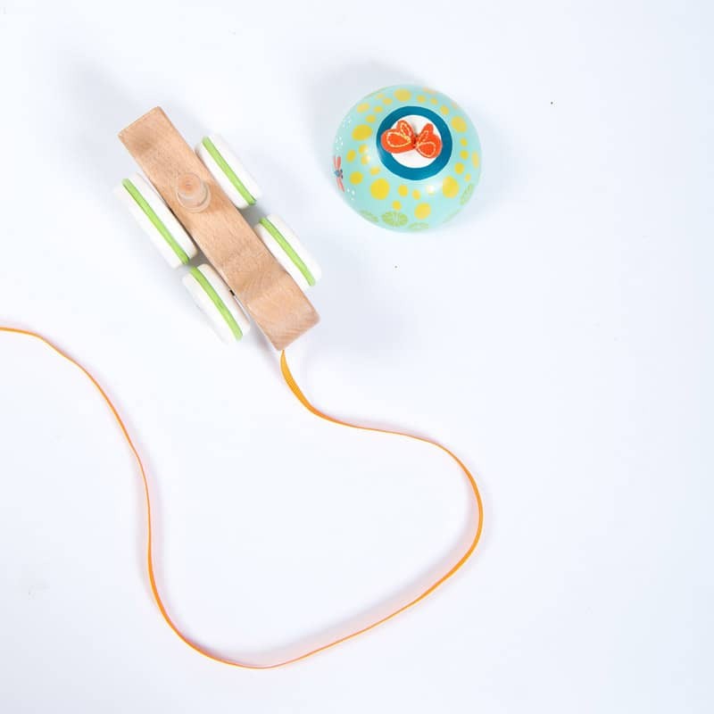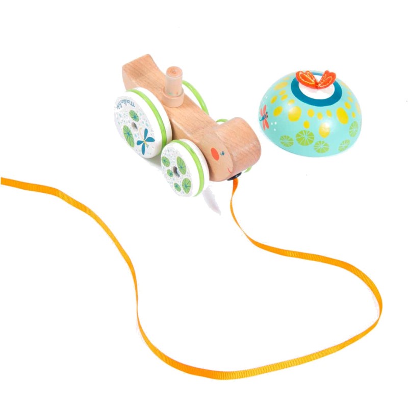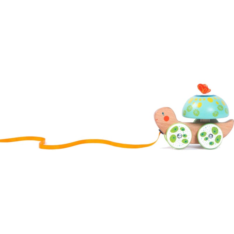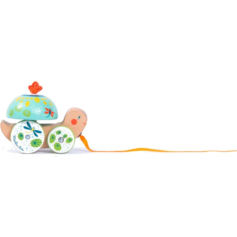 Tortue à tirer en bois coloré, imprimé de motifs et illustrations. Quand elle roule, sa carapace tourne sur elle-même ! Développe la motricité de l'enfant. Jouet à tirer par un ruban.