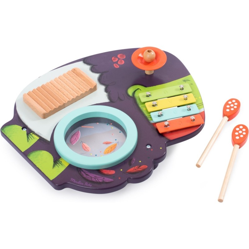 Pakou le toucan cache plein de surprises musicales ! Sous son œil rieur, les petits pourront jouer du tambour ou du métallophone, faire vibrer une cymbale ou s'amuser avec le grattoir, munis de 2 baguettes en bois !
