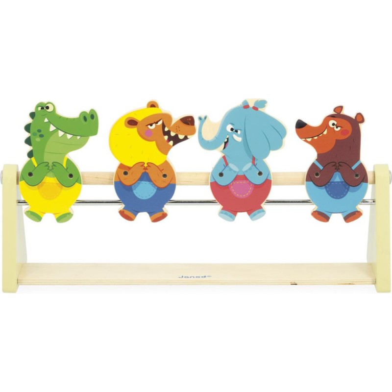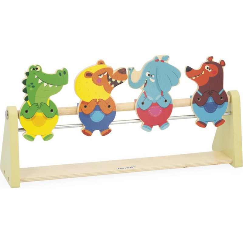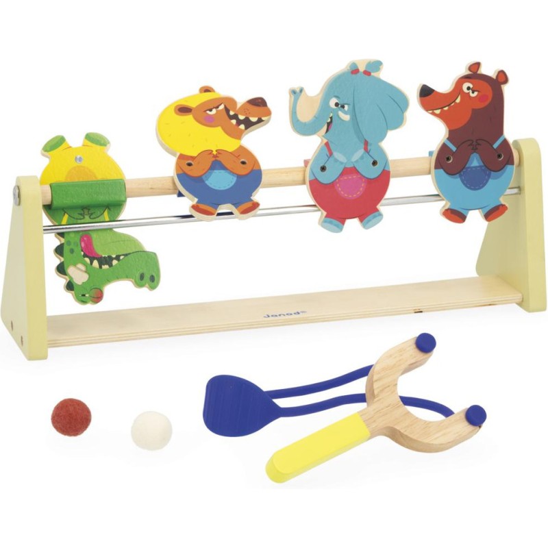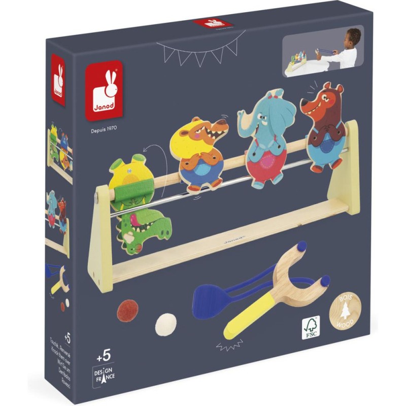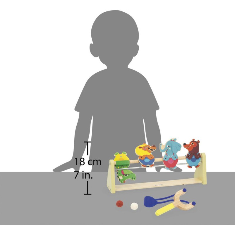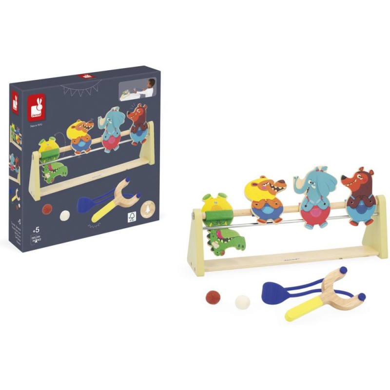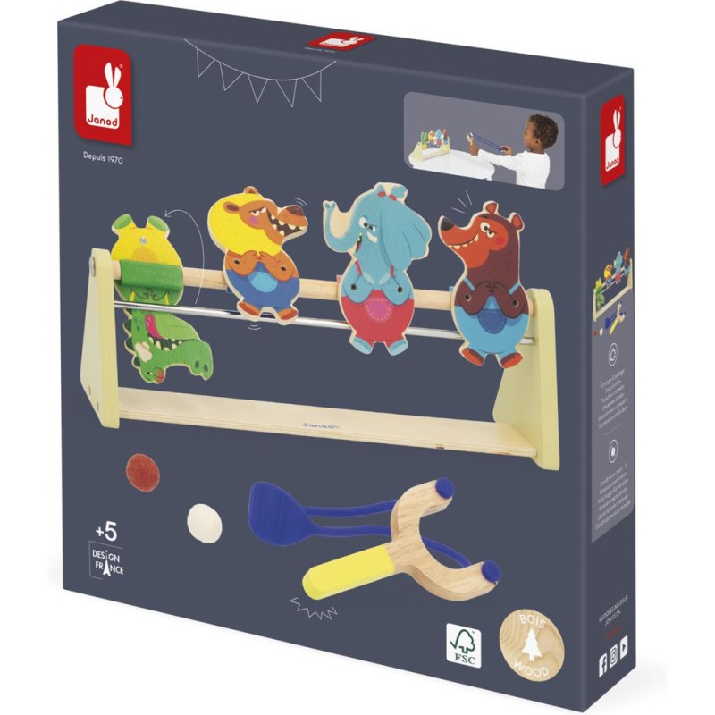 Un jeu renversant ! Idéal pour les enfants à partir de 5 ans, ce jeu d’adresse promet fou-rires et tirs de précisions en famille. Si vous êtes lassés des jeux de tir ou de lancer classiques, optez pour cette option beaucoup plus originale dont le principe est simple : munis de leur lanceur et d’une balle en feutrine, les enfants visent les animaux et tirent pour tenter de les renverser. Crocodile, lion, éléphant et ours ont plutôt l’air confiant : ils ne savent pas ce qui les attend ! Une fois la tête à l’envers, on fait moins les fiers ! Voilà un jeu type kermesse parfait pour développer la concentration, l’adresse, mais aussi la coordination. À vous d’adapter la distance entre le lanceur et les cibles pour différents niveaux de difficulté. Le lanceur en forme de lance-pierre et les animaux dingos qui composent ce jeu invitent au challenge ! Les personnages tiennent debout grâce à un système d’aimants et mesurent 11 cm de haut. Ce jeu d’adresse en bois est livré avec 2 balles. C’est l’occasion parfaite de réunir la famille ou les copains pour se lancer des défis tour à tour ! Animez vos soirées jeux en relevant le défi ! Ce jeu de kermesse est composé de bois issu de forêts gérées durablement, certifié Fsc™. Il fait partie de la grande collection Applepop, une collection de jeux funs et décalés inspirée de l’univers de la fête foraine. Touché … Renversé !
