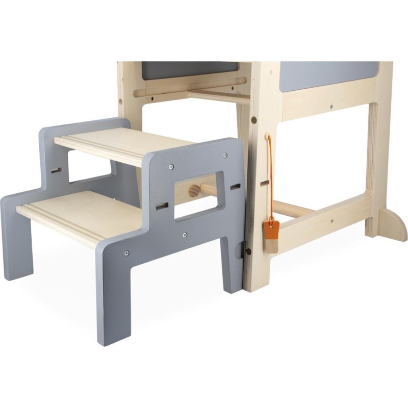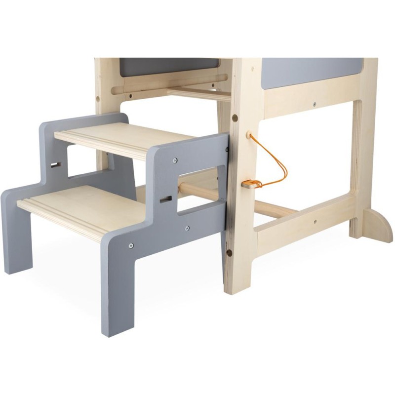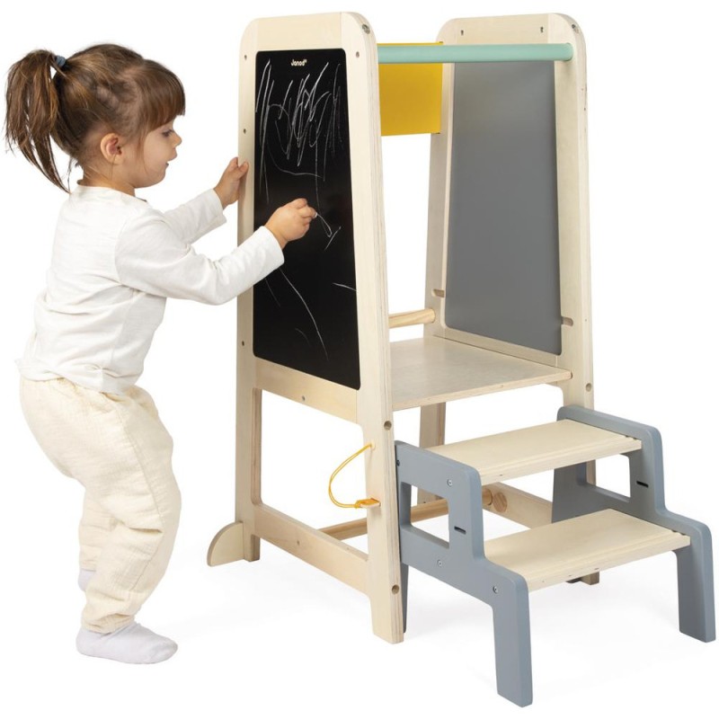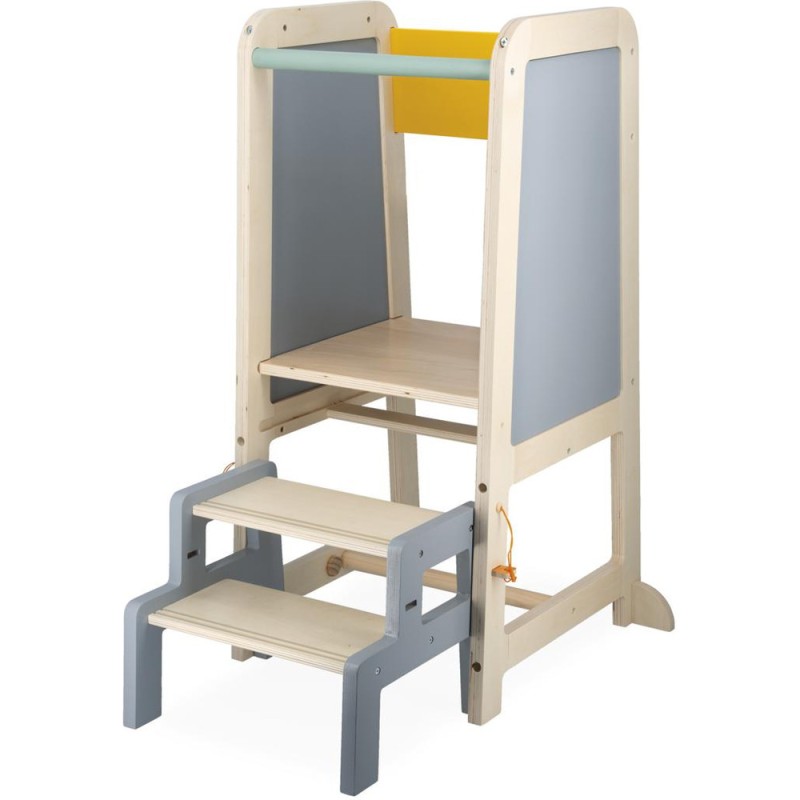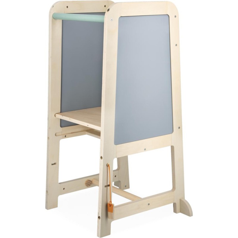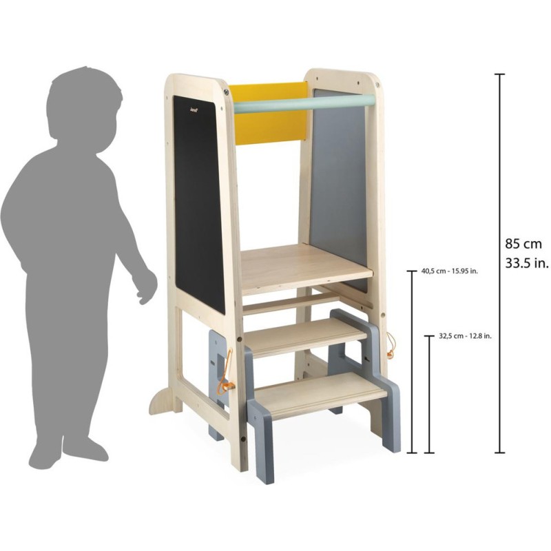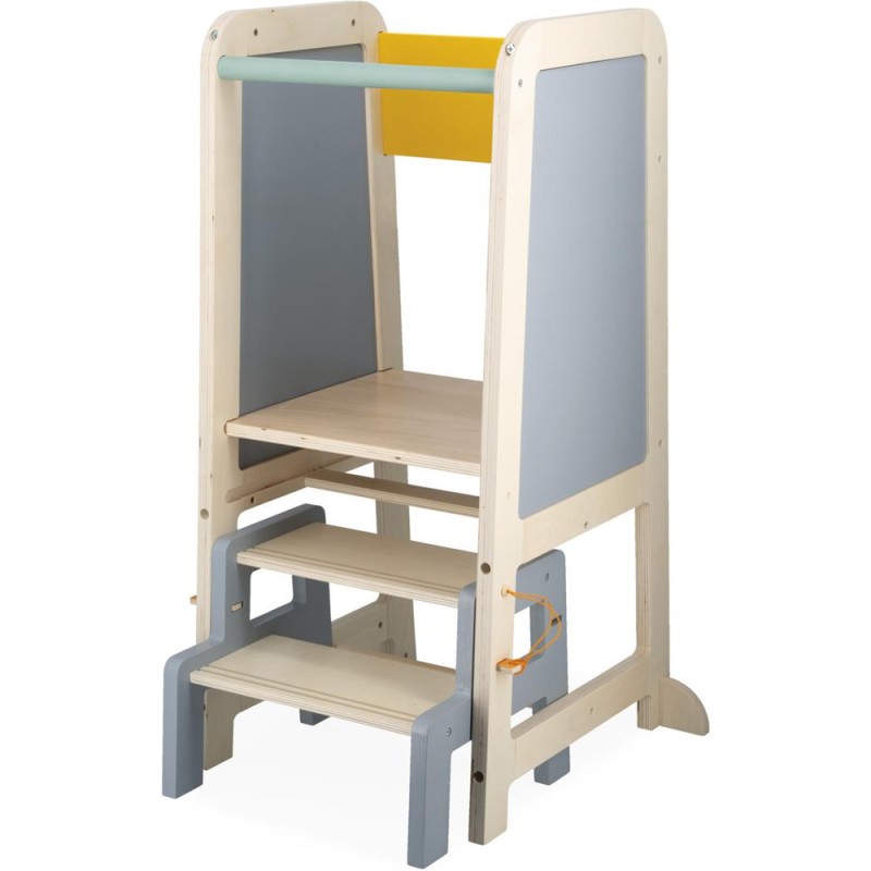 Place à l'autonomie à hauteur des grands ! Cette tour d'observation en bois est adaptée aux enfants dès 18 mois et leur confère l'indépendance et la sécurité dont ils ont besoin pour découvrir le monde. Une tour d'apprentissage qui se veut ergonomique et fonctionnelle, mais aussi ludique avec un tableau noir accompagné de 2 craies et 1 brosse ! Toute la famille valide cette tour d'observation multifonctions. Bébé va pouvoir développer sa motricité et devenir toujours plus autonome, tout en s'amusant à dessiner sur sa tour d'apprentissage en bois encore et encore ! Pour suivre l'enfant au fur et à mesure qu'il grandit, et ce jusqu'à 3 ans, cette tour d'observation évolutive est équipée d'un marchepied : il se fixe à la tour sur les côtés et peut être utilisé indépendamment comme tabouret. Et pour toujours plus d'adaptabilité, cette tour d'apprentissage multi-usages est réglable en hauteur : 2 niveaux sont prévus (32,5 cm et 40,5 cm) et sont facilement adaptables ! L'épaisseur des pièces en bois font de cette tour d'observation un jouet d'éveil robuste et sécurisé pour l'enfant. Son style intemporel et ses jolies courbes permettent d'installer la tour d'apprentissage de bébé dans tous les lieux stratégiques de la maison, comme la cuisine ou le lavabo. Pratique et pédagogique, ce mobilier pour enfants permet aux petits d'éviter toute frustration en s'installant à hauteur d'une table ou d'un plan de travail pour rester impliqués dans les tâches du quotidien. Pas de sentiment d'exclusion et une curiosité éveillée : la recette parfaite pour des bambins qui explorent en toute tranquillité ! Installé sur sa tour d'apprentissage, l'enfant a les mains libres ... Et les parents aussi !