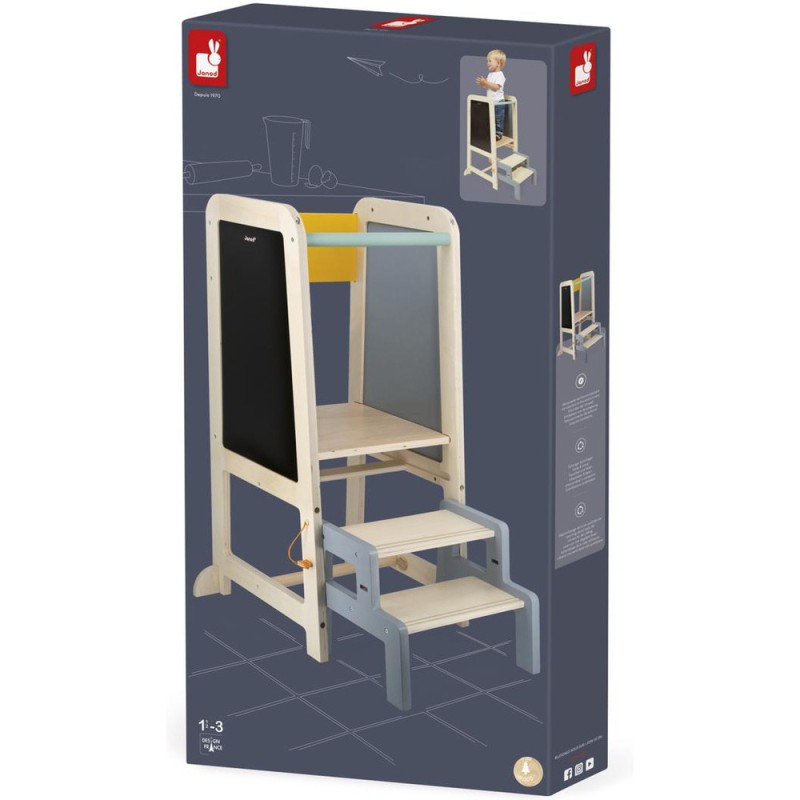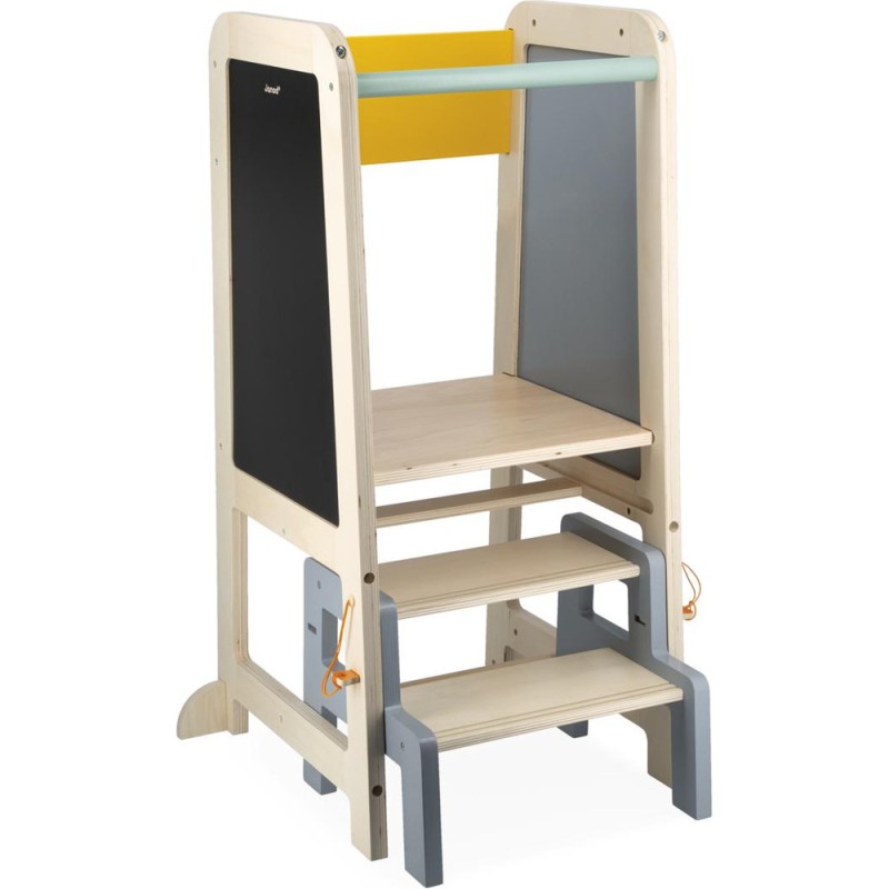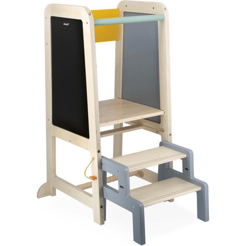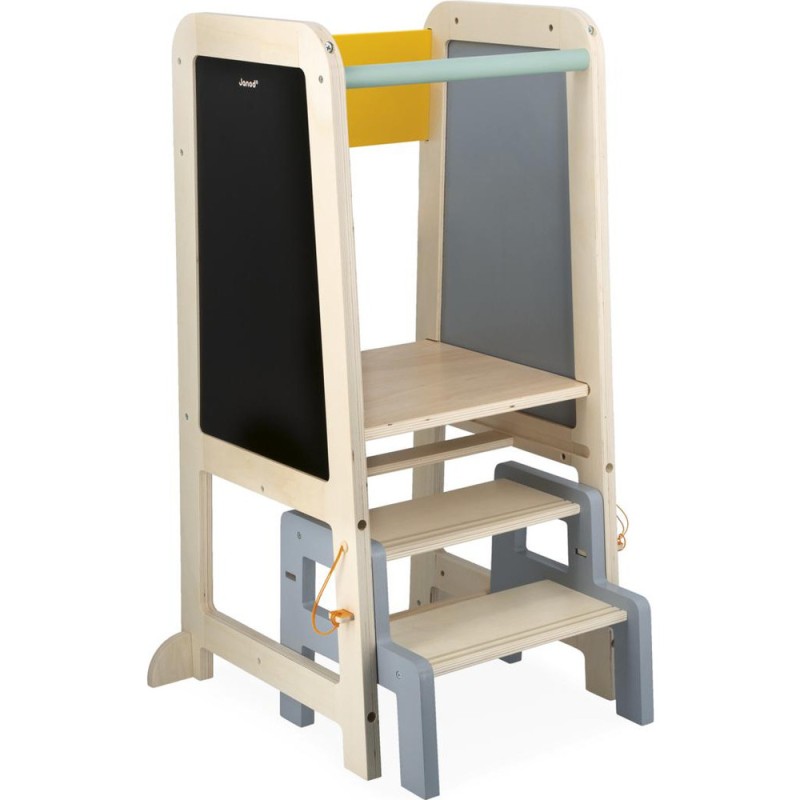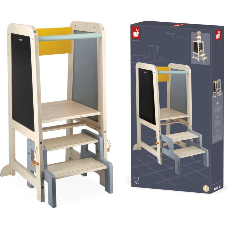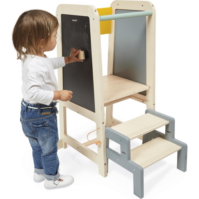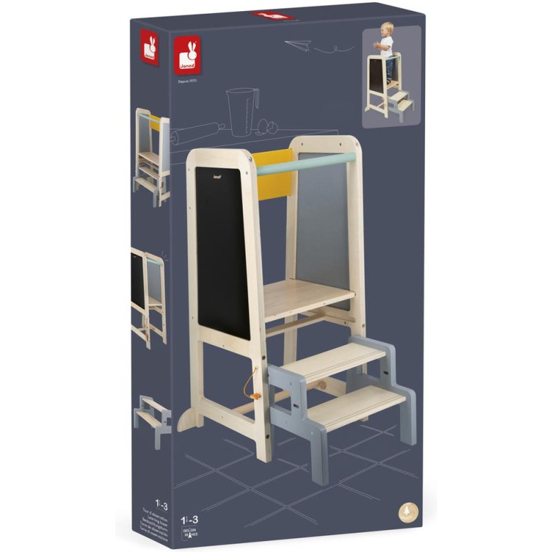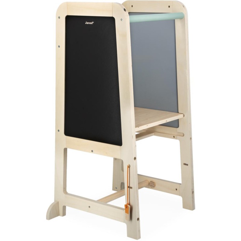 Place à l'autonomie à hauteur des grands ! Cette tour d'observation en bois est adaptée aux enfants dès 18 mois et leur confère l'indépendance et la sécurité dont ils ont besoin pour découvrir le monde. Une tour d'apprentissage qui se veut ergonomique et fonctionnelle, mais aussi ludique avec un tableau noir accompagné de 2 craies et 1 brosse ! Toute la famille valide cette tour d'observation multifonctions. Bébé va pouvoir développer sa motricité et devenir toujours plus autonome, tout en s'amusant à dessiner sur sa tour d'apprentissage en bois encore et encore ! Pour suivre l'enfant au fur et à mesure qu'il grandit, et ce jusqu'à 3 ans, cette tour d'observation évolutive est équipée d'un marchepied : il se fixe à la tour sur les côtés et peut être utilisé indépendamment comme tabouret. Et pour toujours plus d'adaptabilité, cette tour d'apprentissage multi-usages est réglable en hauteur : 2 niveaux sont prévus (32,5 cm et 40,5 cm) et sont facilement adaptables ! L'épaisseur des pièces en bois font de cette tour d'observation un jouet d'éveil robuste et sécurisé pour l'enfant. Son style intemporel et ses jolies courbes permettent d'installer la tour d'apprentissage de bébé dans tous les lieux stratégiques de la maison, comme la cuisine ou le lavabo. Pratique et pédagogique, ce mobilier pour enfants permet aux petits d'éviter toute frustration en s'installant à hauteur d'une table ou d'un plan de travail pour rester impliqués dans les tâches du quotidien. Pas de sentiment d'exclusion et une curiosité éveillée : la recette parfaite pour des bambins qui explorent en toute tranquillité ! Installé sur sa tour d'apprentissage, l'enfant a les mains libres ... Et les parents aussi !