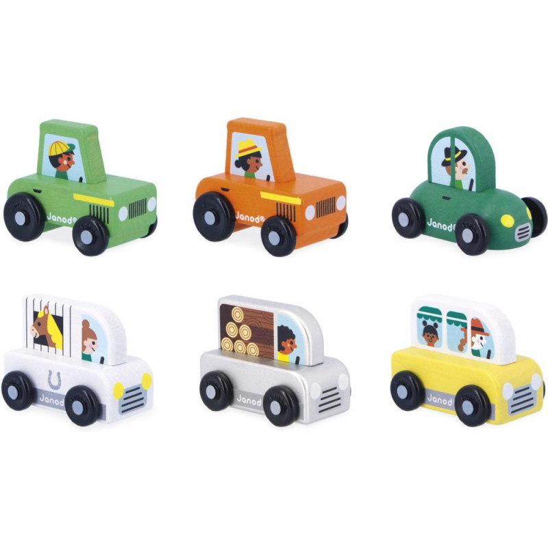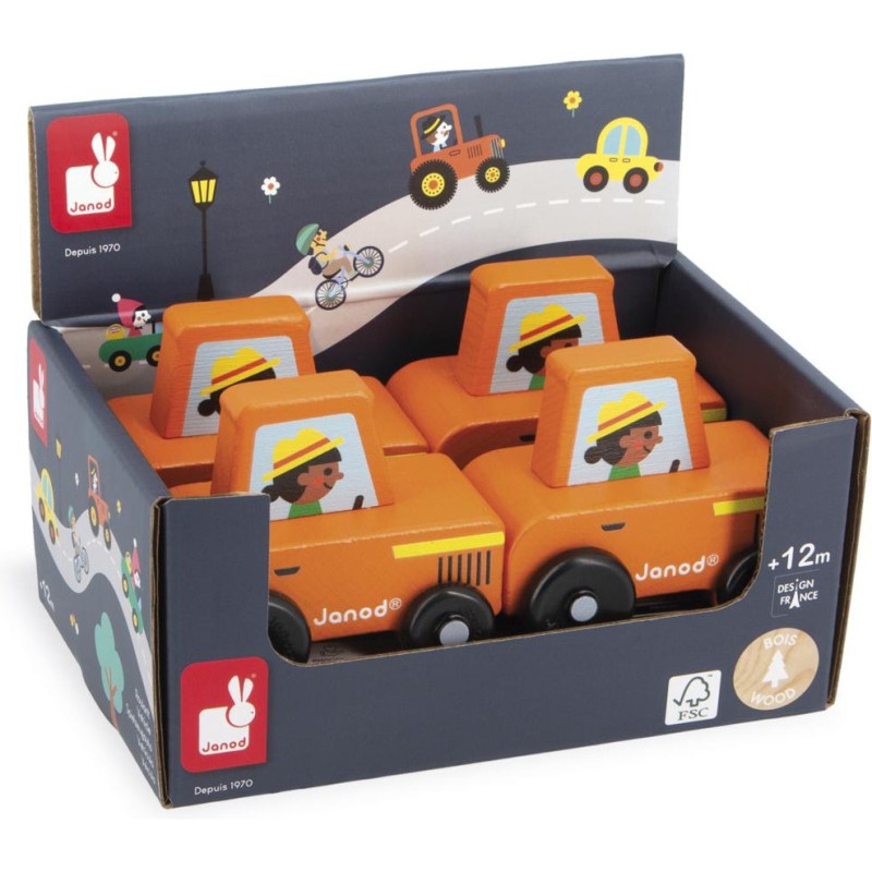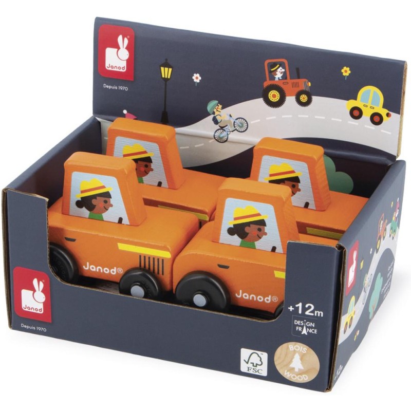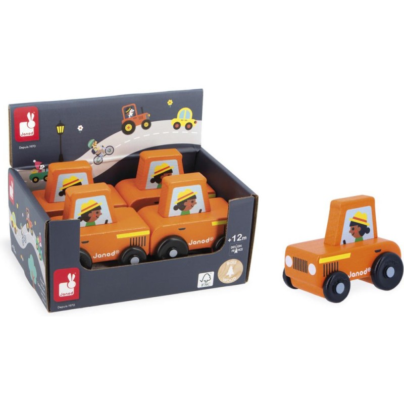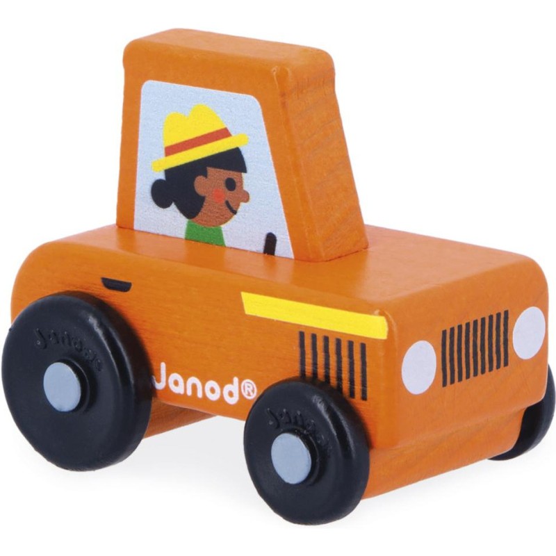 « En route pour le potager ! » Cette petite voiture en bois convient aux enfants, dès l’âge de 12 mois. Avec son tracteur orange, la fermière roule en direction des champs pour surveiller sa récolte ! Sa forme a été pensée spécialement pour une prise en main optimale pour les petits, qui peuvent facilement la tenir par le haut pour la faire rouler. Les véhicules sont parfaits pour inventer de nombreuses histoires et développer son imagination ! Les bébés s’amusent d’abord à les faire rouler, puis les plus grands se racontent toutes sortes d’aventures et développent leur vocabulaire et leur créativité. Ce petit tracteur Janod est issu de notre collection Cross Roads : une série de tapis de jeu avec circuits, encore plus ludiques quand ils sont complétés par nos sets de cubes et nos petits véhicules en bois. Le tracteur orange convient particulièrement au tapis de jeu Campagne, mais s’associe tout aussi bien avec d’autres tapis de la gamme. Il est composé de bois issu de forêts gérées durablement, certifié Fsc™. « J’espère bien vendre tous ces légumes au marché ! »