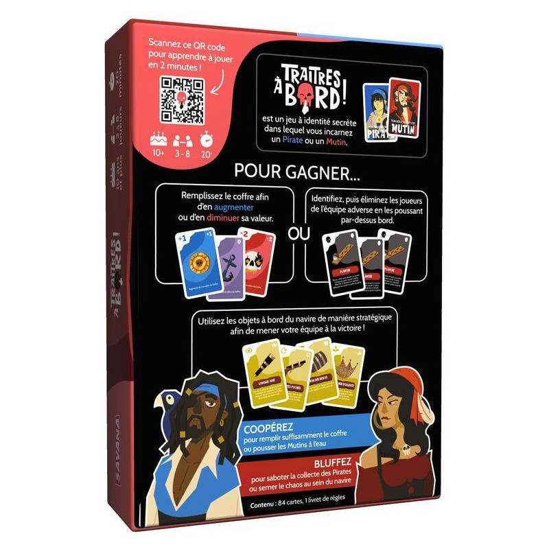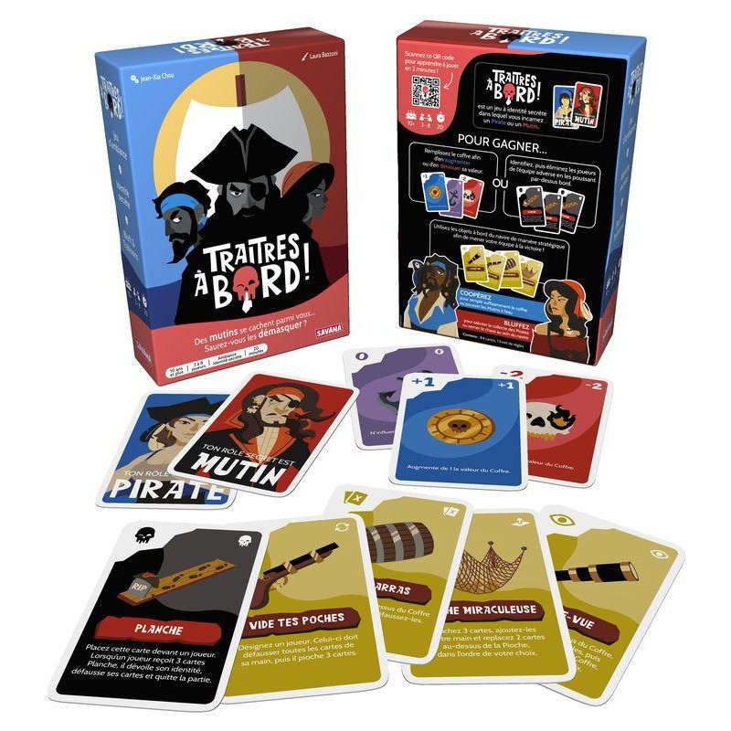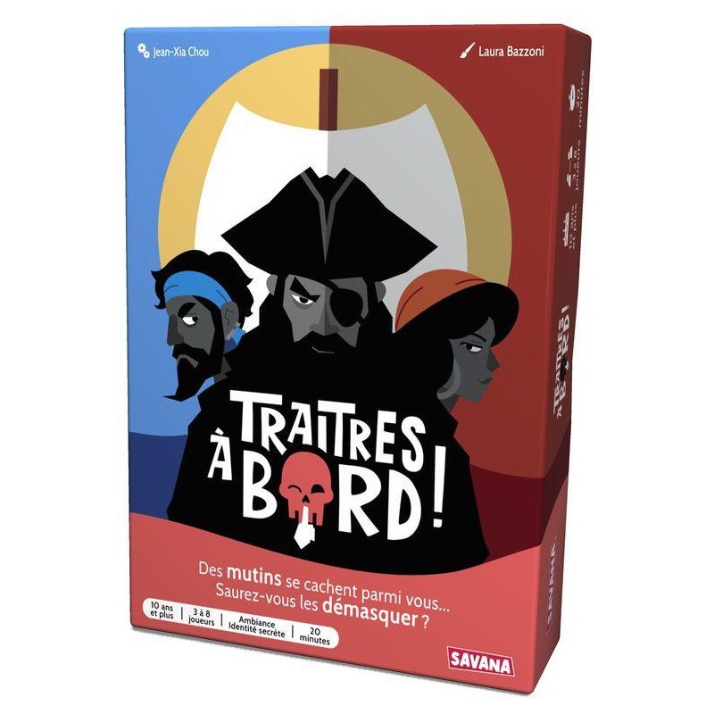 Traitres À Bord est un jeu d'ambiance à identité secrète, de 3 à 8 joueurs et dès 10 ans, idéal pour une soirée en famille ou entre amis. Le cœur du jeu réside dans l'interaction entre les joueurs et leur communication. Ils devront user de stratégie, de bluff et de négociation pour atteindre leurs objectifs.