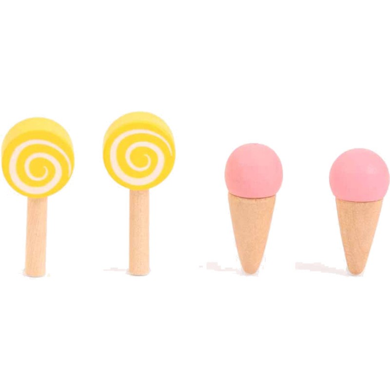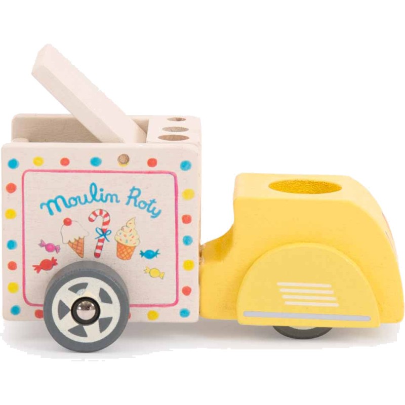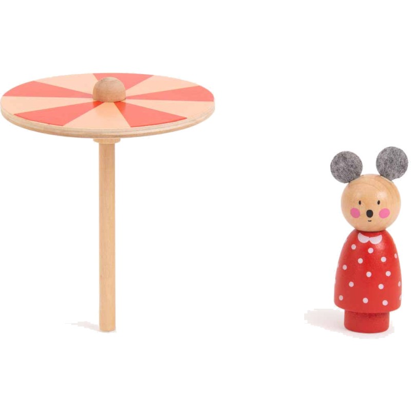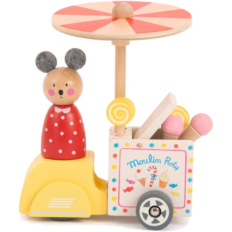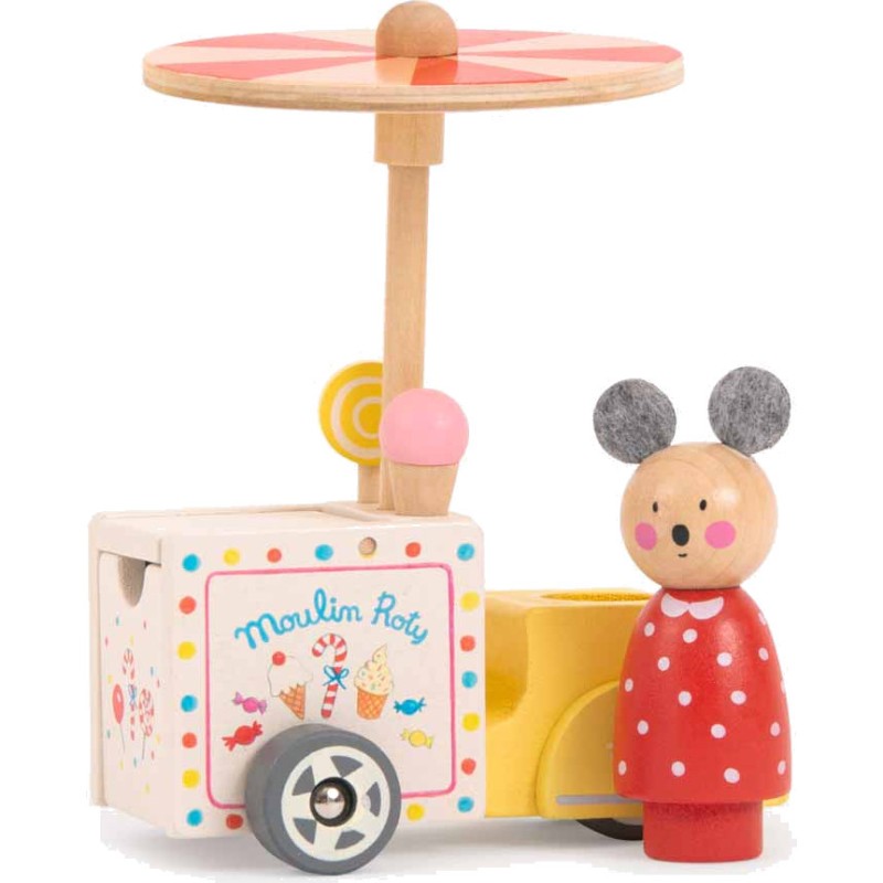 C'est l'été, il fait chaud et Nini la souris a préparé des glaces pour régaler la Grande Famille. Cet ensemble tout en bois inclut Nini, un parasol, 4 glaces et le triporteur du glacier à ouvrir pour y ranger les glaces au frais !