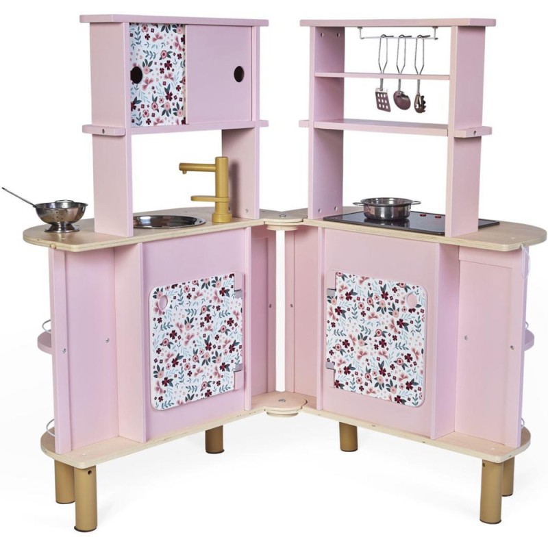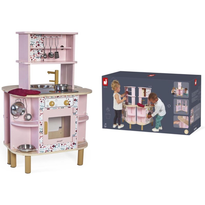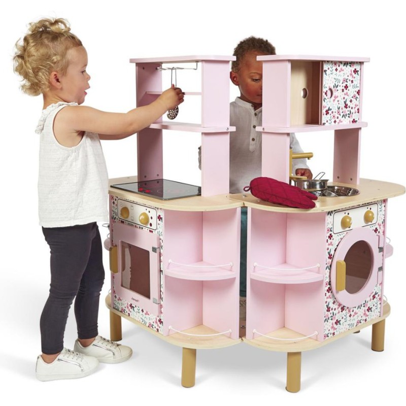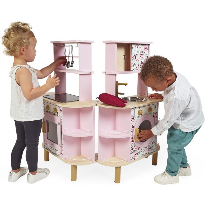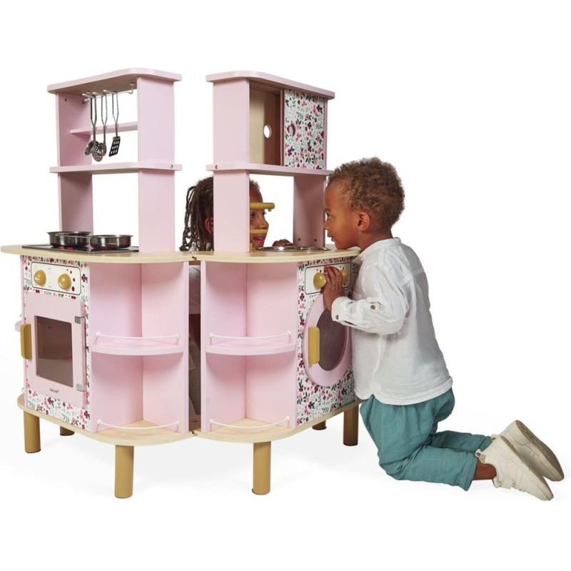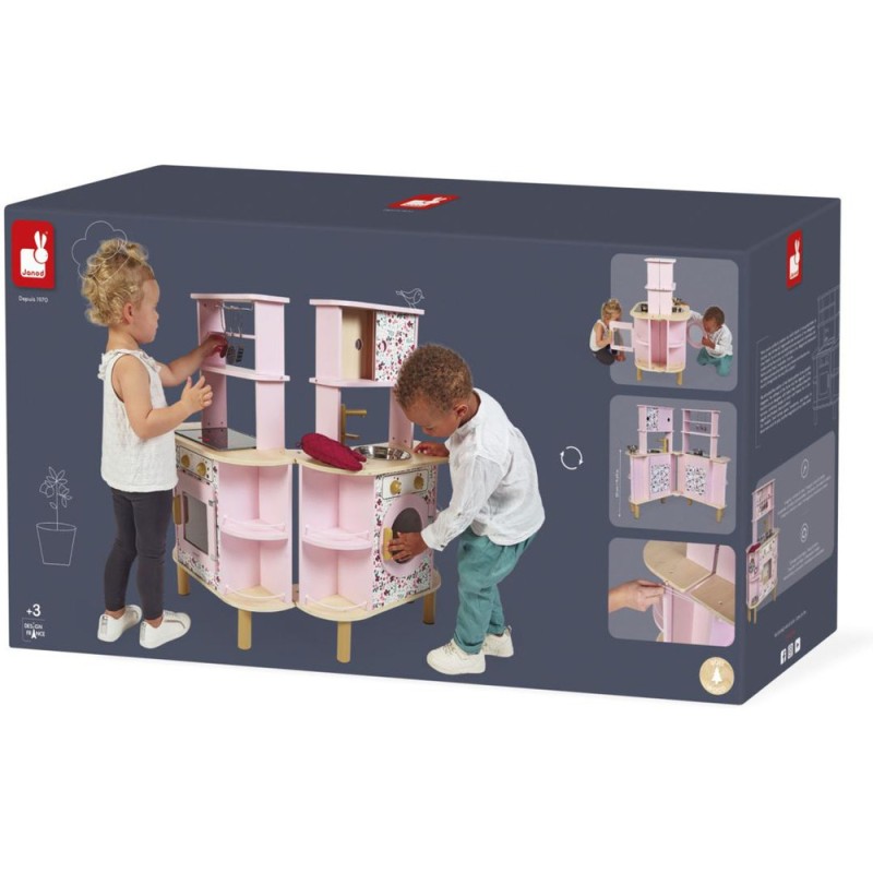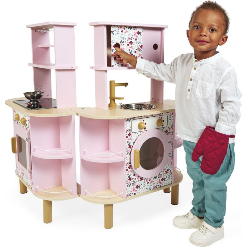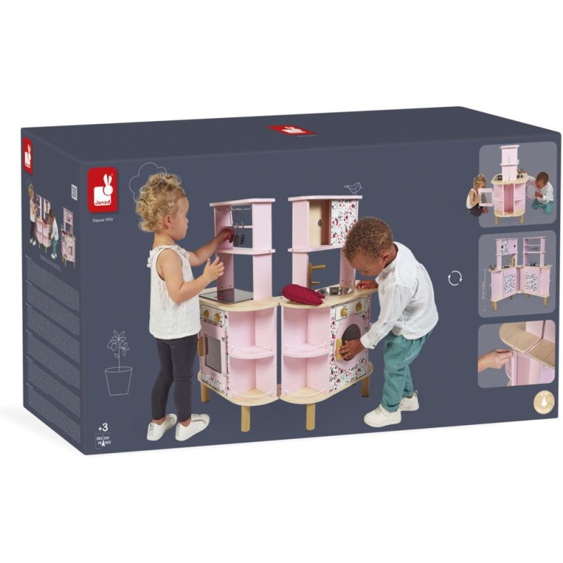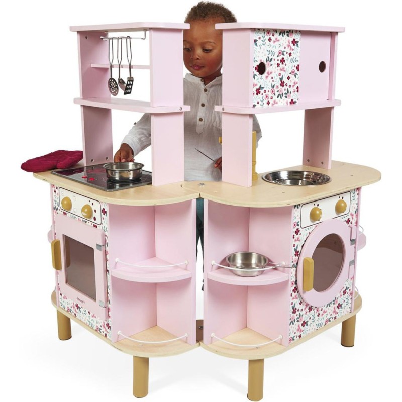Ca va twister avec notre cuisine recto/verso qui se déplie ! Idéale pour préparer de bons petits plats à plusieurs, cette magnifique cuisine en bois aux tons sucrés va ravir tous les cuistots en herbe car elle est pleine de surprises ! Besoin d'un peu plus de place en cuisine ? Aucun souci, ouvrons-la par le milieu pour découvrir ce qui se cache à l'intérieur et multiplier ainsi les possibilités de jeu. Un loquet permet de maintenir la cuisine fermée quand les temps de jeu sont terminés. Cet incontournable jeu d'imitation en bois est idéal à partir de 3 ans et permet de développer l'imagination en créant bon nombre de plats originaux et de situations amusantes grâce à la face cuisine mais également à la face la machine à laver ! Elle est très bien équipée avec son évier en métal, son robinet en bois et sa plaque à induction sonore et lumineuse. Il suffit d'appuyer une fois sur les boutons rouges pour que les plaques s'allument, puis une deuxième fois pour entendre le son de l'eau qui bout. Le son et la lumière s’éteignent automatiquement au bout de 30 secondes ou lorsqu'on appuie une troisième fois. Pour mettre le four et la machine à laver en marche, rien de plus simple, ils sont chacun équipés de deux boutons rotatifs avec bruitage. Les portes sont magnétiques et la vitre transparente permet de s'assurer que la machine est bien terminée ! 4 portes coulissantes permettent de ranger les boîtes de gâteaux et autres friandises. À l'intérieur de la cuisine, 2 placards supplémentaires permettent de ranger les ustensiles et autres accessoires. De jolies patères métalliques sont également fournies pour accrocher spatule et écumoire ! Au total 8 accessoires accompagnent cette magnifique cuisine pour enfants aux motifs fleuris. 6 patins en feutrine sont à placer sous les pieds pour faire coulisser facilement la cuisine à l'ouverture. Fermée, la cuisine mesure 55 x 47 x 87 cm.