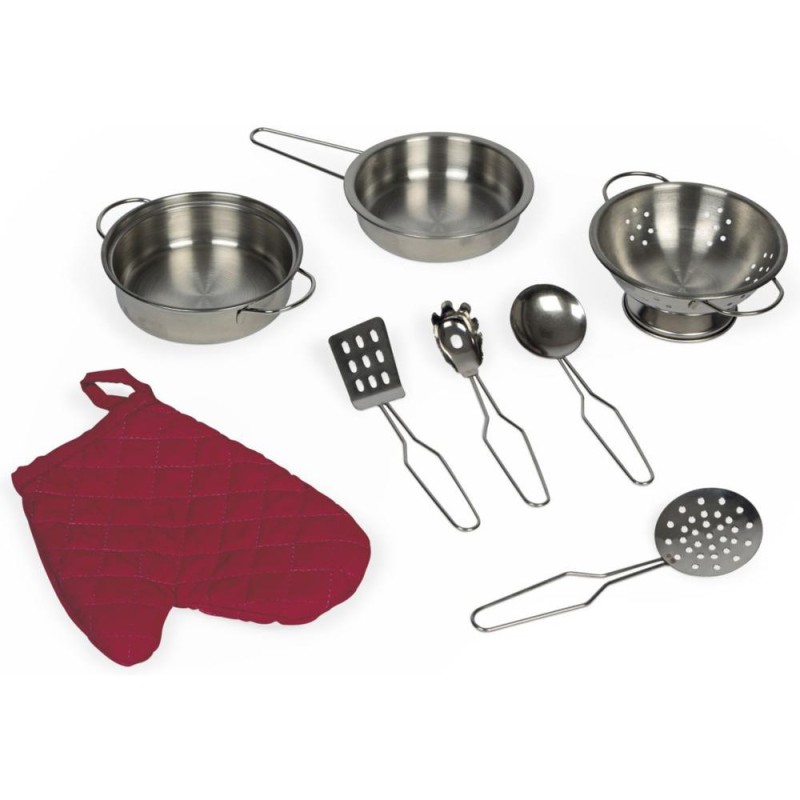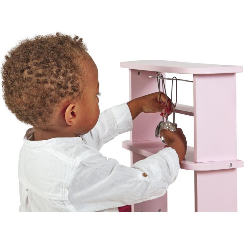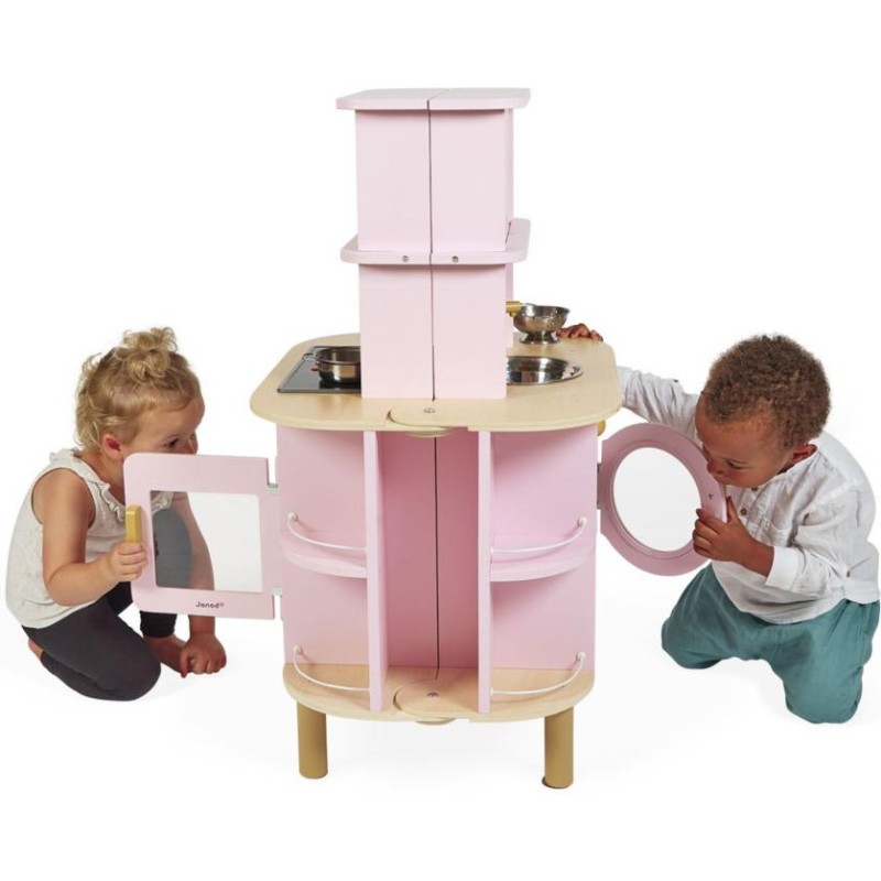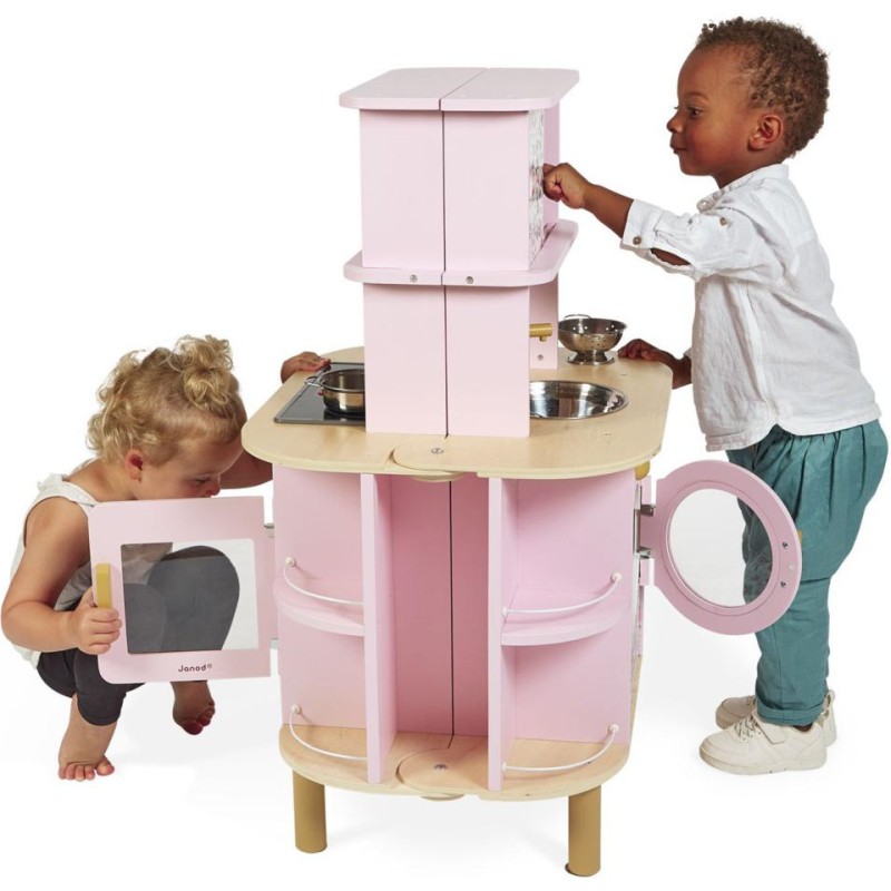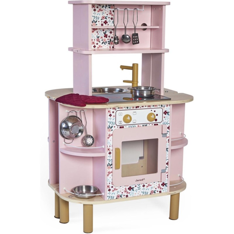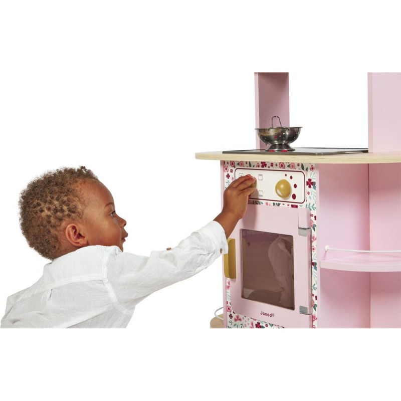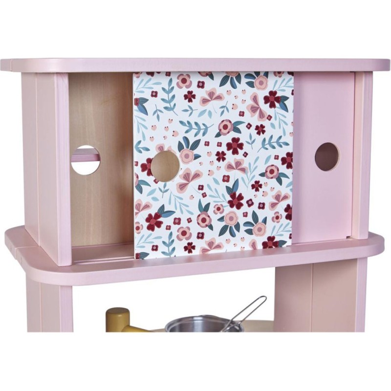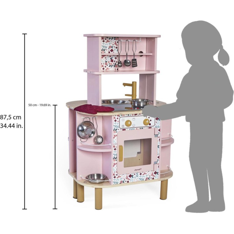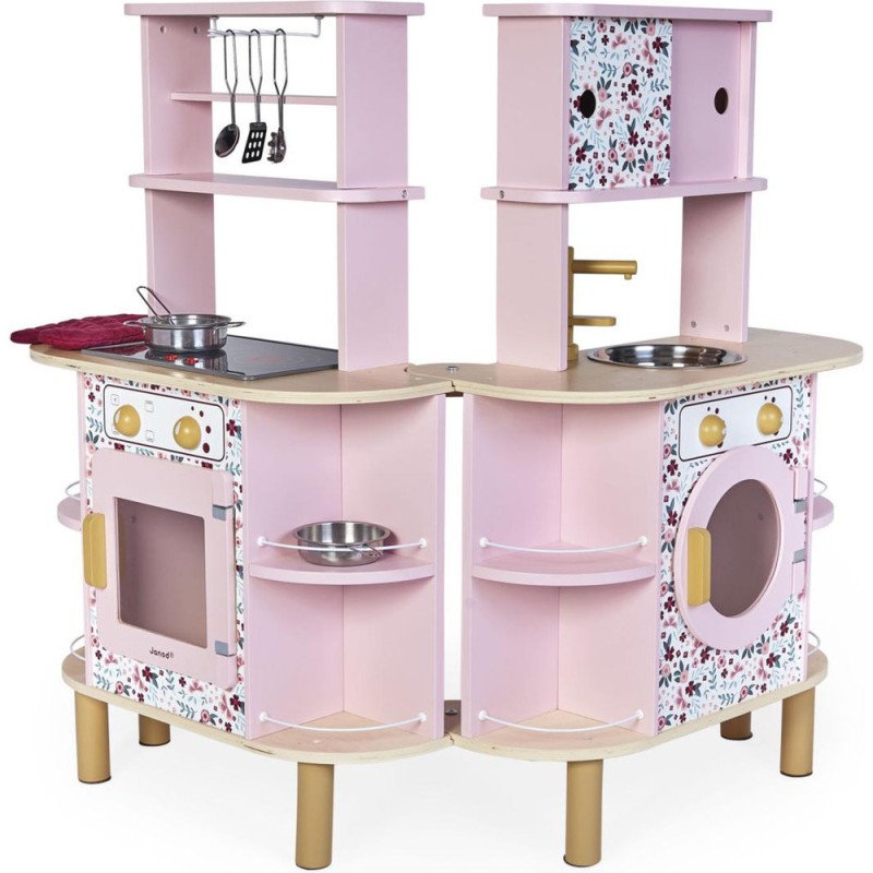 Ca va twister avec notre cuisine recto/verso qui se déplie ! Idéale pour préparer de bons petits plats à plusieurs, cette magnifique cuisine en bois aux tons sucrés va ravir tous les cuistots en herbe car elle est pleine de surprises ! Besoin d'un peu plus de place en cuisine ? Aucun souci, ouvrons-la par le milieu pour découvrir ce qui se cache à l'intérieur et multiplier ainsi les possibilités de jeu. Un loquet permet de maintenir la cuisine fermée quand les temps de jeu sont terminés. Cet incontournable jeu d'imitation en bois est idéal à partir de 3 ans et permet de développer l'imagination en créant bon nombre de plats originaux et de situations amusantes grâce à la face cuisine mais également à la face la machine à laver ! Elle est très bien équipée avec son évier en métal, son robinet en bois et sa plaque à induction sonore et lumineuse. Il suffit d'appuyer une fois sur les boutons rouges pour que les plaques s'allument, puis une deuxième fois pour entendre le son de l'eau qui bout. Le son et la lumière s’éteignent automatiquement au bout de 30 secondes ou lorsqu'on appuie une troisième fois. Pour mettre le four et la machine à laver en marche, rien de plus simple, ils sont chacun équipés de deux boutons rotatifs avec bruitage. Les portes sont magnétiques et la vitre transparente permet de s'assurer que la machine est bien terminée ! 4 portes coulissantes permettent de ranger les boîtes de gâteaux et autres friandises. À l'intérieur de la cuisine, 2 placards supplémentaires permettent de ranger les ustensiles et autres accessoires. De jolies patères métalliques sont également fournies pour accrocher spatule et écumoire ! Au total 8 accessoires accompagnent cette magnifique cuisine pour enfants aux motifs fleuris. 6 patins en feutrine sont à placer sous les pieds pour faire coulisser facilement la cuisine à l'ouverture. Fermée, la cuisine mesure 55 x 47 x 87 cm.