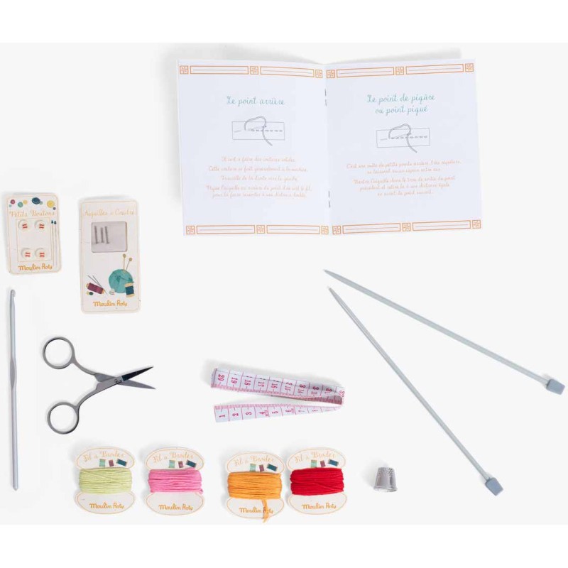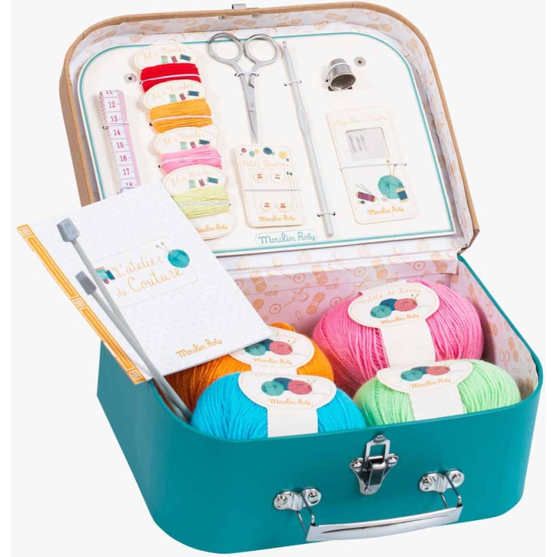 Tout l'univers de l'atelier couture contenu dans une valise !Pour faire comme les grands : des aiguilles à tricoter et des pelotes, du fil et des aiguilles, un mètre ruban, un dé à coudre, des petits boutons, une paire de ciseaux et un manuel explicatif.