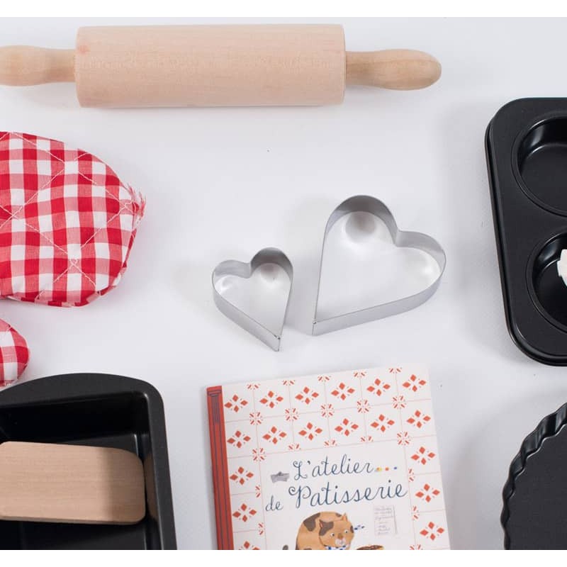 Tout l'univers de l'atelier pâtisserie contenu dans une valise !Pour faire comme les grands : de vrais ustensiles de cuisine en bois ou en métal, des moules à gâteaux, des emporte - pièces, un fouet et un recueil de 9 recettes sucrées…