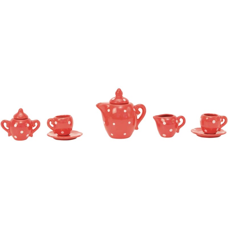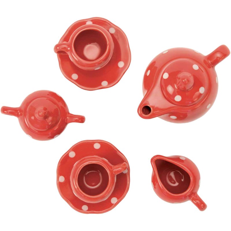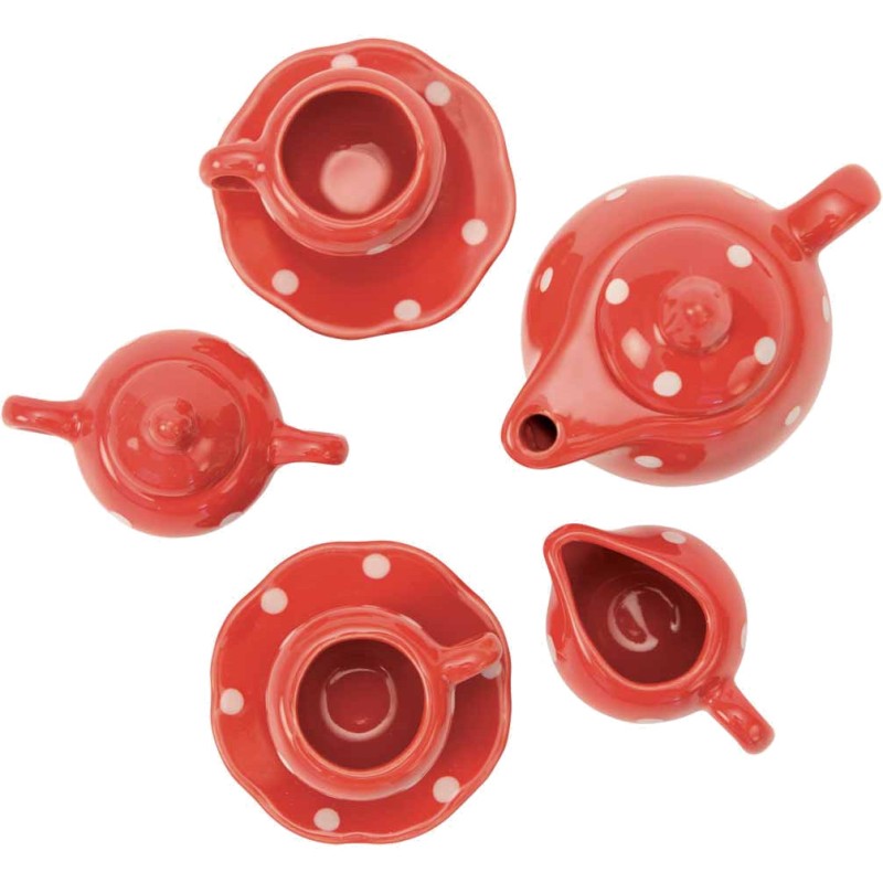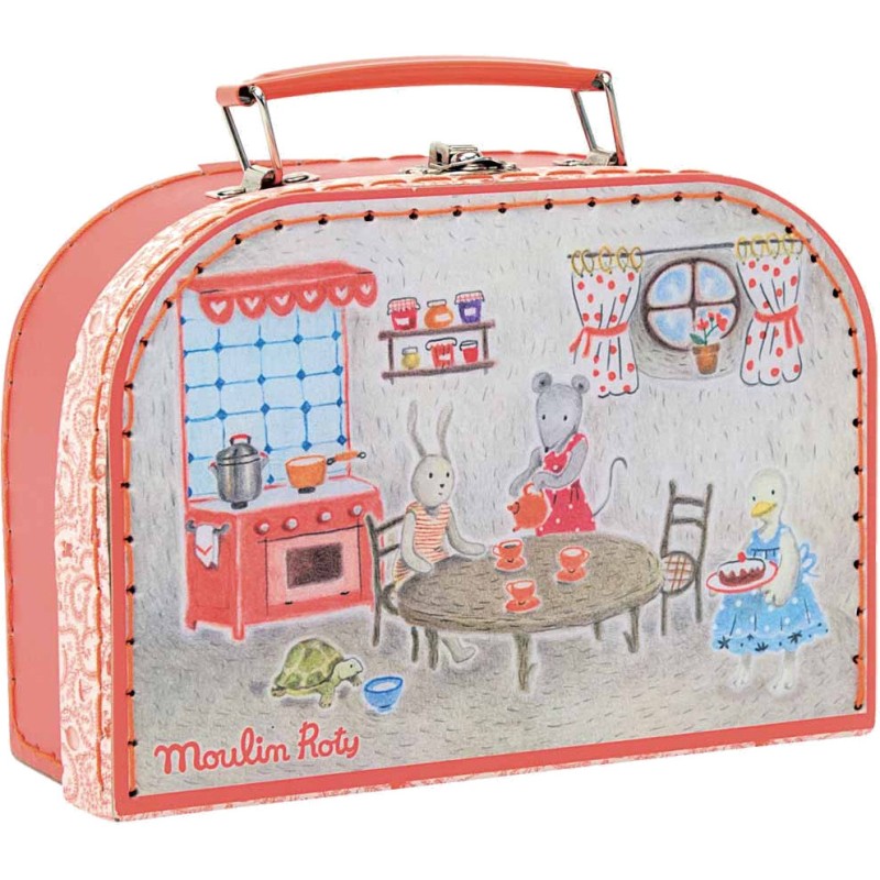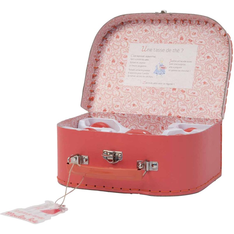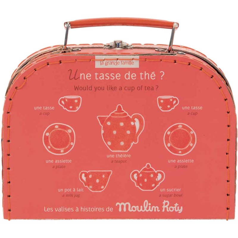 Valise à histoire, en carton imprimé et poignée métal, illustrée aux couleurs de La Grande Famille, comprenant un service à thé en céramique rouge à pois blancs pour jouer délicatement à la dînette.