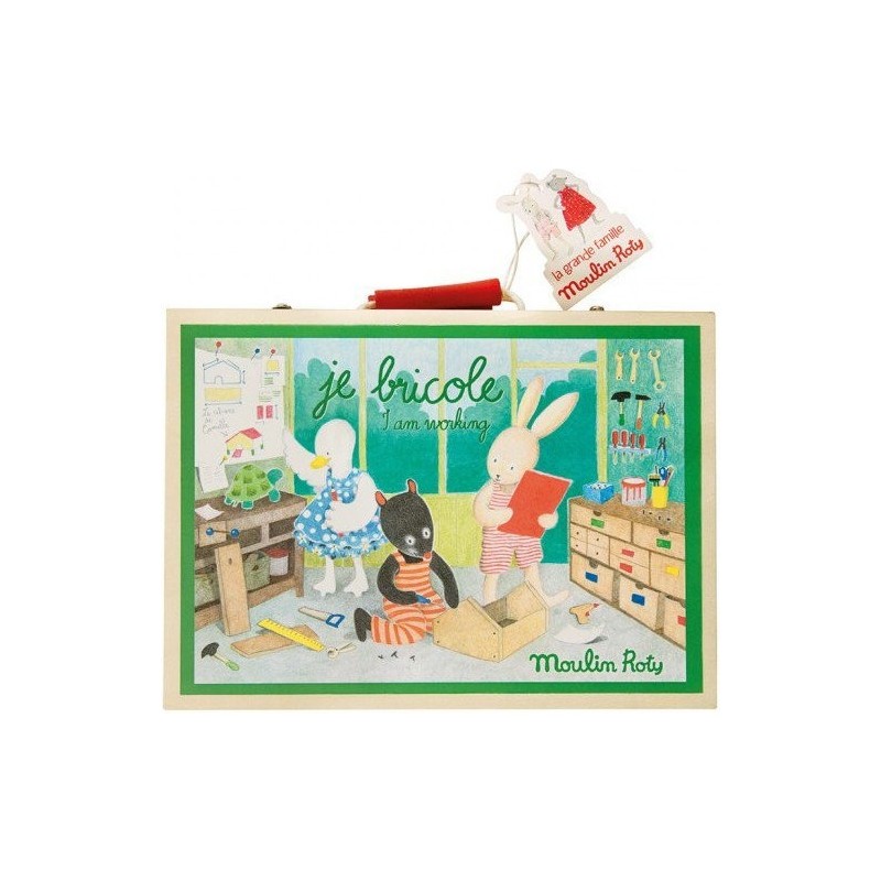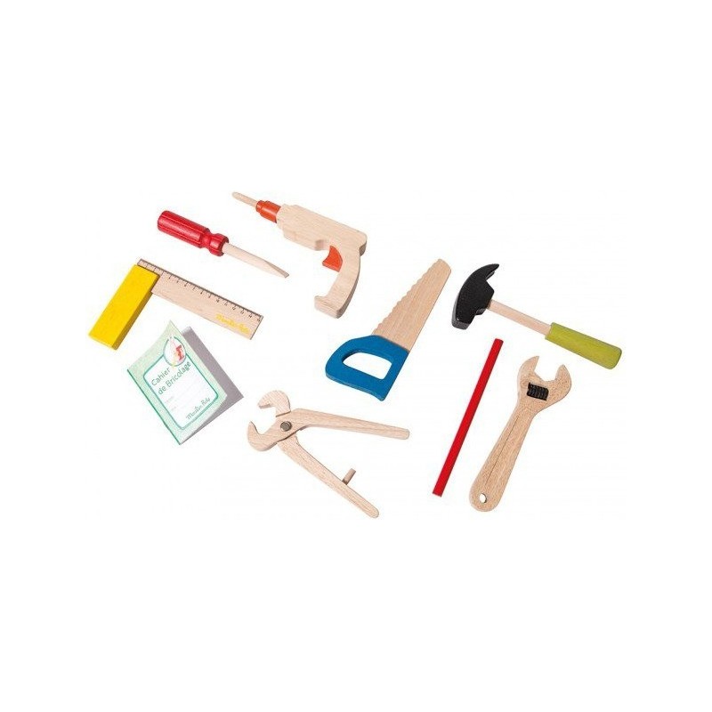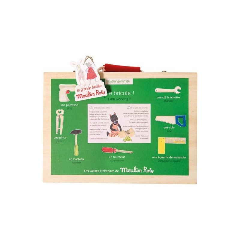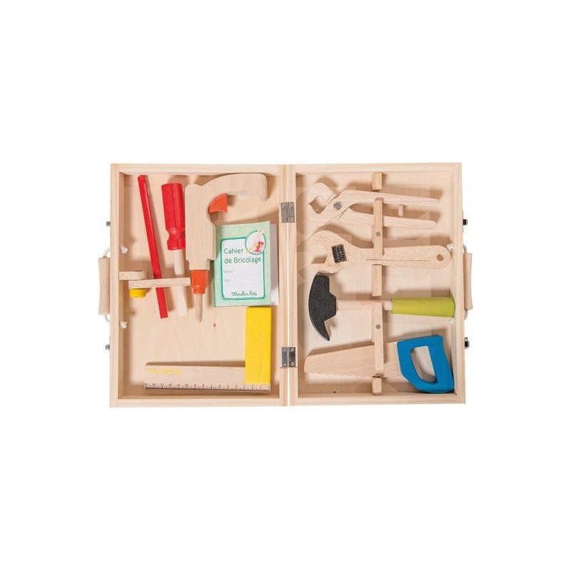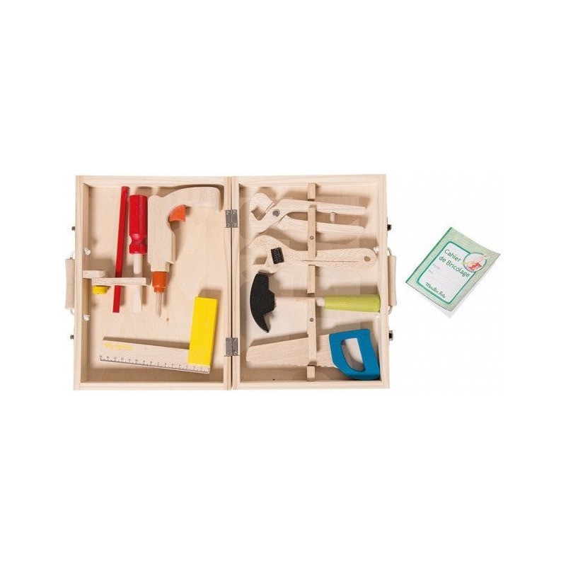 Pour faire comme les grands ! 1 crayon et 7 outils en bois, colorés, aux formes rondes, faciles à saisir par des petites mains ! Le tout, bien rangé à l'aide de scratchs et de loquets dans une belle valise en bois illustrée : A emmener partout !
