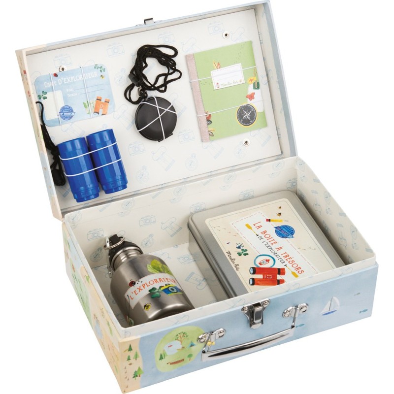 Pour jouer les explorateurs et découvrir le monde, valise illustrée style chasse au trésor contenant : une boussole de poche, une gourde, une paire de jumelles, un carnet de voyage, une boîte à trésors. Le kit indispensable pour partir à l'aventure!