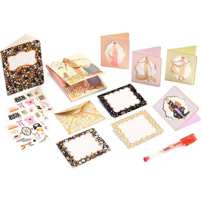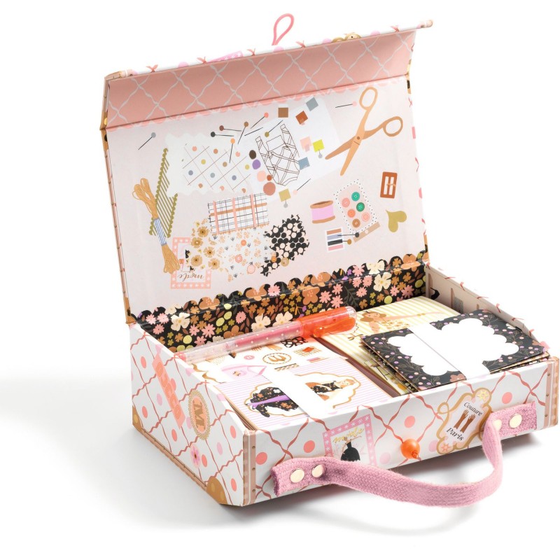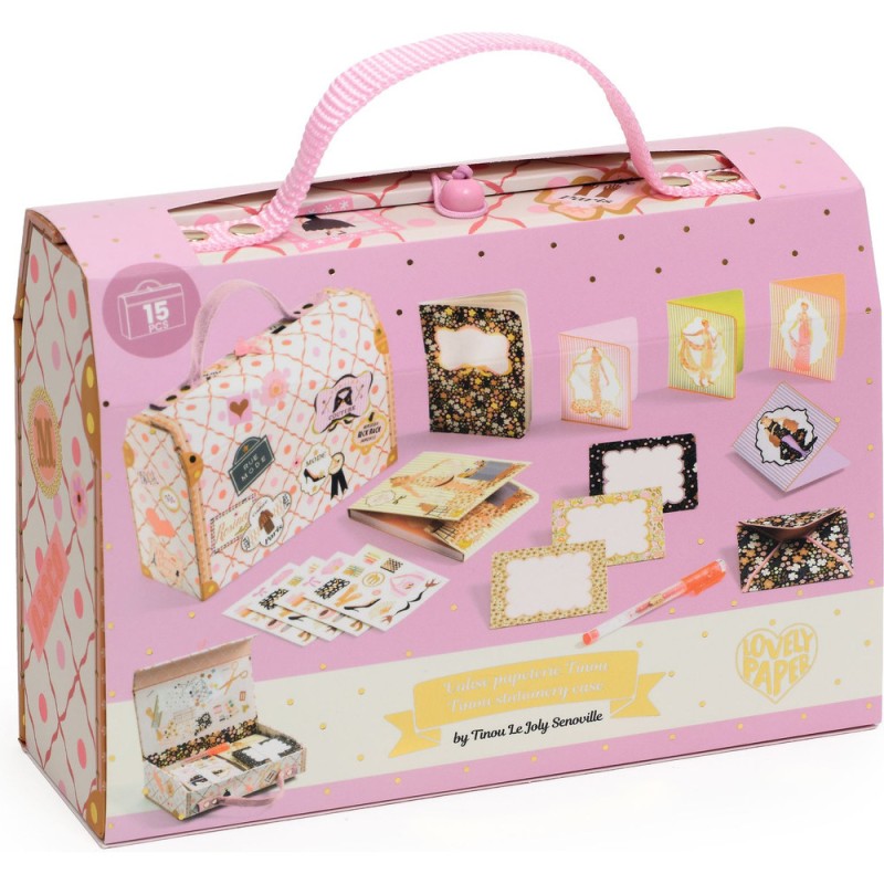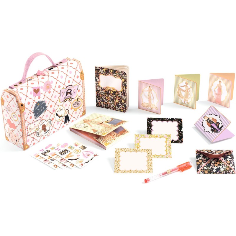 Découvrez la valise de papeterie inspirée de l'univers de la mode ! Fabriquée en carton solide, elle est dotée d’un fermoir original avec une boule en bois et un élastique. À l’intérieur, retrouvez un assortiment élégant et pratique : un cahier, un bloc-notes, un stylo gel, stickers, 4 enveloppes et 4 cartes d’invitation, parfaits pour écrire, dessiner ou envoyer des messages. Un véritable trésor pour les amateurs de papeterie raffinée !