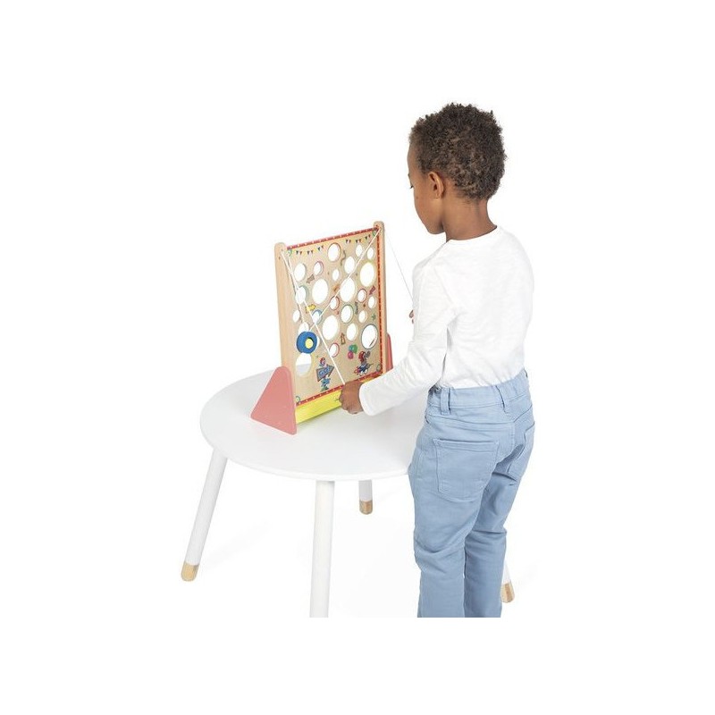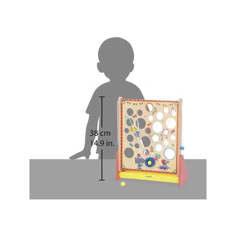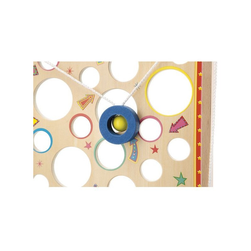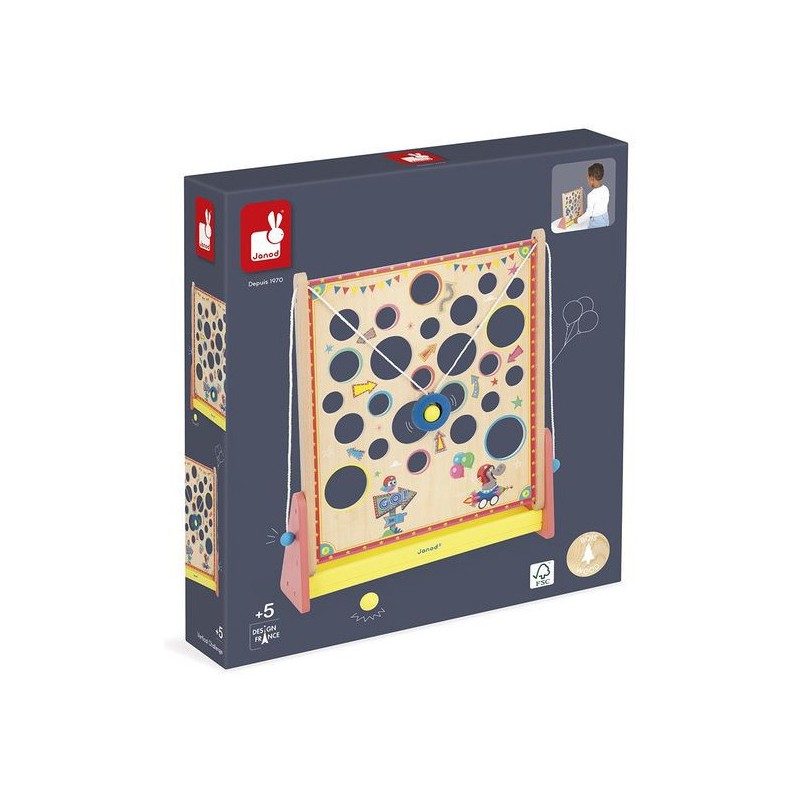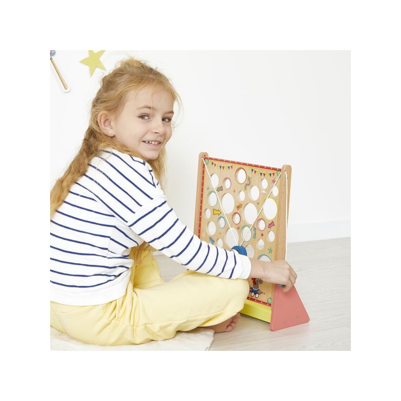 À la recherche d’un jeu d’adresse complétement délirant ? Le Vertical Challenge va susciter l’intérêt de toute la famille et solliciter la concentration, même des plus petits, dès 5 ans. Le but de ce jeu d’adresse vertical est simple : en tirant sur les cordes situées sur les côtés du support, vous faites progressivement monter la bille à l’intérieur de la plateforme pour attendre le haut du parcours … Mais attention aux trous, c’est un véritable labyrinthe ! Les enfants vont adorer se défier en famille ou entre copains dans ce jeu mêlant coordination et observation, le tout dans un univers festif : celui de la fête foraine ! Le plateau de jeu sous forme de planche à trous est décoré d’illustrations vitaminées et d’indications qu’il vaut mieux suivre … Ou pas. Vous le saurez en vous exerçant pour atteindre des sommets en un minimum de temps ou d’essais ! C’est l’occasion parfaite pour réunir petits et grands autours d’un jeu simple de compréhension, qui promet de grands moments de suspense, son lot de déceptions, mais aussi de victoires royales ! Ça change des jeux de société ! Livré avec 2 billes en bois, le Vertical Challenge est équipé d’un bac de récupération des billes recouvert de feutrine, pour atténuer le bruit de la chute. Dans son format 31,5 x 12,2 x 38,5 cm, ce jeu de kermesse est composé de bois issu de forêts gérées durablement, certifié Fsc™. Ce labyrinthe vertical fait partie de la grande collection Applepop, une collection de jeux funs et décalés inspirée de l’univers de la fête foraine. Prêts à tenter l’ascension ?