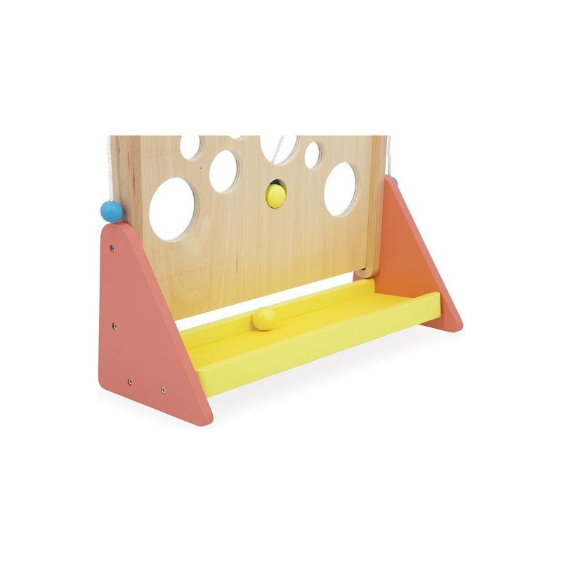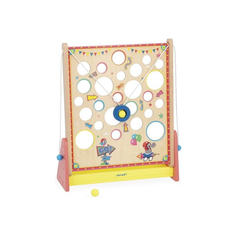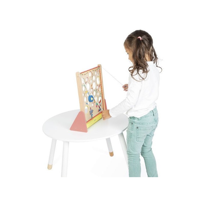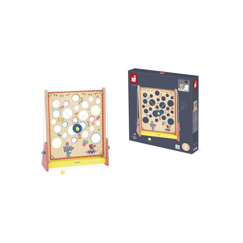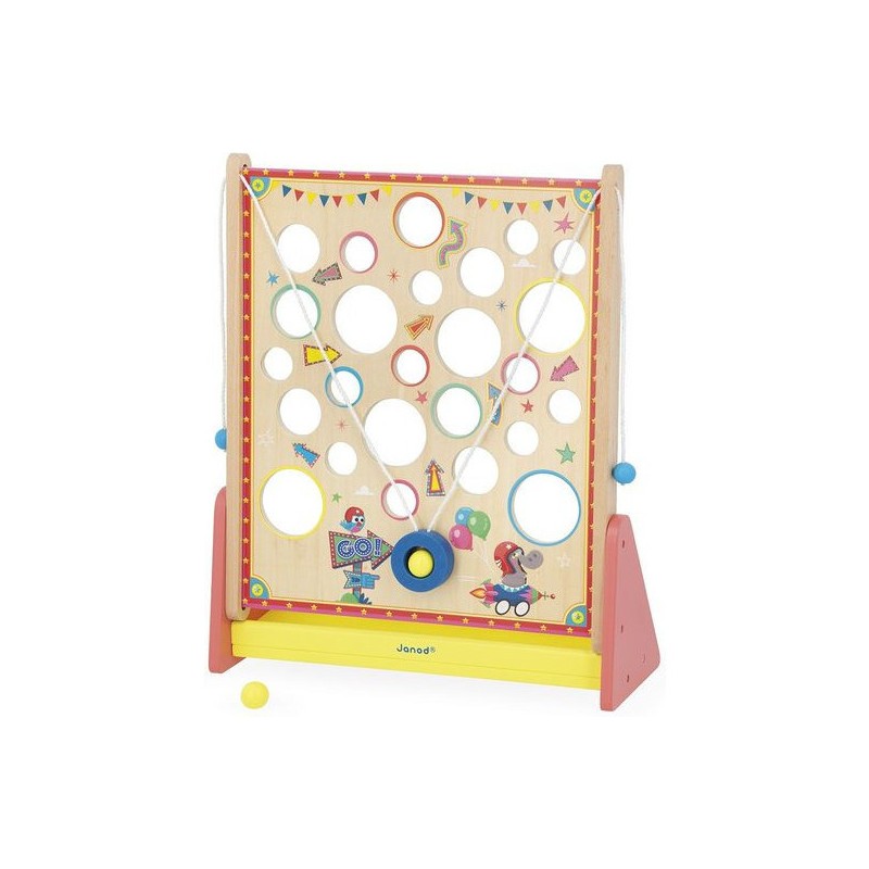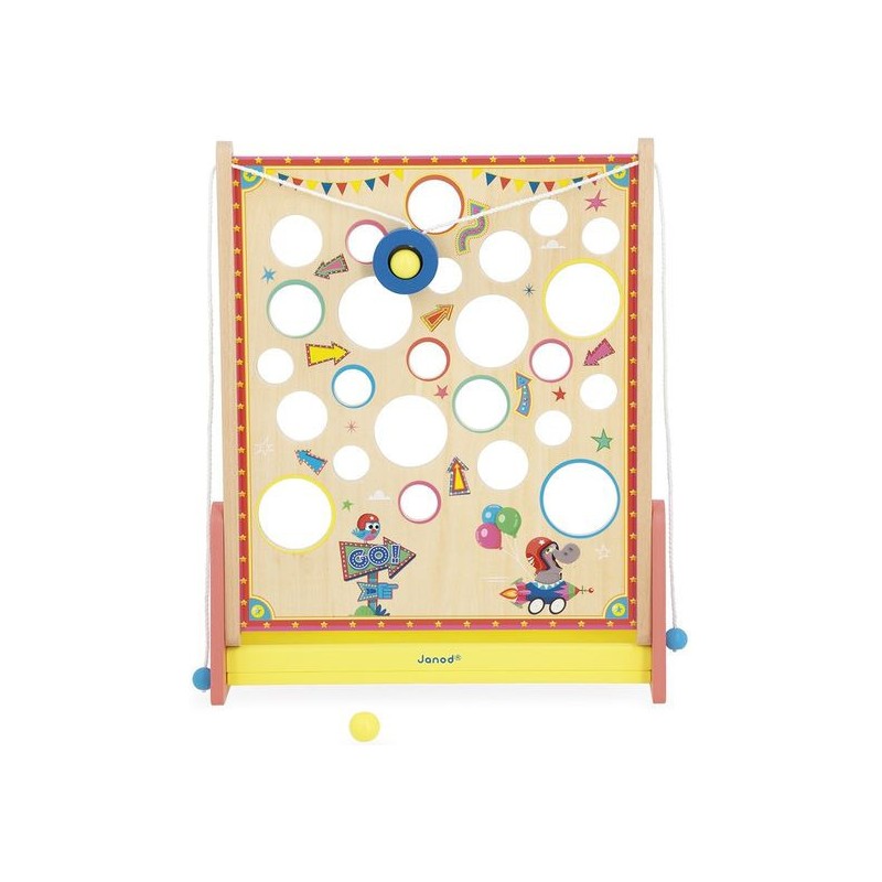 À la recherche d’un jeu d’adresse complétement délirant ? Le Vertical Challenge va susciter l’intérêt de toute la famille et solliciter la concentration, même des plus petits, dès 5 ans. Le but de ce jeu d’adresse vertical est simple : en tirant sur les cordes situées sur les côtés du support, vous faites progressivement monter la bille à l’intérieur de la plateforme pour attendre le haut du parcours … Mais attention aux trous, c’est un véritable labyrinthe ! Les enfants vont adorer se défier en famille ou entre copains dans ce jeu mêlant coordination et observation, le tout dans un univers festif : celui de la fête foraine ! Le plateau de jeu sous forme de planche à trous est décoré d’illustrations vitaminées et d’indications qu’il vaut mieux suivre … Ou pas. Vous le saurez en vous exerçant pour atteindre des sommets en un minimum de temps ou d’essais ! C’est l’occasion parfaite pour réunir petits et grands autours d’un jeu simple de compréhension, qui promet de grands moments de suspense, son lot de déceptions, mais aussi de victoires royales ! Ça change des jeux de société ! Livré avec 2 billes en bois, le Vertical Challenge est équipé d’un bac de récupération des billes recouvert de feutrine, pour atténuer le bruit de la chute. Dans son format 31,5 x 12,2 x 38,5 cm, ce jeu de kermesse est composé de bois issu de forêts gérées durablement, certifié Fsc™. Ce labyrinthe vertical fait partie de la grande collection Applepop, une collection de jeux funs et décalés inspirée de l’univers de la fête foraine. Prêts à tenter l’ascension ?