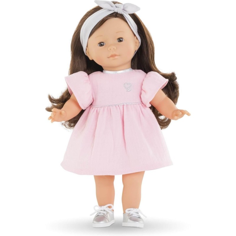 Cette tenue complète pour les poupées ma Corolle de 36 cm se compose d'une robe rose, effet gaze de coton, et d'un bandeau noeud gris clair. La robe est délicatement ornée d'un col et d'une ceinture argentés, et d'une broderie "coeur Corolle" sur le devant.