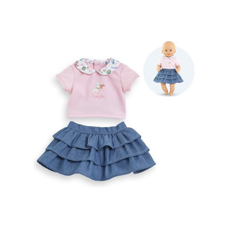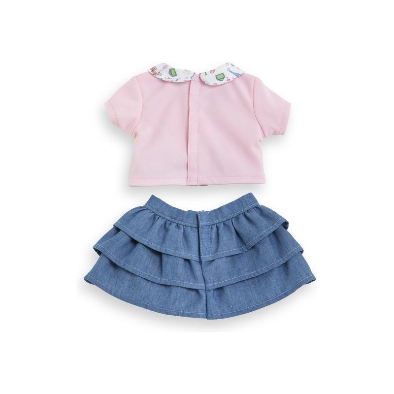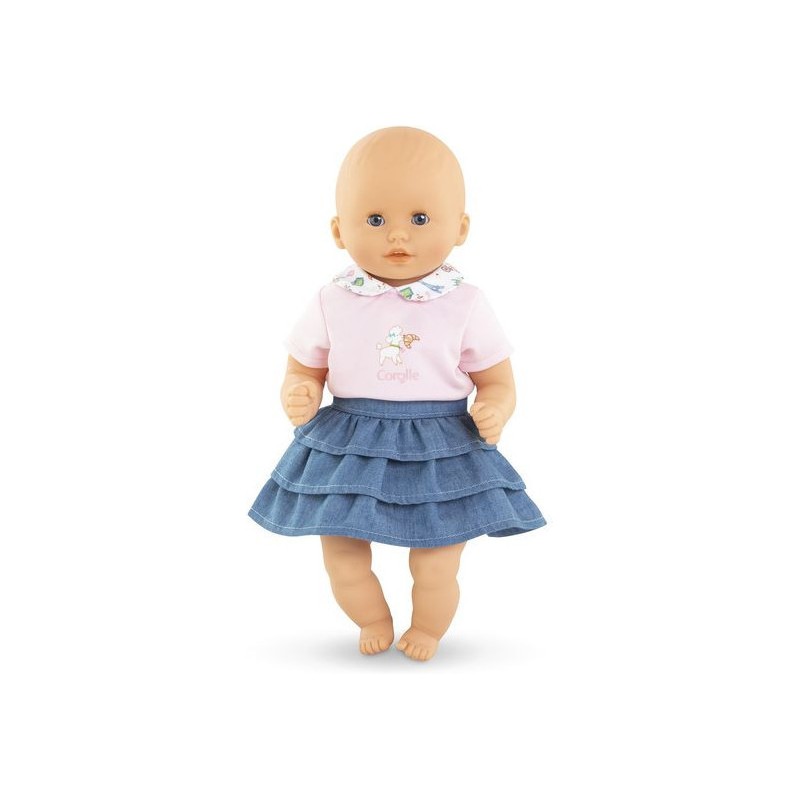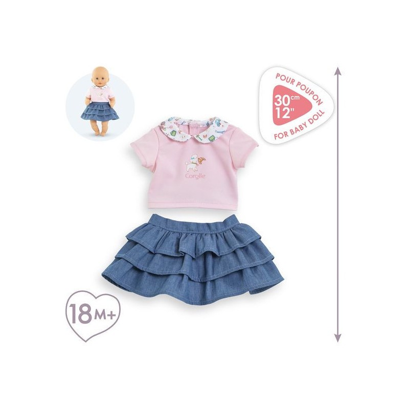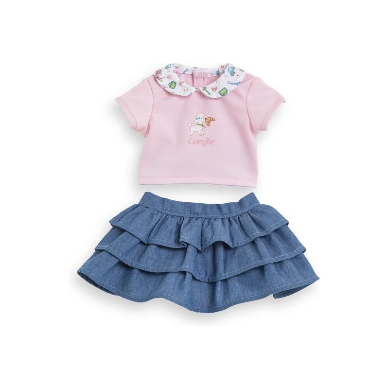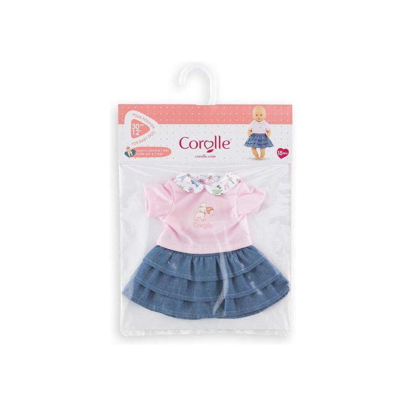 Pour une jolie tenue décontractée, l'ensemble T-Shirt et Jupe à volants Week-end à Paris est idéal pour les petits poupons de 30 cm mon premier poupon Corolle. Composé de 2 pièces distinctes, cette ensemble se compse de :