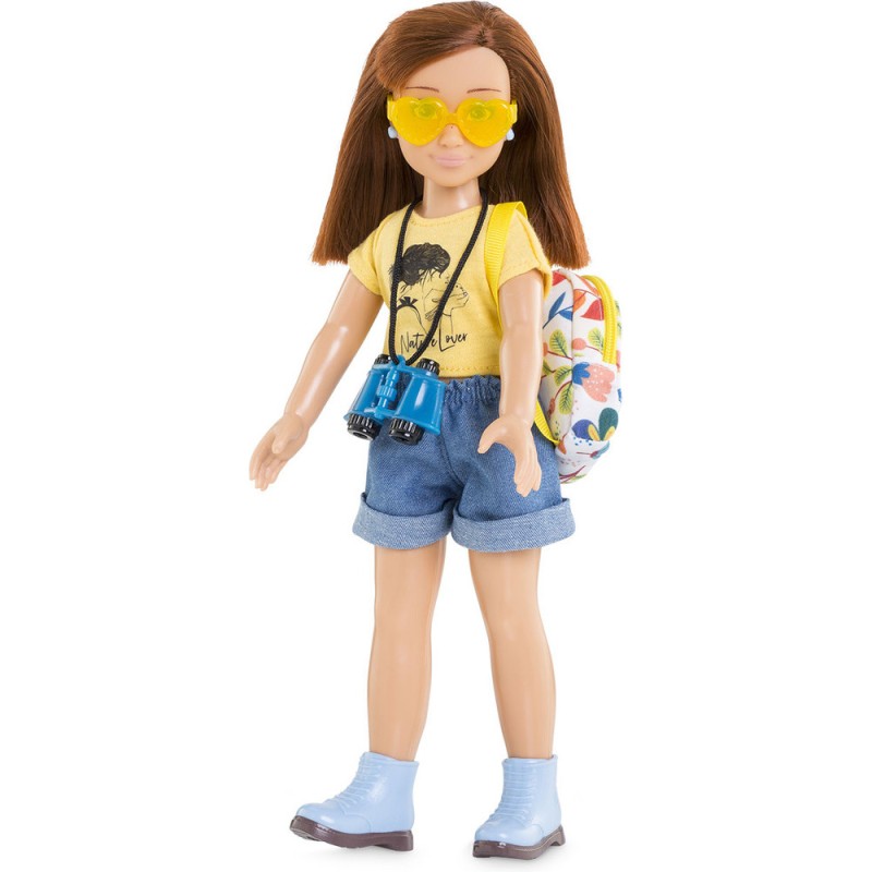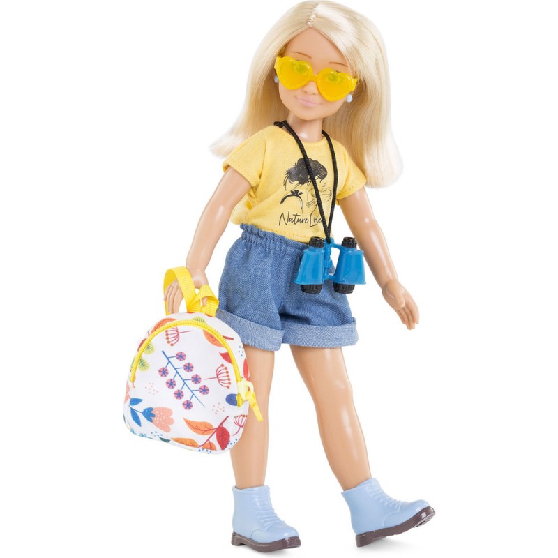 Ce coffret contient 1 paire de lunettes de soleil, 1 paire de boucles d’oreilles, 1 paire de jumelles (factice), 1 short, 1 paire de bottines amovibles et 1 sac à dos. Poupée Corolle Girls vendue séparément.