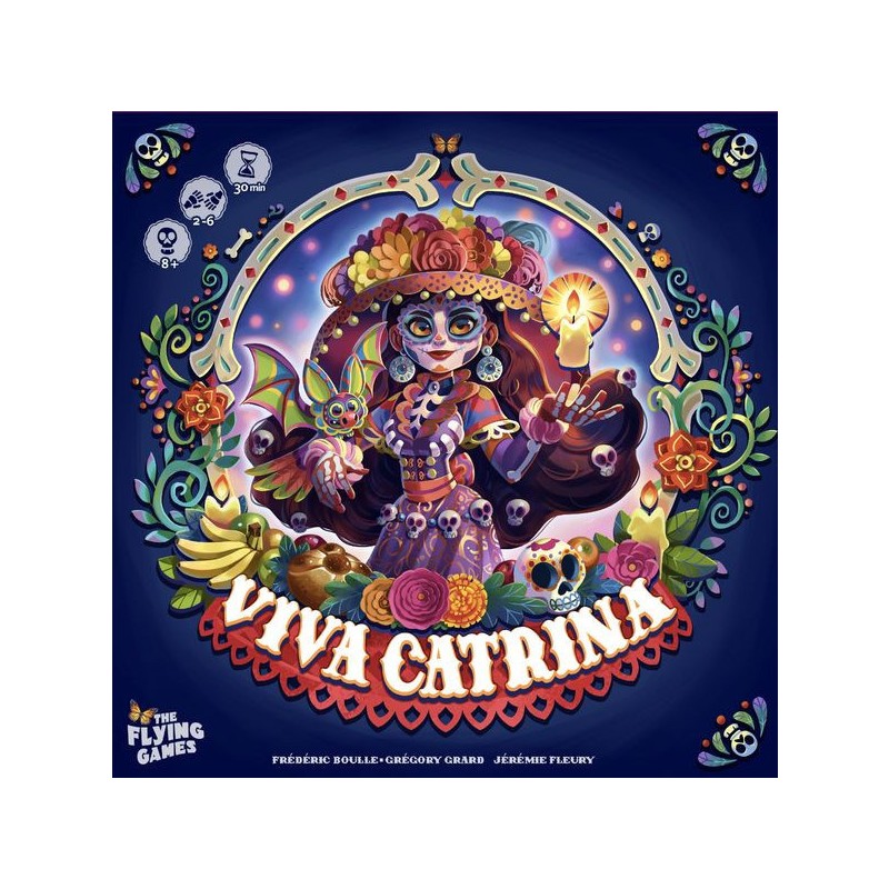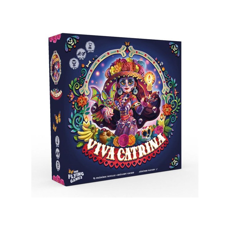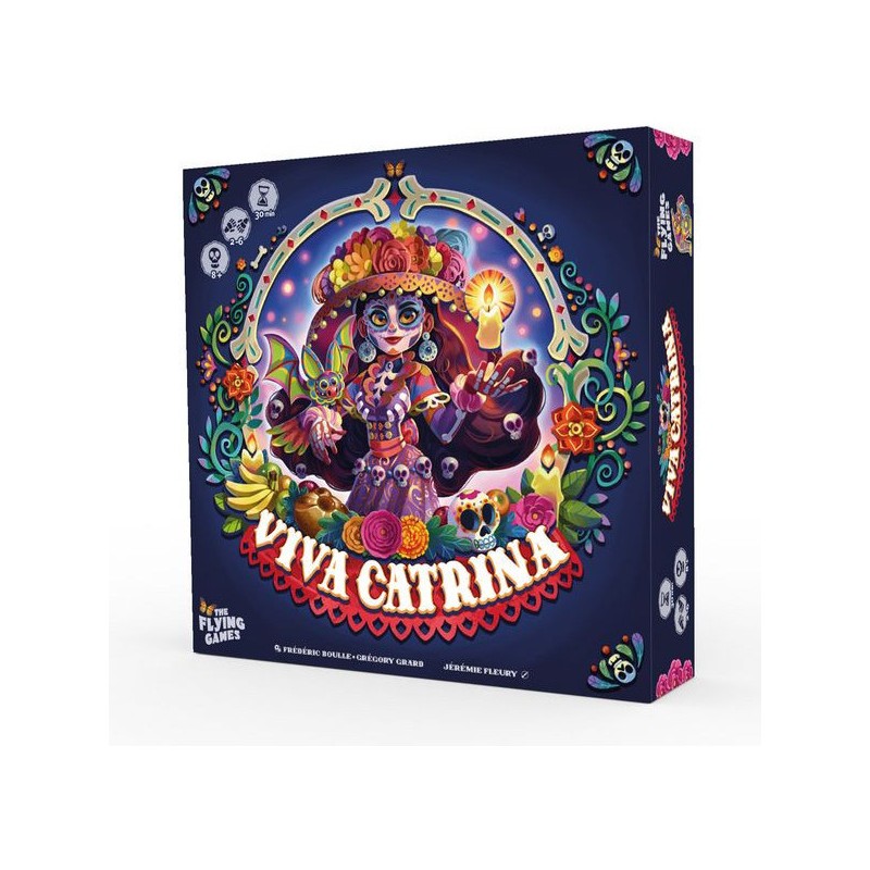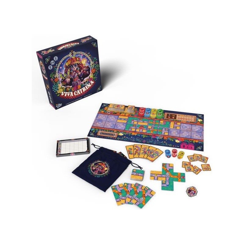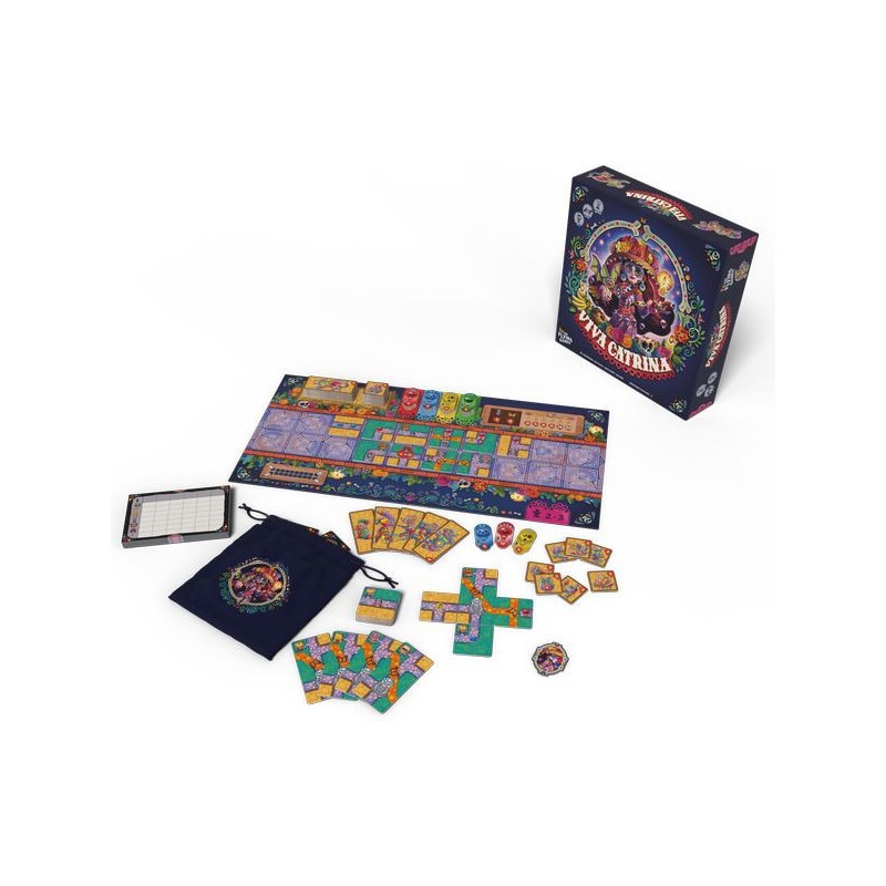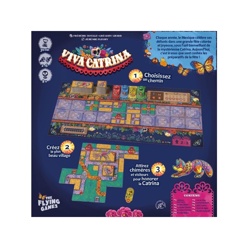 Contenu : 1 plateau recto/verso, 6 tuiles Départ, 114 tuiles Chemin, 16 tuiles Ballons, 27 tuiles Chimère, 1 pion Catrina, 1 sac en tissu, 1 Carnet de score, 1 livret de règles, 1 feuillet explicatif