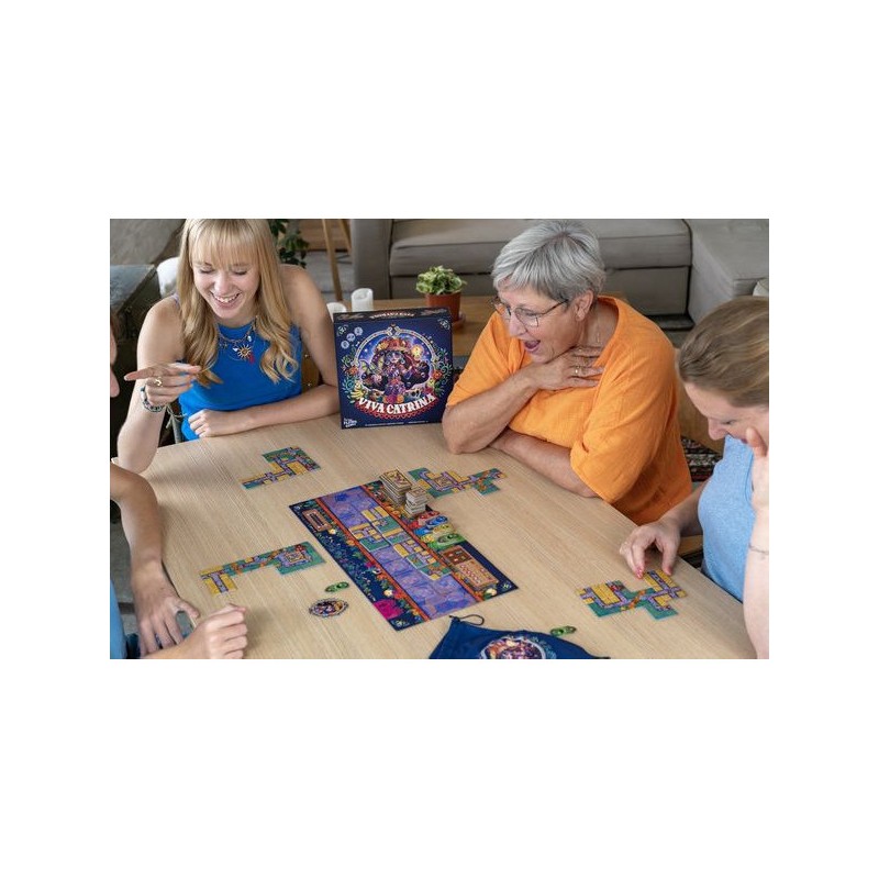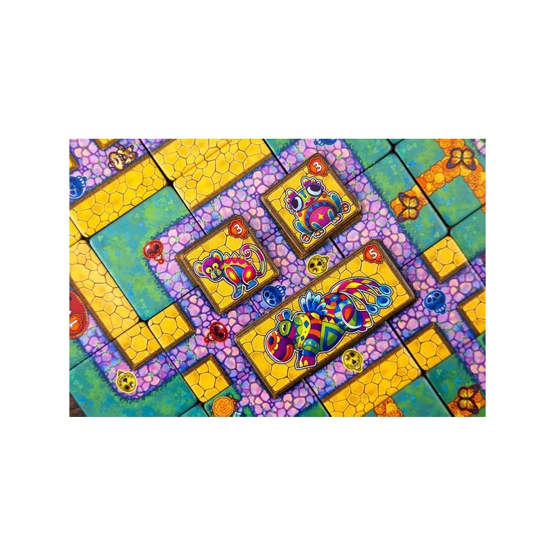 Viva Catrina propose une expérience de placement stratégique où chaque tuile posée façonne l’évolution de votre Village. À chaque tour, vous devez choisir avec soin parmi les tuiles disponibles, créer des chemins pour relier papillons et visiteurs, ériger des socles pour attirer des chimères, et organiser des envolées de ballons pour maximiser vos points. La construction optimisée d'un réseau connecté est essentielle : une mauvaise pose pourrait couper vos chemins ou rendre vos objectifs inatteignables. L’interaction indirecte, via la course aux chimères ou aux tuiles ballons, ajoute une tension légère mais constante. Le rythme est fluide et la satisfaction vient de voir son Village grandir et s’animer tout au long de la partie.