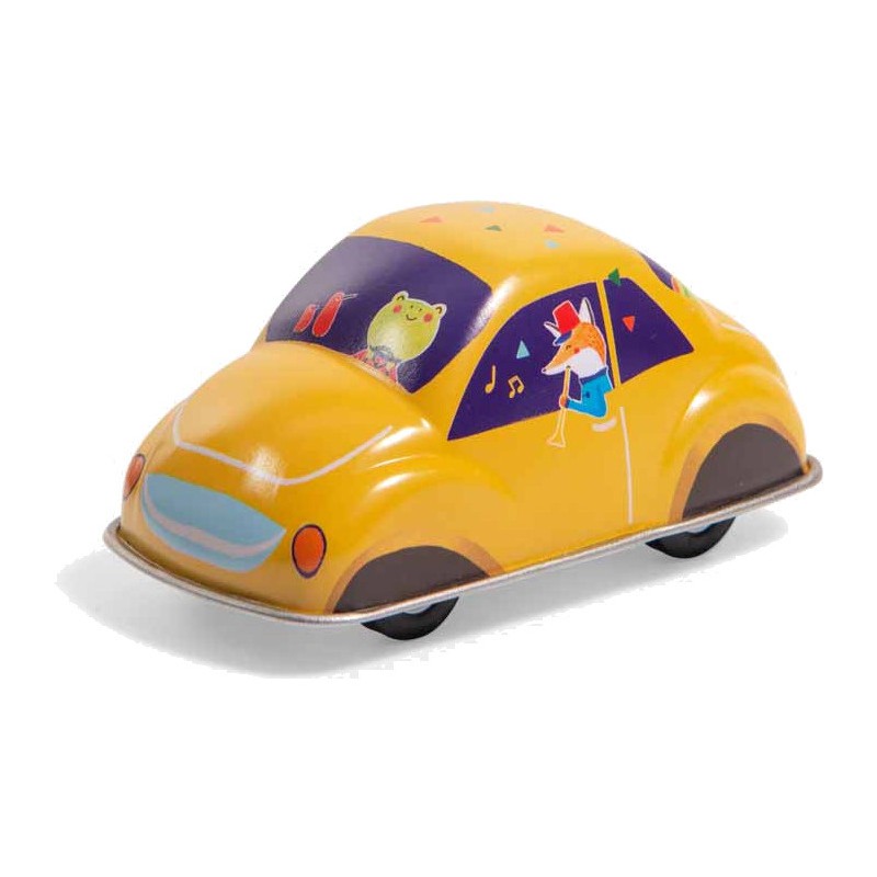 Petite voiture à friction en métal jaune, illustrée d'une fanfare en route pour un concert ! Frottez la voiture d'avant en arrière en exerçant une légère pression dessus puis lâchez… la voilà qui démarre à toute vitesse !