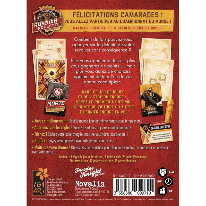 Bienvenue au Championnat du monde de roulette russe ! Un jeu de bluff et de stop ou encore palpitant, rempli de suspens et de coups fourrés. Chaque joueur contrôle un capitaine et ses trois acolytes. Mélangez vos 6 cartes « clic » avec une carte « Bang » et choisissez-en une que vous planquez dans votre manche. Secrètement, indiquez le nombre de fois où vous appuyez sur la gâchette. Une fois les paris révélés, tous en même temps, les joueurs retournent la première carte, si c’est un clic, continuez. Si c’est un bang un de vos sbires ou vous êtes mort. Les joueurs arrivant vivant à la fin de leur pari remportent des points de victoire, plus vous avez pris de risques, plus vous en gagnez. Mais voilà, aviez-vous planqué la carte Bang ? Dans ce cas, forcément vous pouvez miser gros, sauf si vous adversaires vous découvrent et que le juge vous exécute ! Tout cela est bouleversé par des cartes Action pouvant avoir des effets imprévus : augmentez de 1 le pari d’un adversaire, braquez votre flingue sur la tête d’un voisin, regardez vos premières cartes, etc. Des parties survoltées et tendues où les éclats de rire remplacent la détonation des flingues.