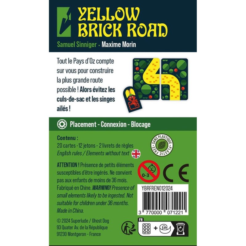 Le Pays d'Oz a besoin de vous, construisez la plus grande route et évitez les Singes Ailés ! Yellow Brick Road - Feux Follets est un jeu de société de pose de tuiles pour 2 joueurs, dès 8 ans pour des parties d'environ 20 minutes. Dans ce jeu, 2 joueurs tentent de construire la plus grande route en posant des cartes sur une grille de 3x3. En retournant des Singes Volants sur votre zone de jeu, l'adversaire vous empêche de placer une carte sur la ligne/colonne de ce Singe.